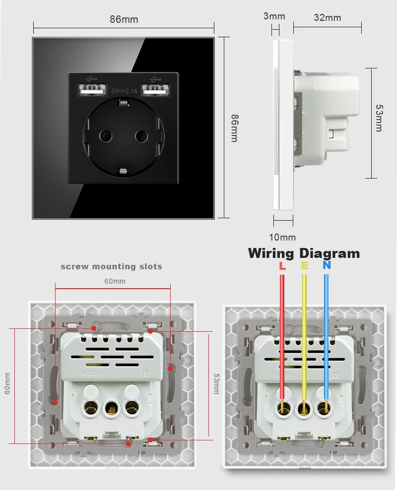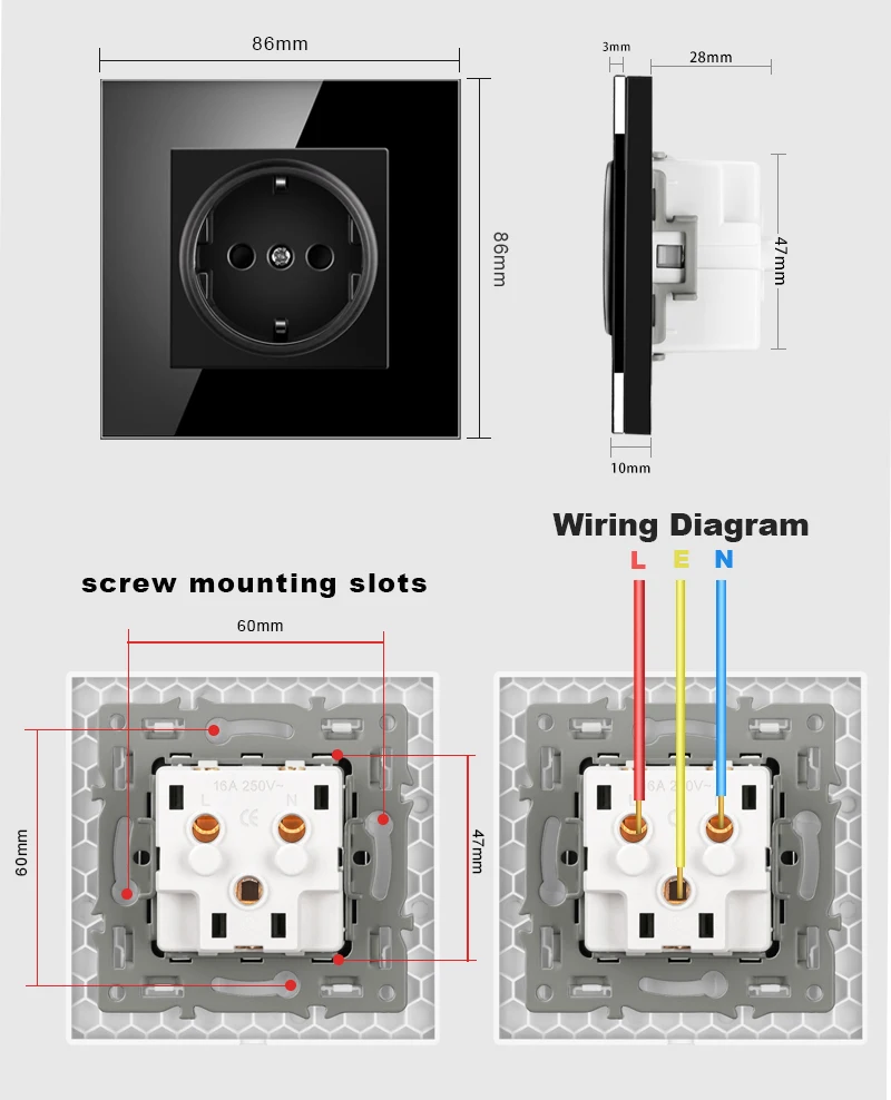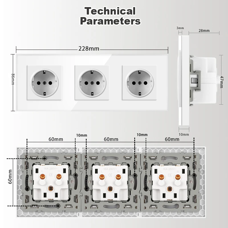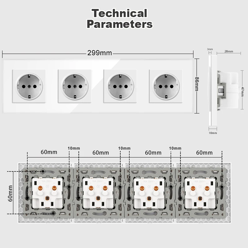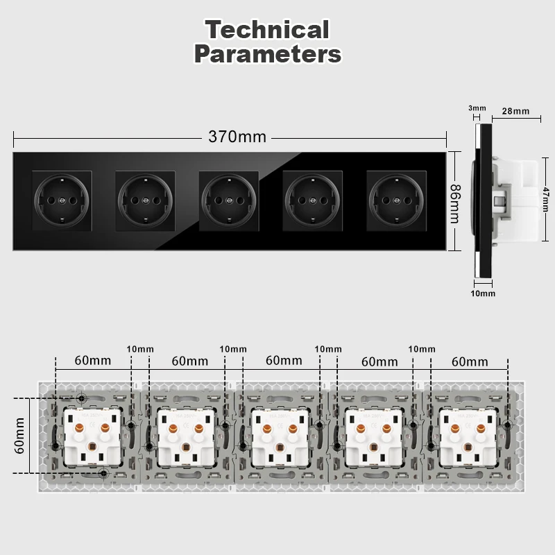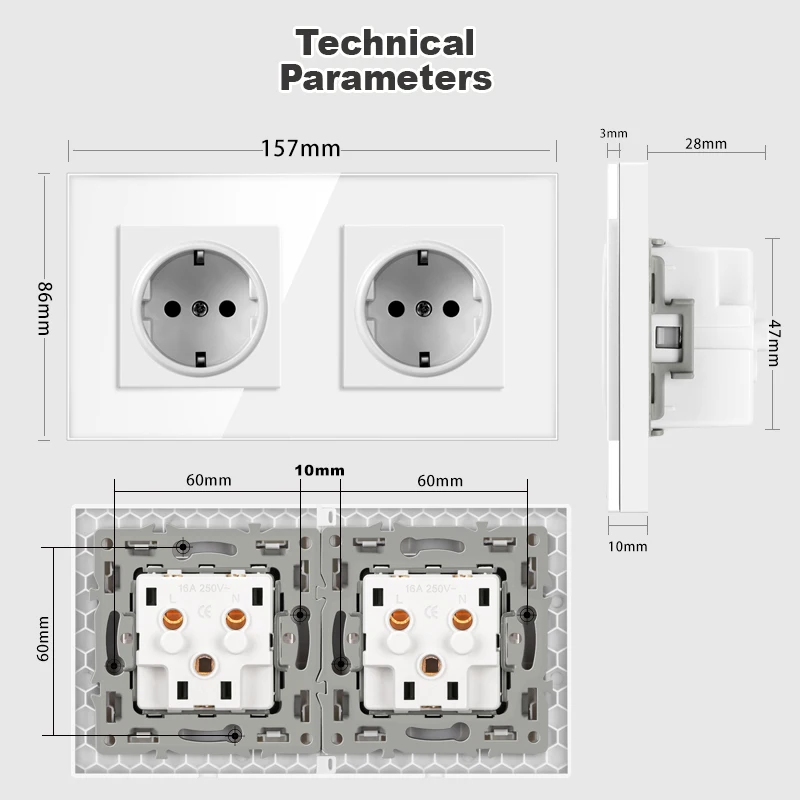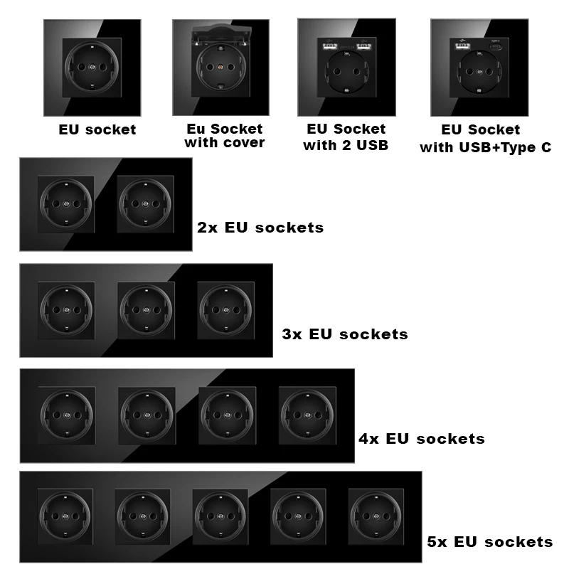 JHJCH ผนังแก้วคริสตัลแผงปลั๊กไฟถูกต่อสายดิน, 16a ปลั๊กไฟมาตรฐานยุโรป 86 มม. * 86 มม.
