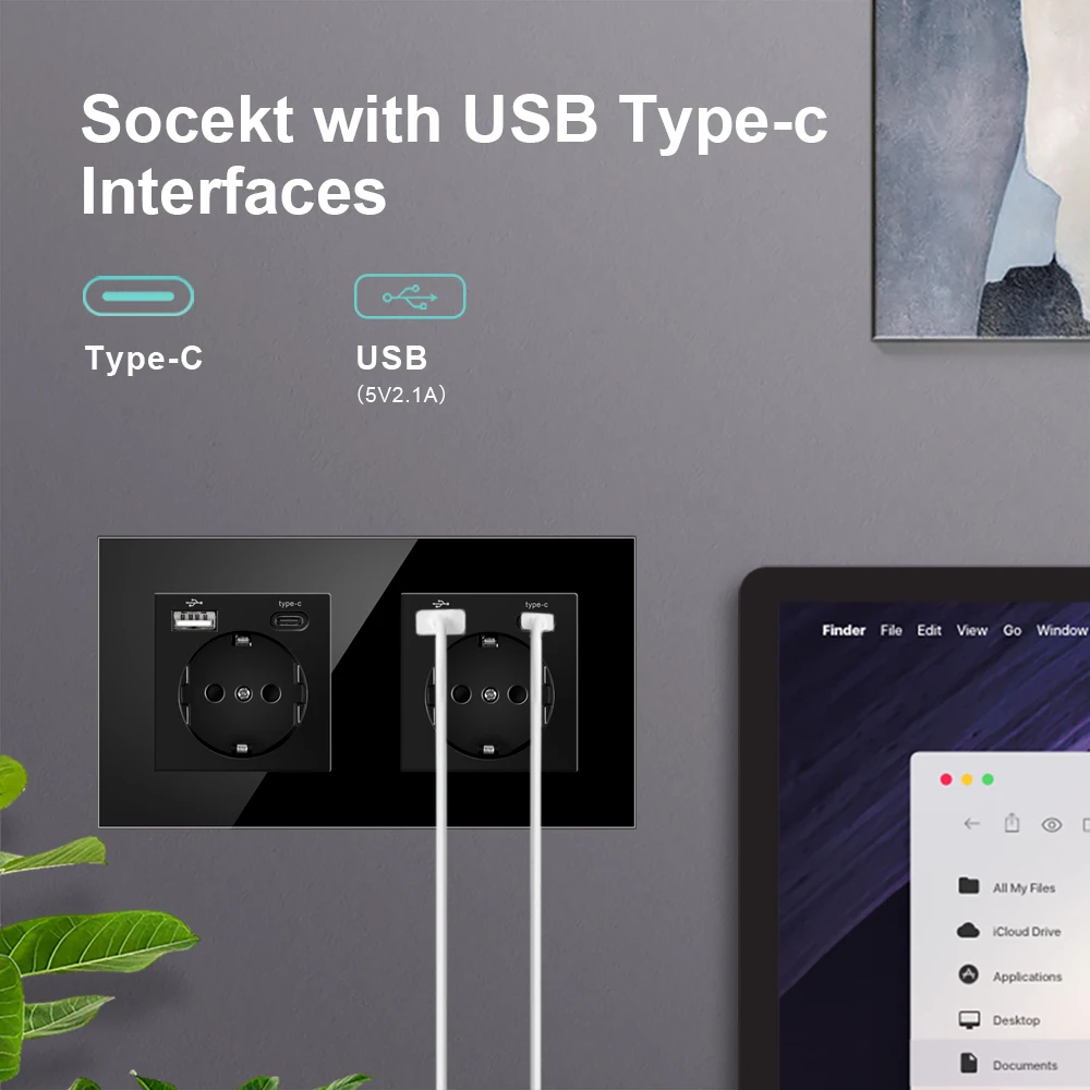S6 แก้วสีดําซ็อกเก็ตและสวิทช์ 220V DIY ไฟฟ้าปลั๊กปุ่มสวิทช์ไฟ Outlet ซ็อกเก็ตในตัว DIY Wallpad