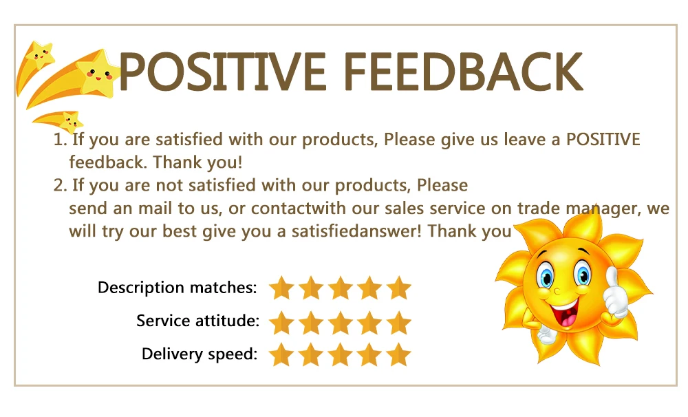 2. If you are satisfied with our items, please leave us positive feedback. We will leave a positive feedback to you later.