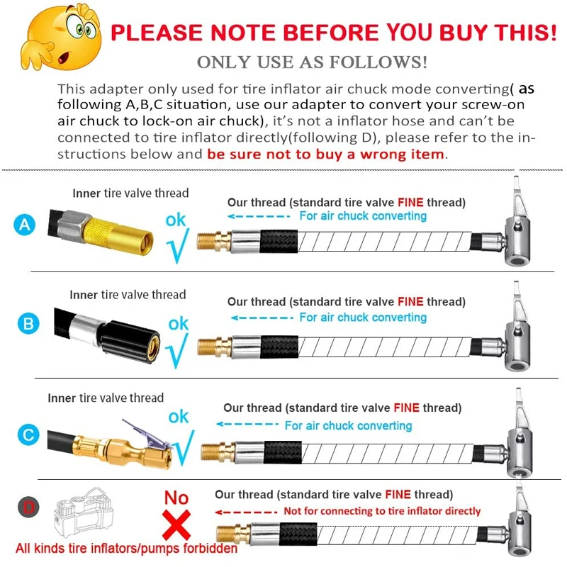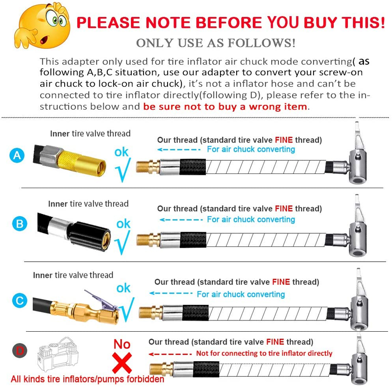 * อะแดปเตอร์ท่อยางลมพรีเมี่ยมออกแบบมาสำหรับแปลงท่อเติมลมยางให้เปลี่ยนการเชื่อมต่อแบบบิดเพื่อล็อกการเชื่อมต่อได้อย่างง่ายดาย ปลายสกรูอะแดปเตอร์ลงบนท่อเติมลมเดิมกดยึดหัวอะแดปเตอร์เข้ากับวาล์วลมยางให้เริ่มเติมลมได้อย่างรวดเร็วและไม่มีอัตราเงินเฟ้อรั่ว