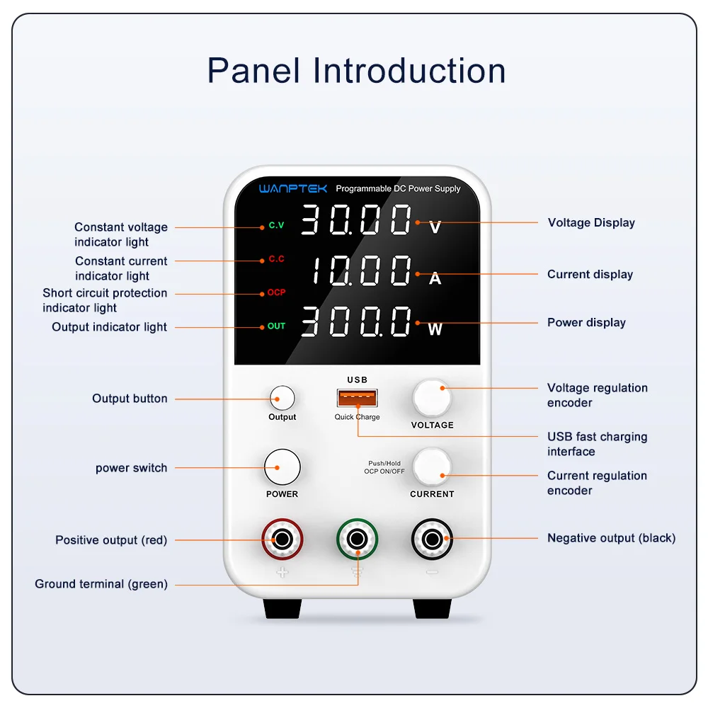 ผลิตภัณฑ์ซีรีส์ใหม่ของ Wanptekรุ่นนี้เป็นแหล่งจ่ายไฟ DC แบบสวิตชิ่งขนาดเล็กแรงดันเอาท์พุตและกระแสสามารถควบคุมและปรับได้โดยตัวต้านทานแบบแปรผันตามลำดับ จึงให้ความสะดวกและแม่นยำในการปรับแรงดันและกระแสมากขึ้นแผงควบคุมนี้ยังมาพร้อมกับหน้าจอแสดงผลแบบดิจิทัลที่มีความแม่นยำสูงในรูปแบบสองหรือสามหน้าต่าง สำหรับแสดงแรงดันไฟฟ้า กระแสไฟฟ้า และกำลังไฟฟ้า ช่วยให้ผู้ใช้งานสามารถตรวจสอบสถานะการใช้งานปัจจุบันและพารามิเตอร์ต่าง ๆ ของเครื่องได้อย่างชัดเจนและเข้าใจง่าย
