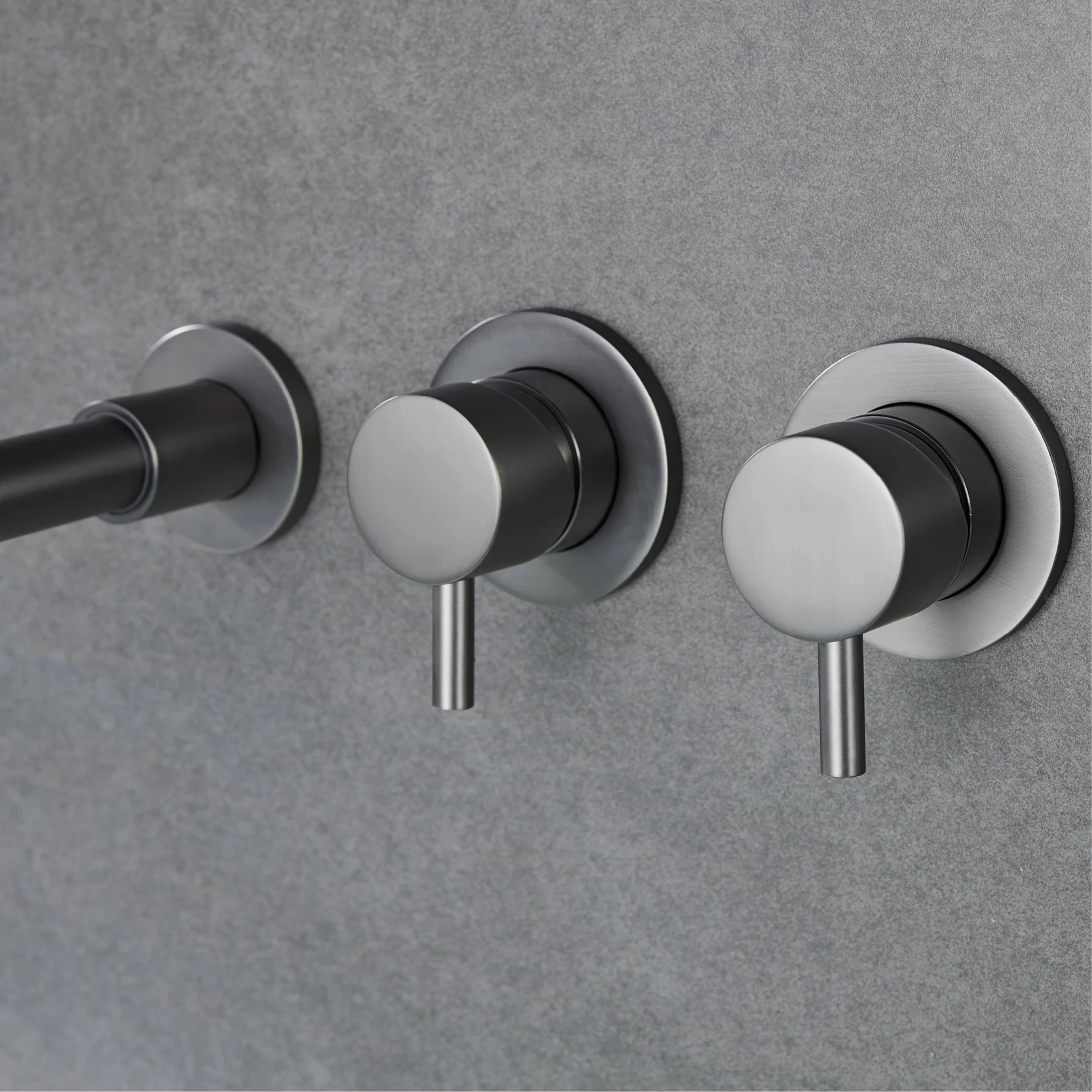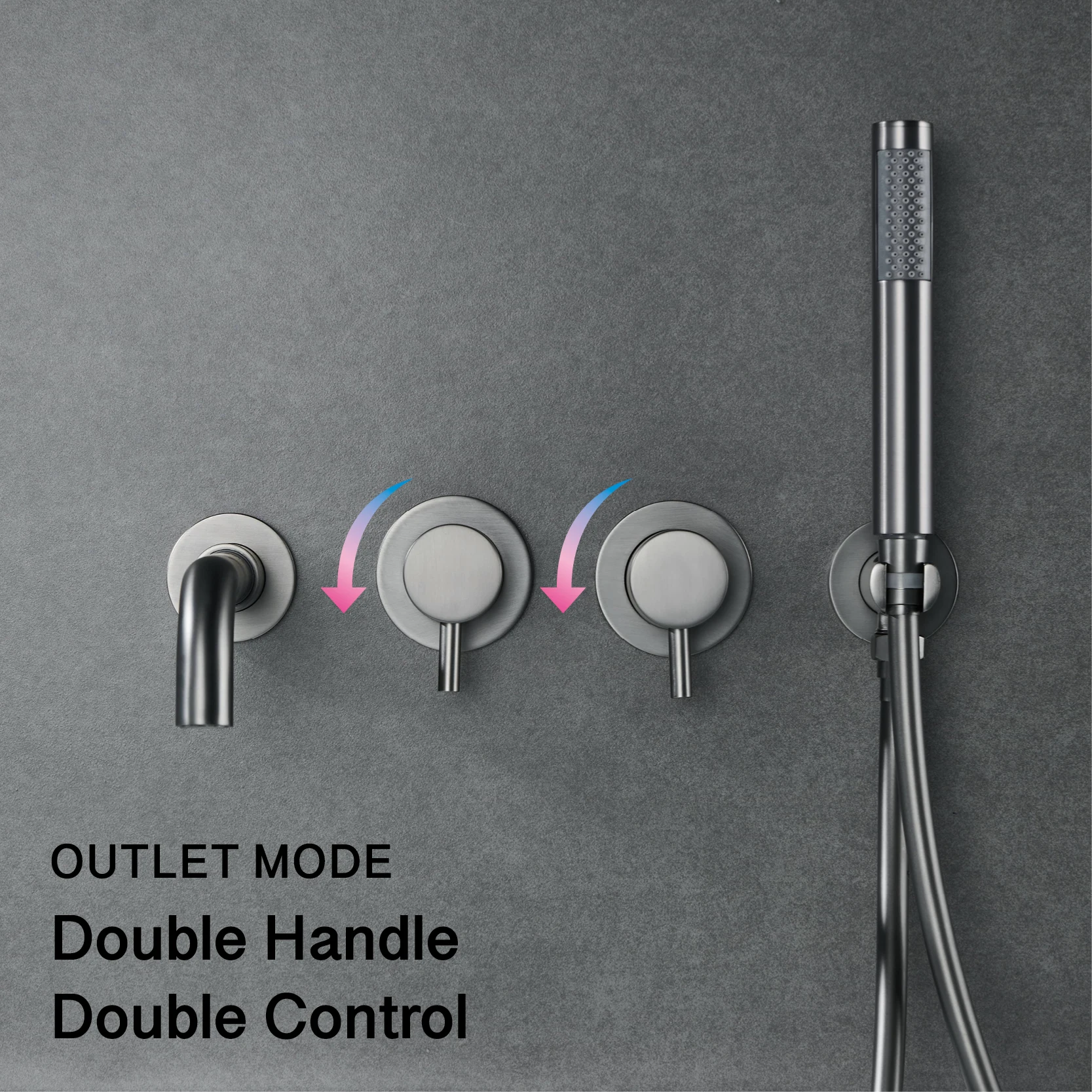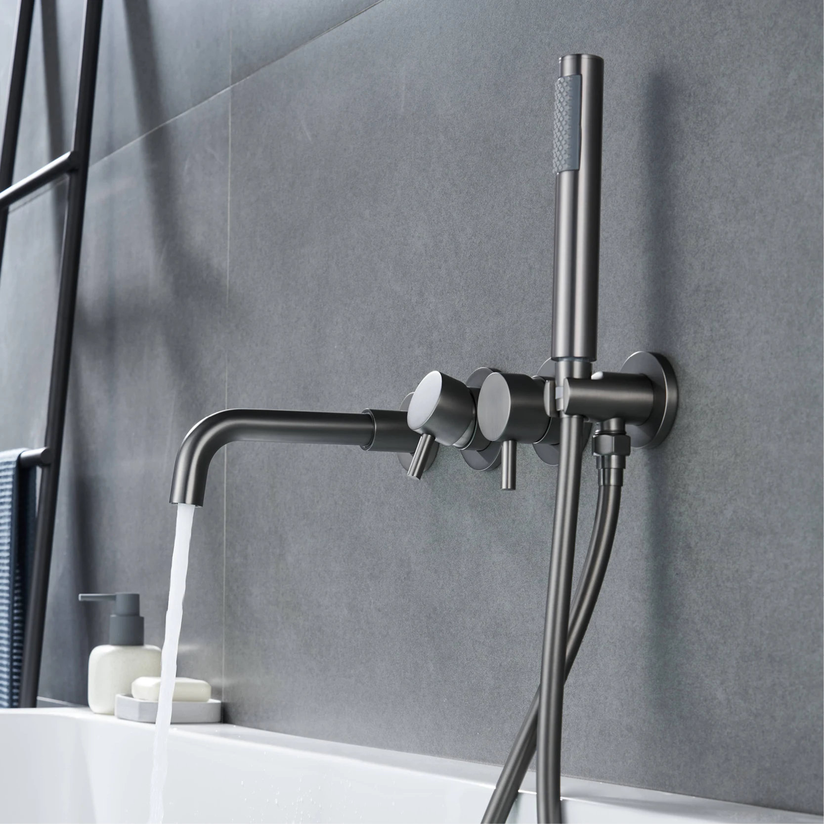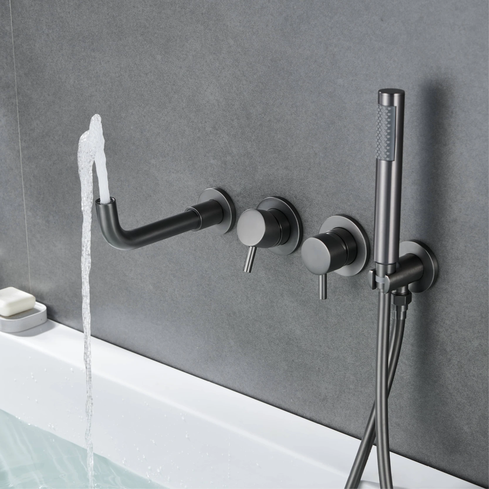 ก๊อกน้ําในห้องน้ําทองเหลืองสีเทาปืนหรูหราเรียบง่ายพร้อมการออกแบบผนังและเครื่องผสมอ่างอาบน้ําแบบด้ามจับคู่สําหรับน้ําร้อนและน้ําเย็น