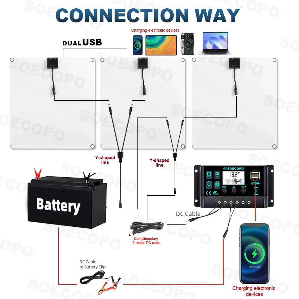 ชุดแผงโซลาร์เซลล์พกพา SOECOPO 600W พร้อมคอนโทรลเลอร์ 100A ฟรี แผงโซลาร์เซลล์ 2*300W กระแสไฟ DC 18V พอร์ต USB 5V สำหรับใช้ในแคมป์ปิ้งและชาร์จโทรศัพท์