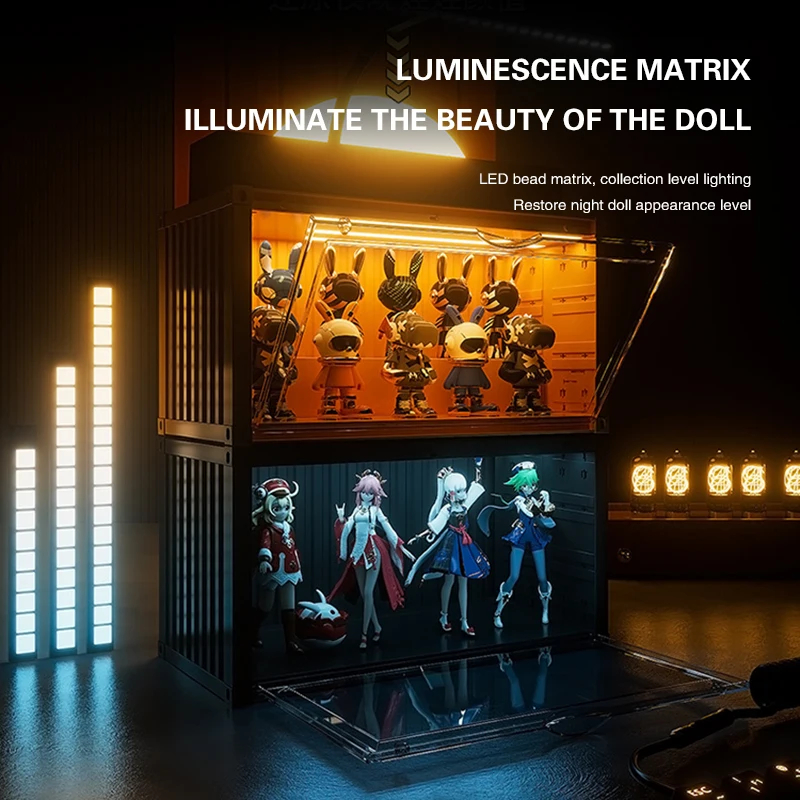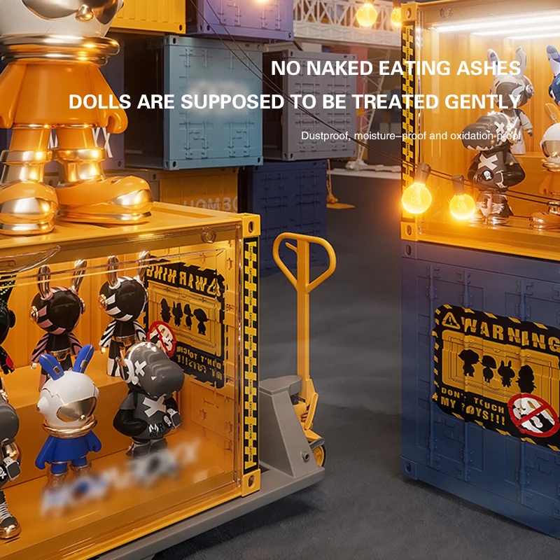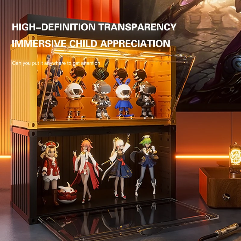 ตู้เก็บของเล่นพร้อมไฟ LED ห้องนอนโมเดลตุ๊กตาใสกันฝุ่นตู้เก็บของเล่นชั้นวางจัดระเบียบ