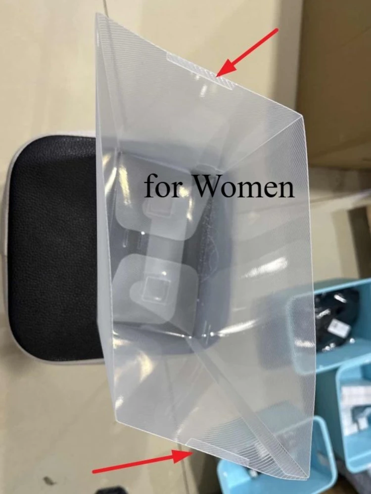 4.กล่องรองเท้าผู้ชายมีกระดุม 3 อันให้พับ แต่กล่องรองเท้าของผู้หญิงมีกระดุมเพียง 2 อันให้พับ ดังที่ระบุโดยลูกศรในรูปต่อไปนี้