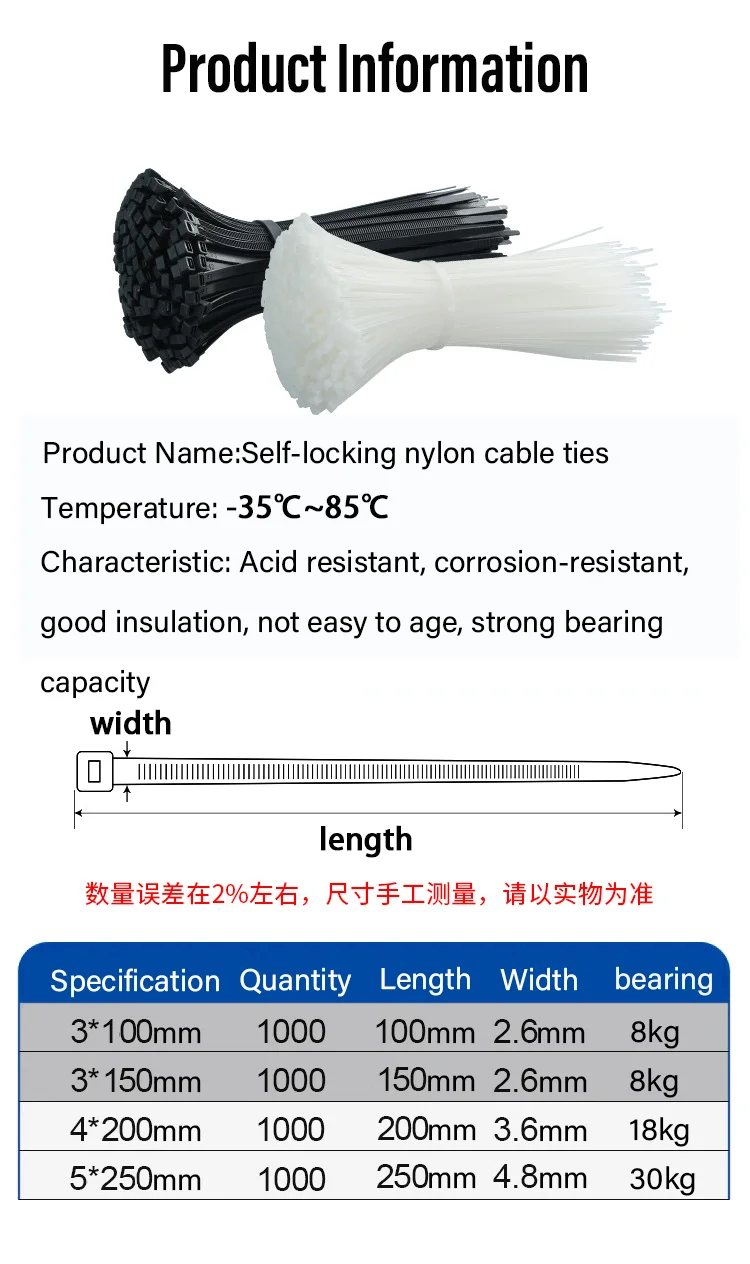 สายรัดเคเบิลไนลอนแบบล็อคอัตโนมัติ 1000/100 ชิ้น สายรัดปรับได้ ตัวล็อคพลาสติก ทนความร้อน