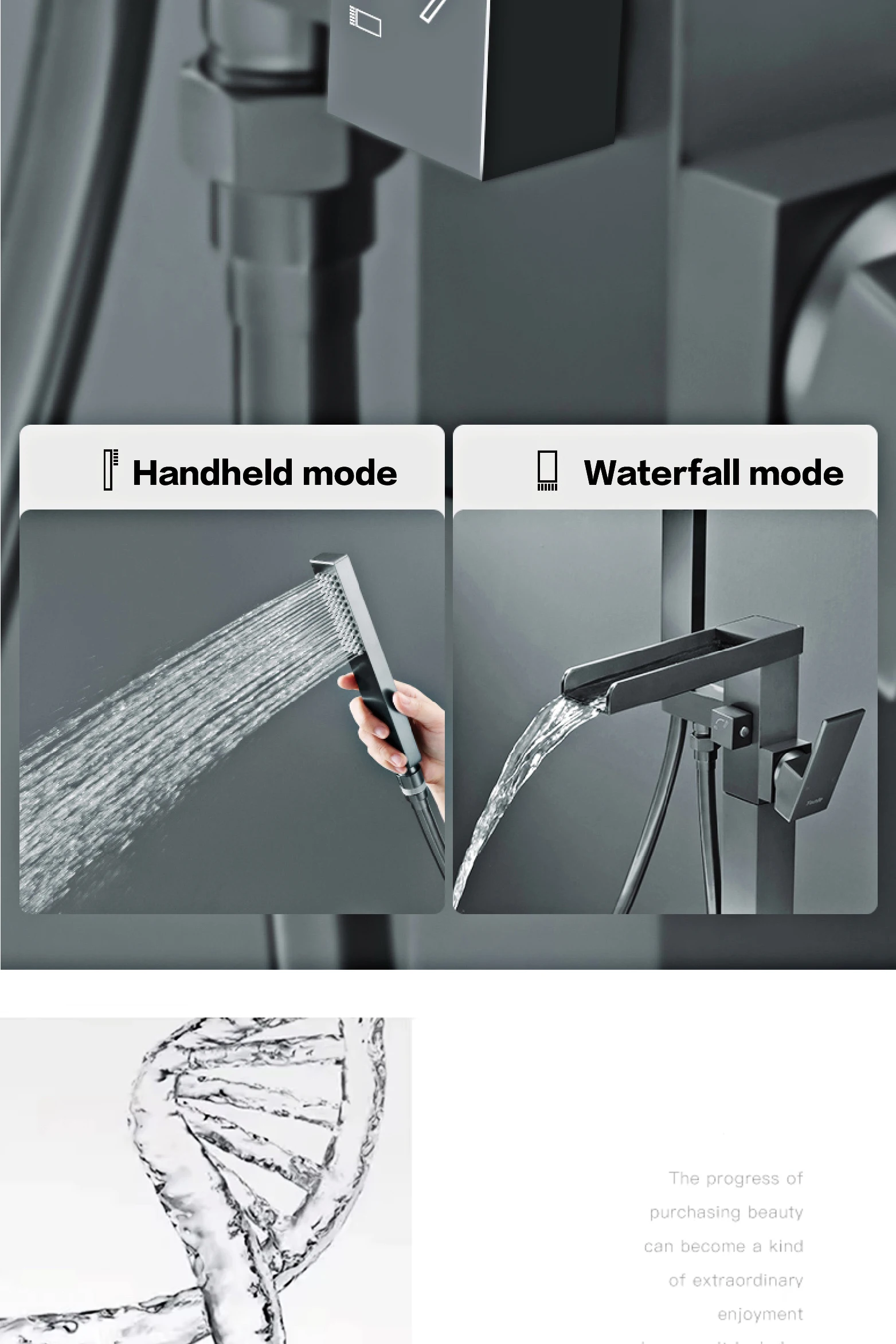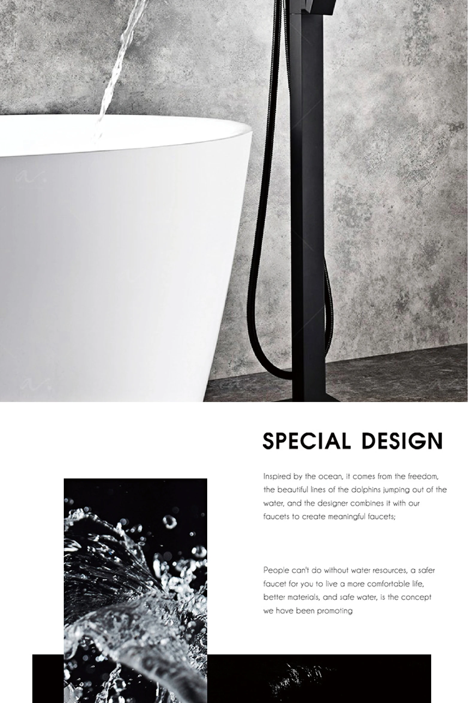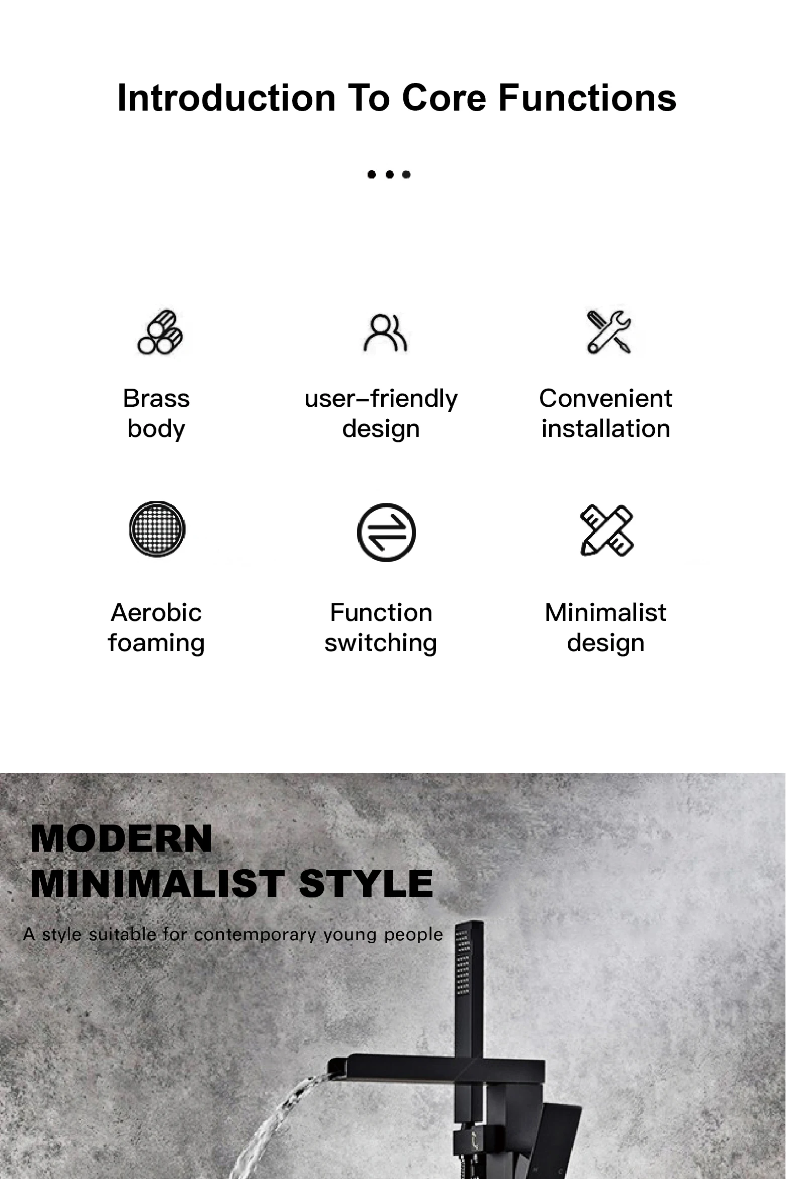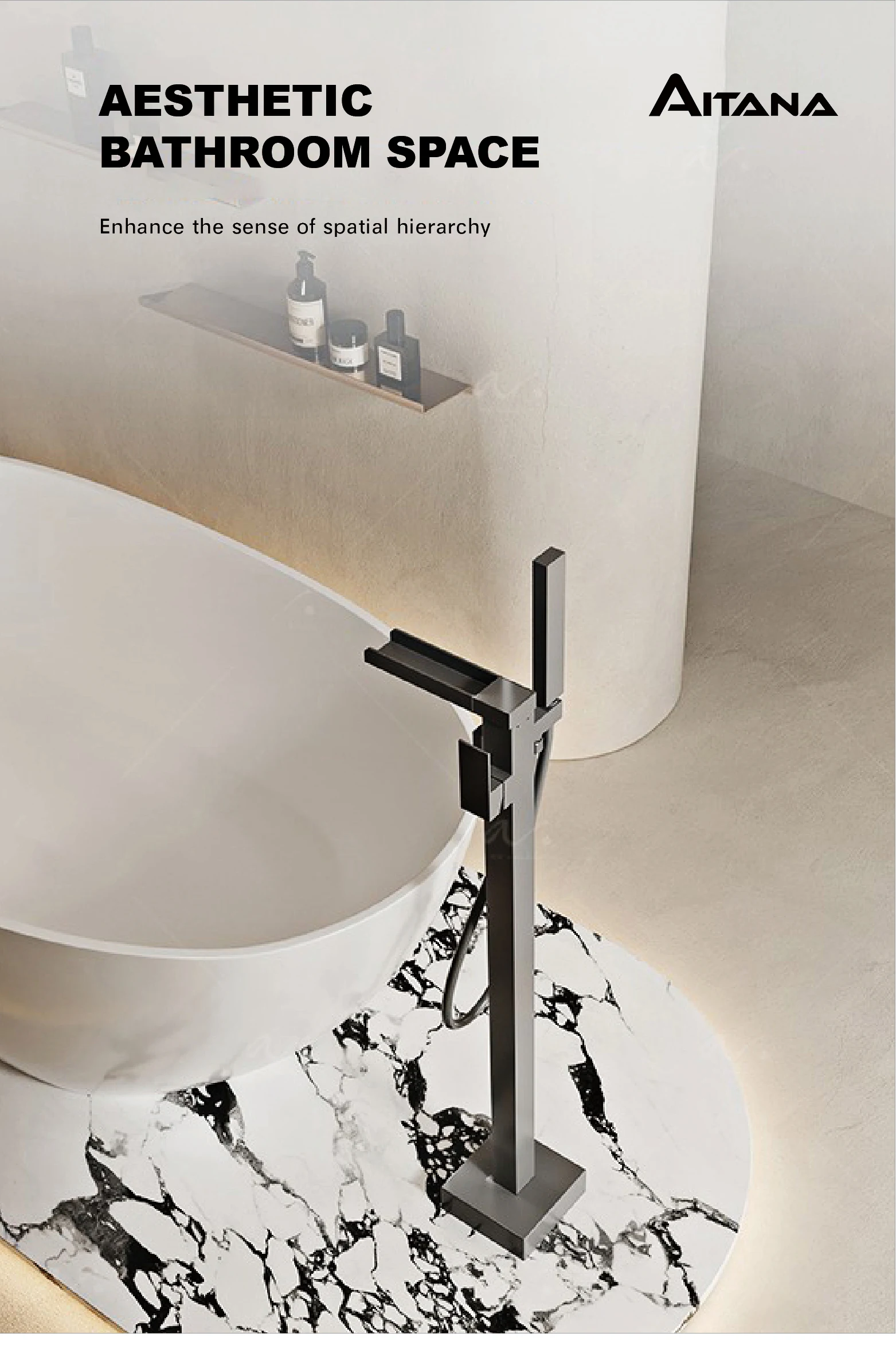 AITANA ก๊อกน้ําห้องน้ําตั้งพื้นทองเหลืองสีดําหรูหราพร้อมดีไซน์ช่องน้ําตก เครื่องผสมอ่างอาบน้ําร้อนและเย็น