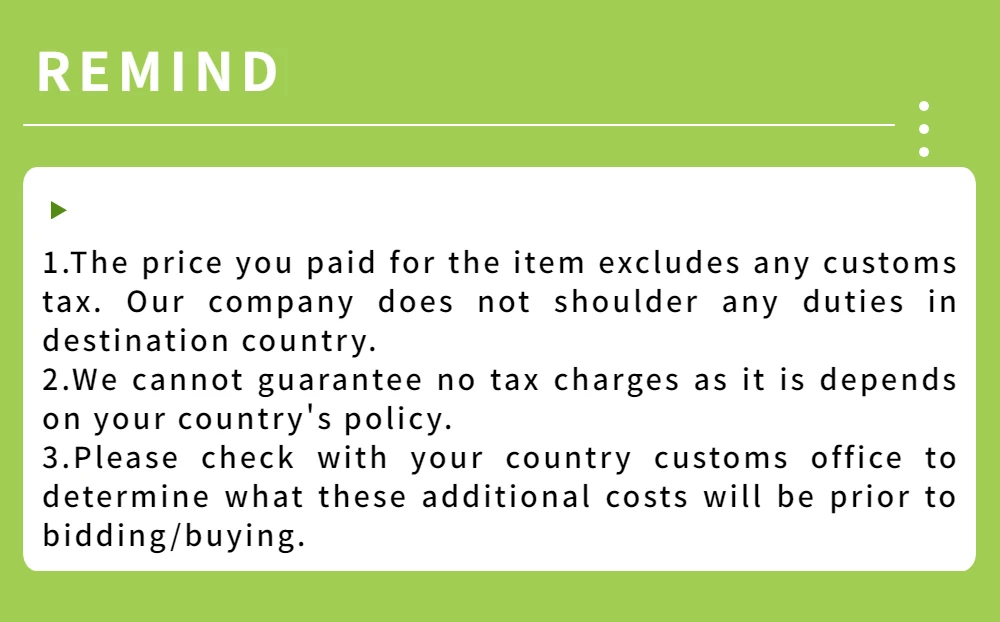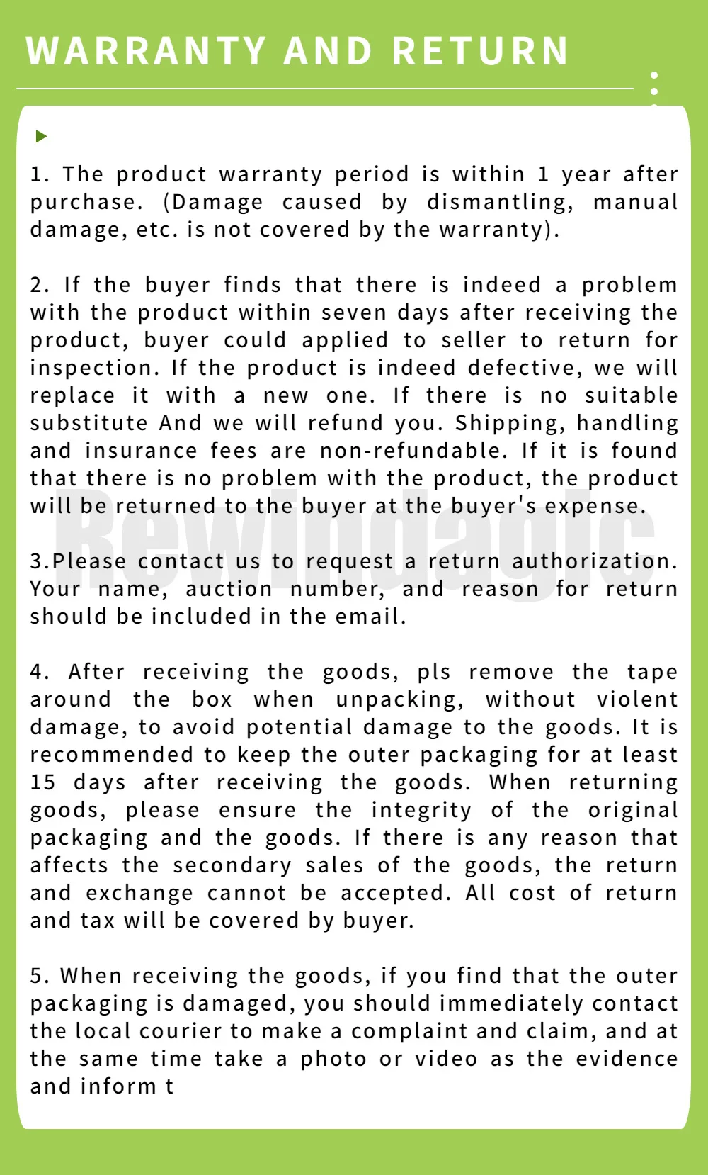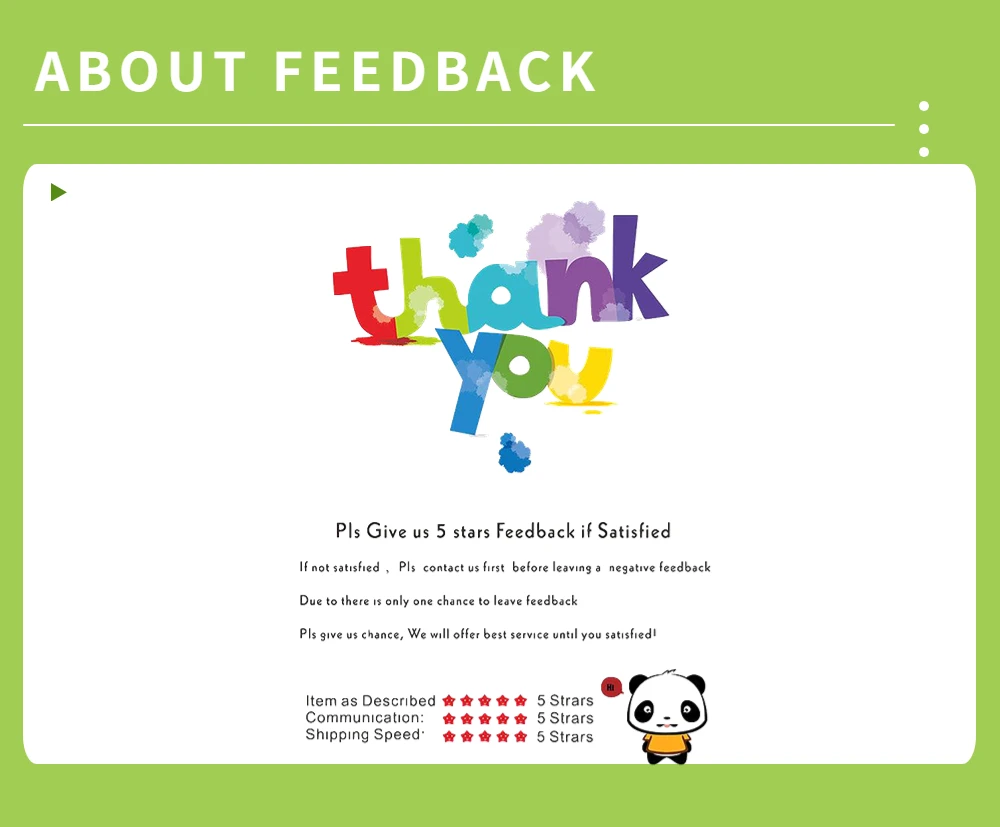 ความคิดเห็นเชิงบวกของคุณคือแรงผลักดันในการปรับปรุงอย่างต่อเนื่องของเราเราเคารพและไว้วางใจลูกค้าทุกคนในการจัดหาผลิตภัณฑ์และบริการที่มีคุณสมบัติเหมาะสมแก่คุณหากคุณพอใจกับผลิตภัณฑ์ของเรา โปรดให้ข้อเสนอแนะเชิงบวกระดับห้าดาวแก่เราหากคุณมีคำถามหรือปัญหาใด ๆ หลังจากได้รับสินค้า กรุณาติดต่อเราผ่านข้อความใน Ali โดยเร็วที่สุด เราจะพยายามแก้ไขปัญหาให้คุณอย่างเต็มที่และรวดเร็วจนกว่าคุณจะพึงพอใจ