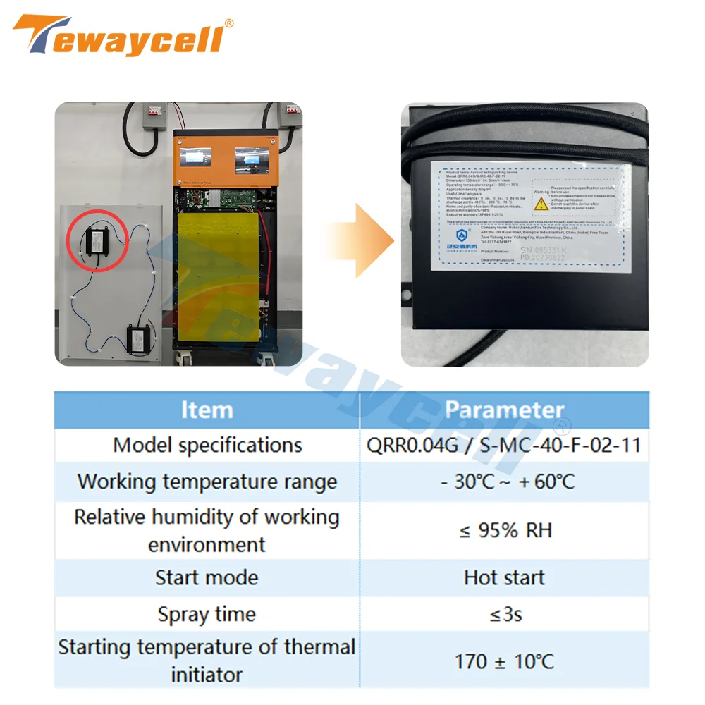 แบตเตอรี่มีอุปกรณ์ดับเพลิงแบบสเปรย์เมื่อแบตเตอรี่เกิดไฟฟ้าลัดวงจรและเกิดเพลิงไหม้ อุปกรณ์ดับเพลิงสามารถตรวจจับอุณหภูมิและดับไฟได้โดยอัตโนมัติ