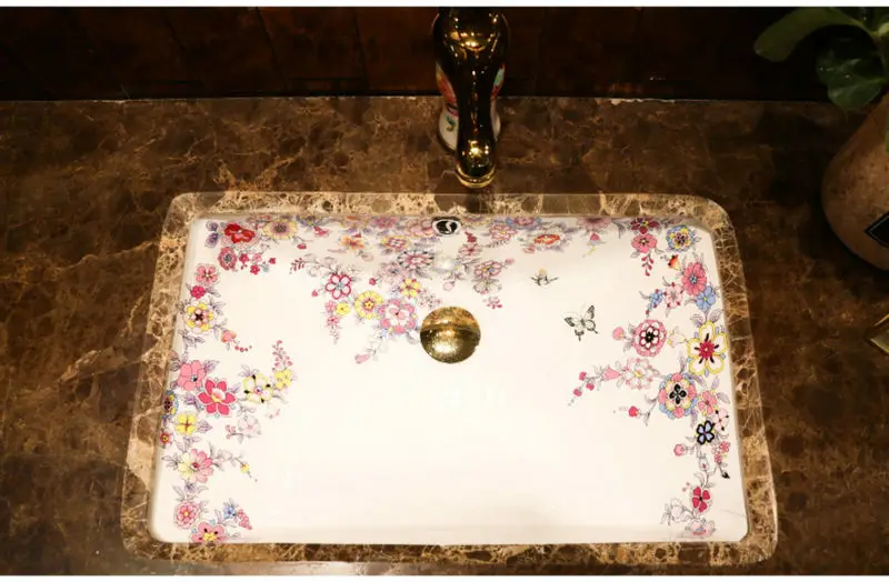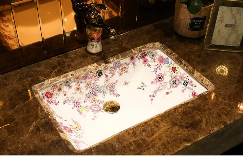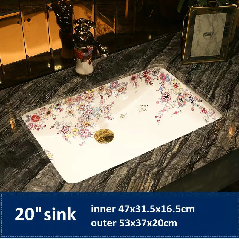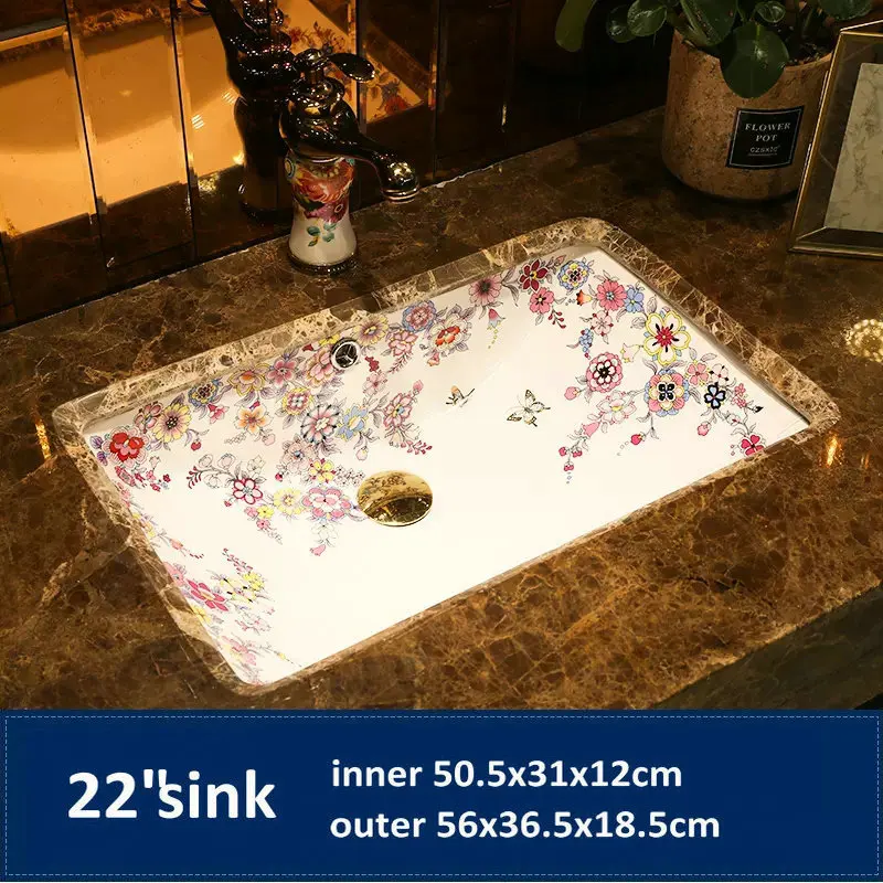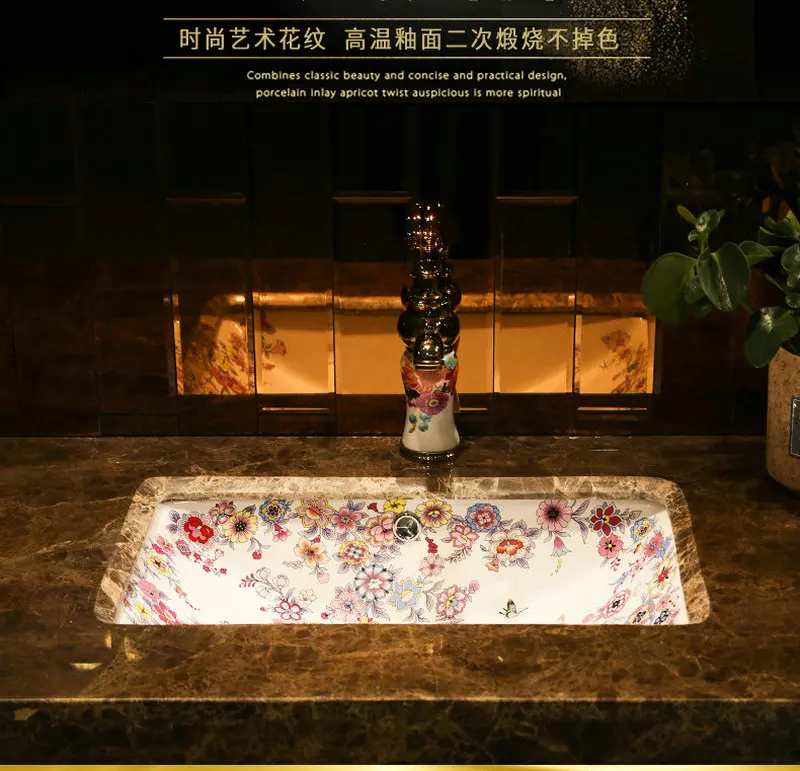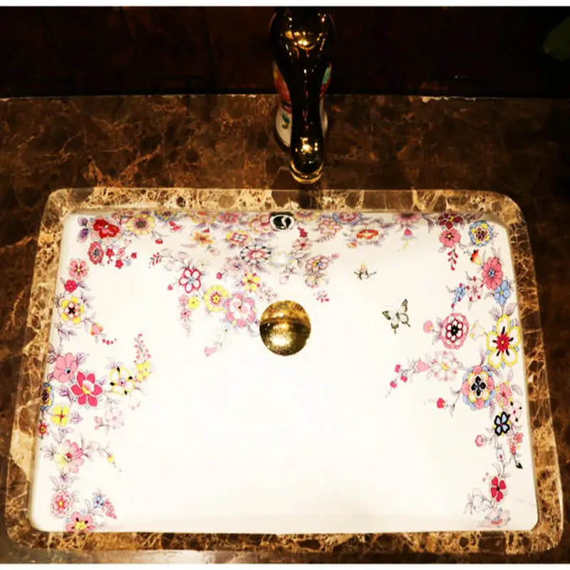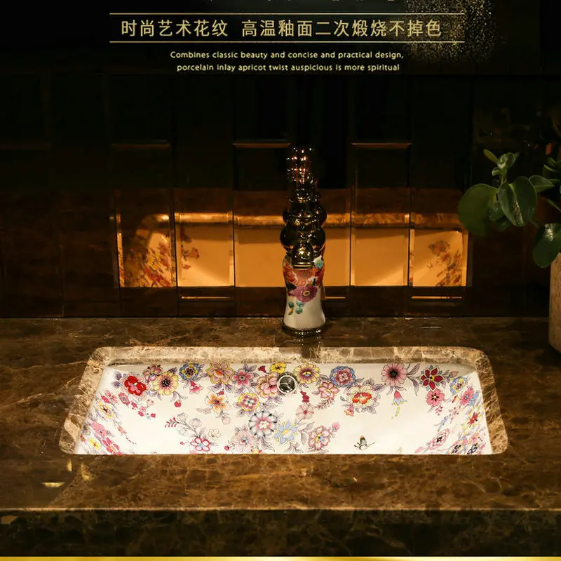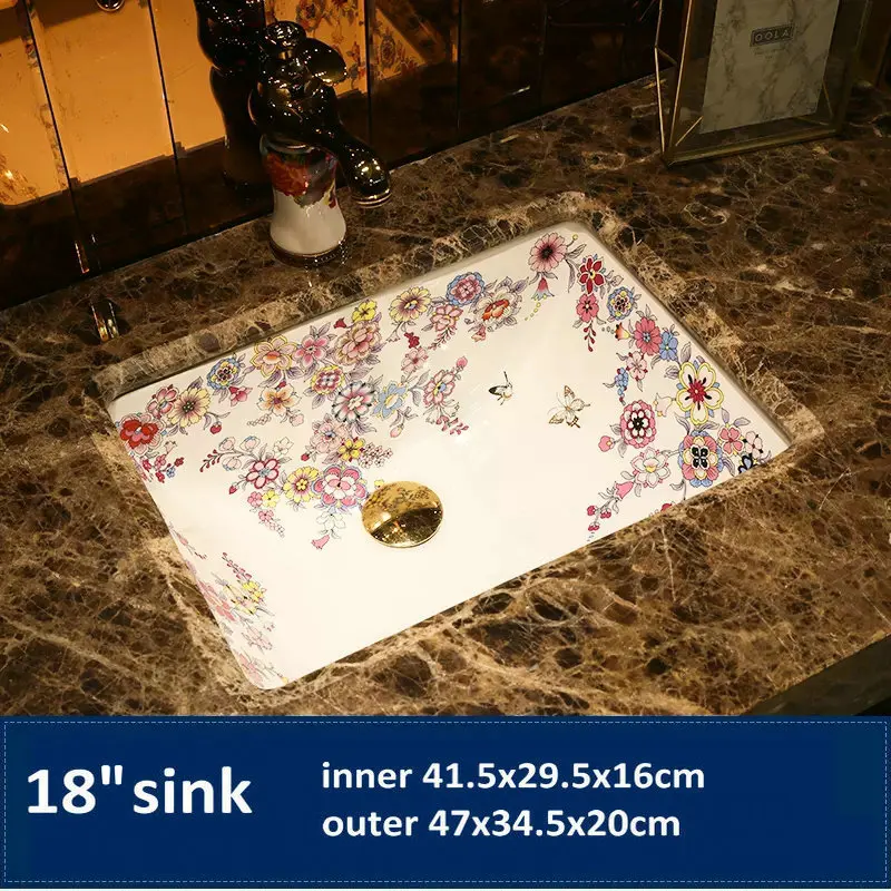 MAEBOW ศิลปะตกแต่งบ้านดอกไม้บานสี่เหลี่ยมผืนผ้าภายใต้เคาน์เตอร์อ่างล้างหน้าเซรามิคห้องน้ําอ่างล้างจาน
