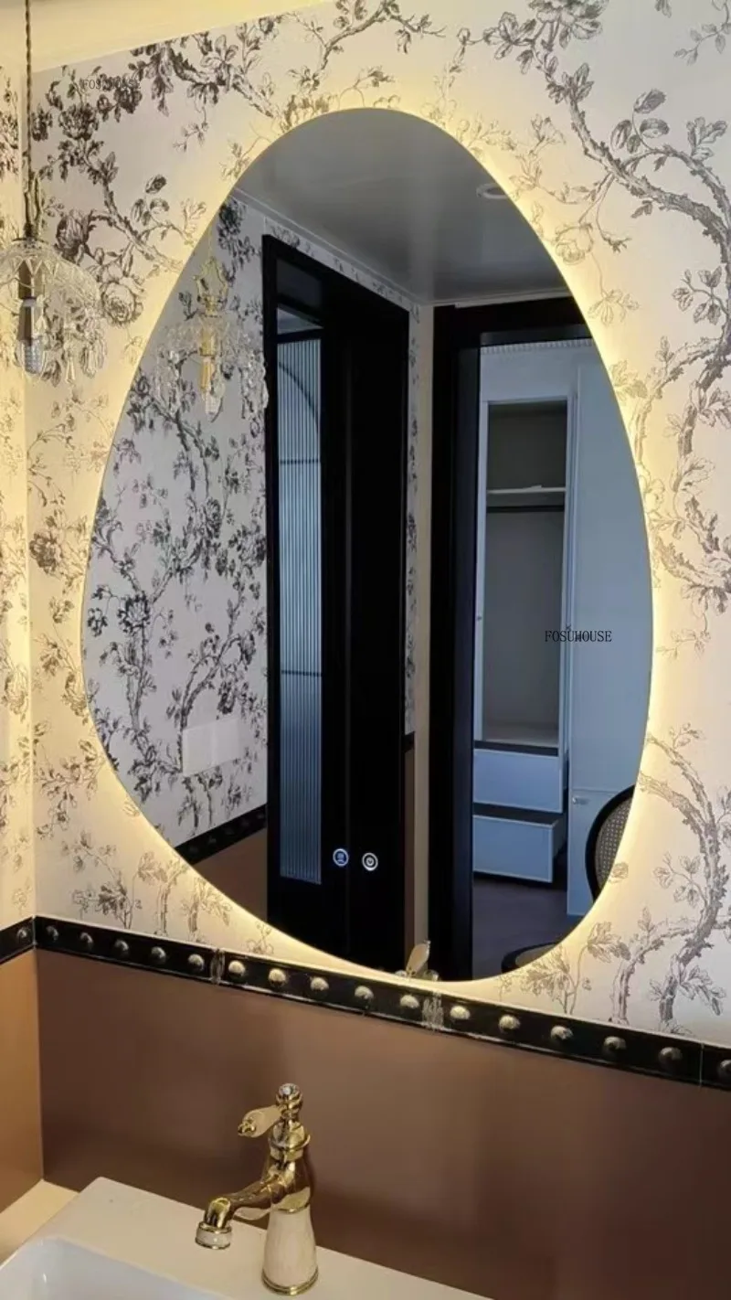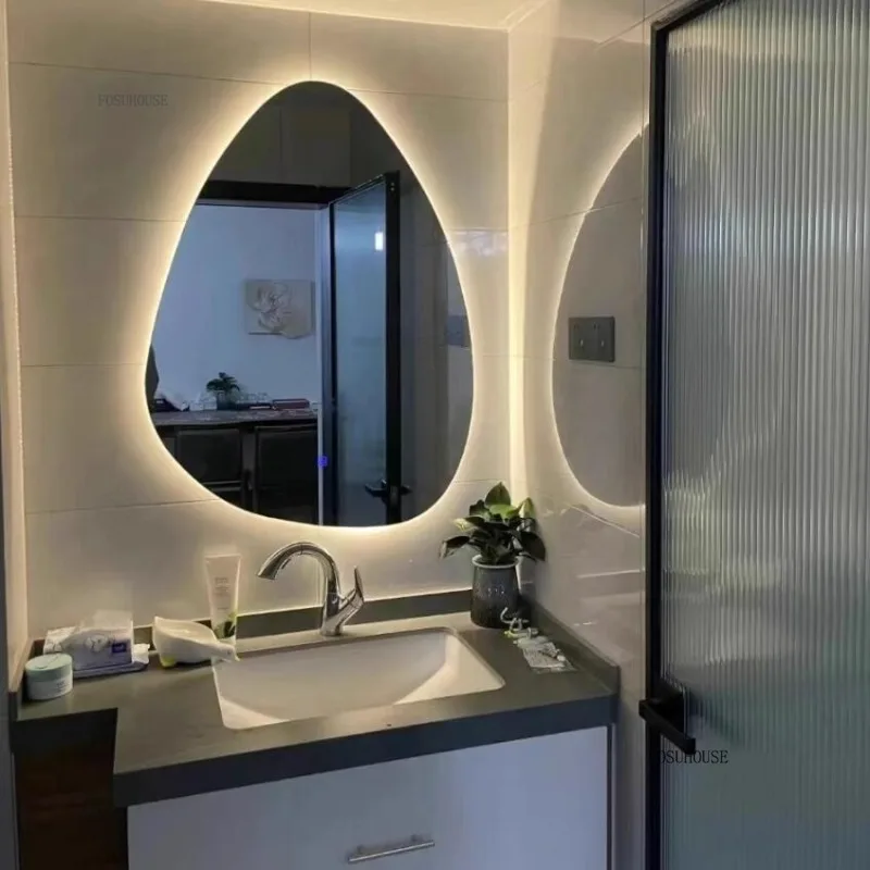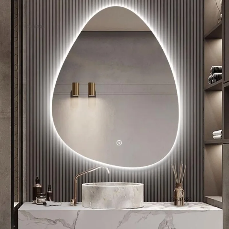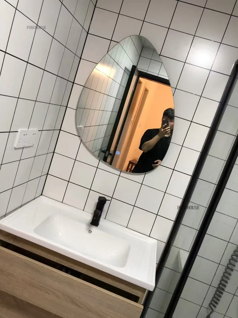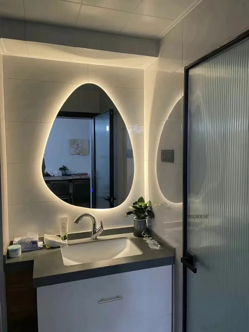 กระจกห้องน้ำ LED อัจฉริยะทันสมัย หน้าจอสัมผัส รูปทรงหยดน้ำ กระจกแต่งตัวในห้องน้ำโรงแรม พร้อมไฟ LED