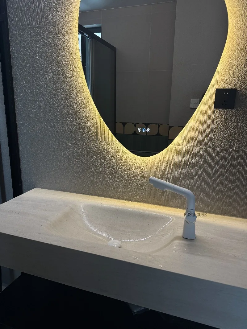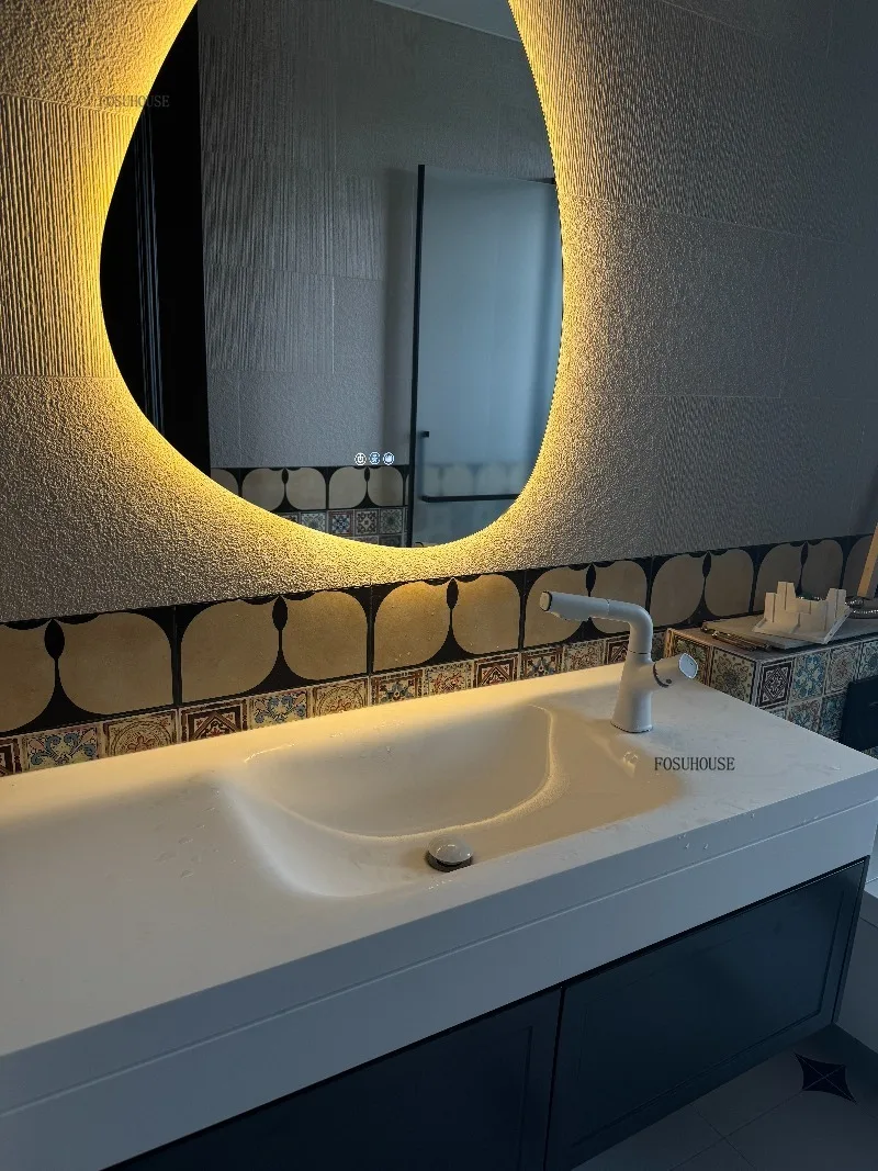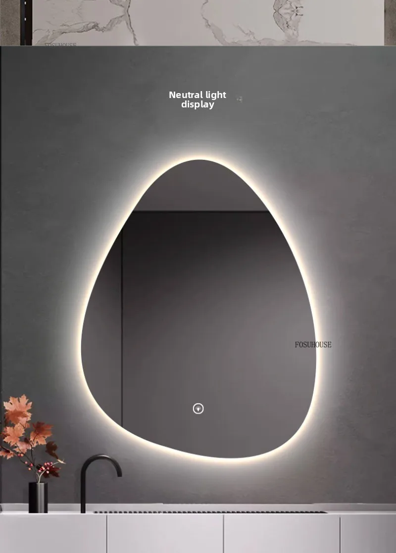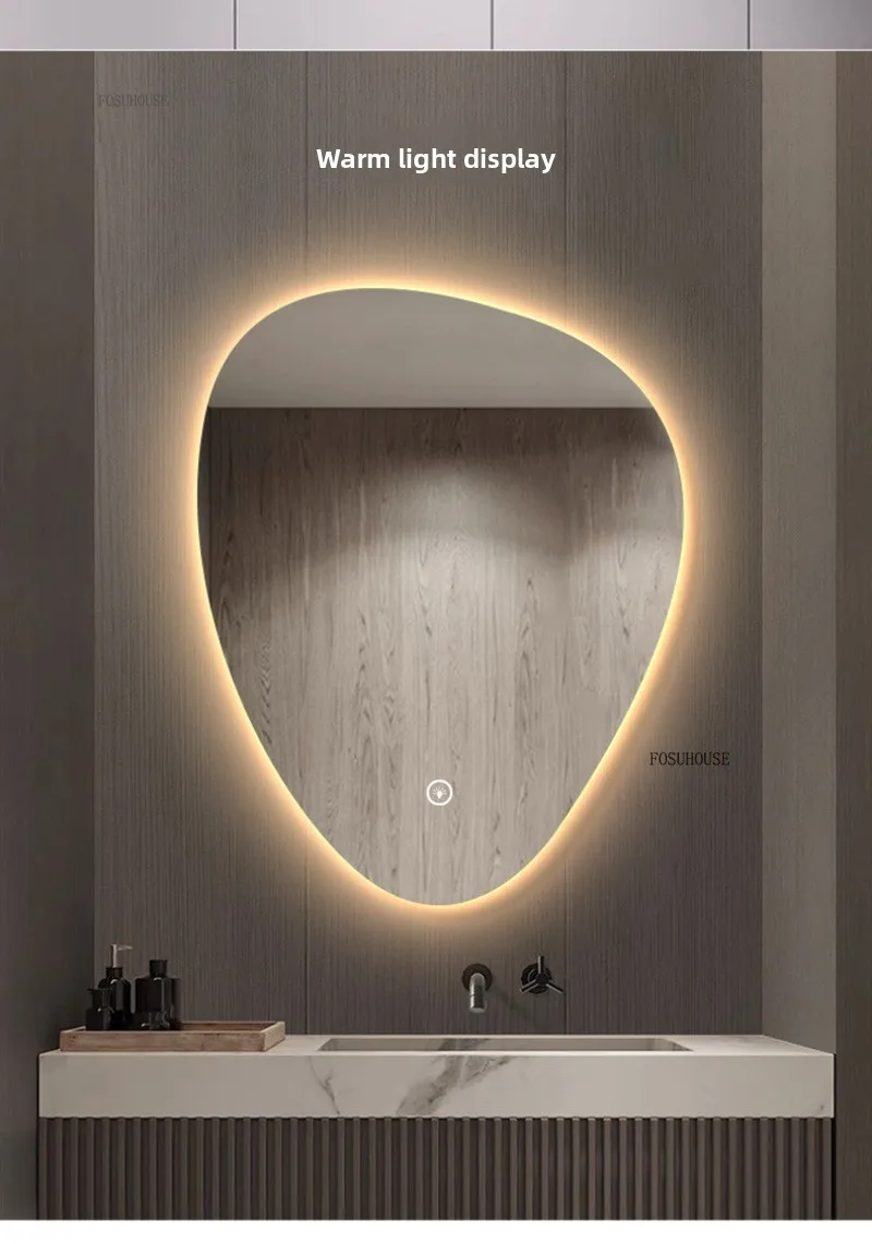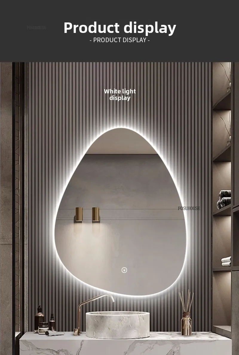 กระจกห้องน้ำอัจฉริยะสมัยใหม่ LED หน้าจอสัมผัส ทรงหยดน้ำ กระจกแต่งหน้าห้องน้ำโรงแรม พร้อมไฟ LED