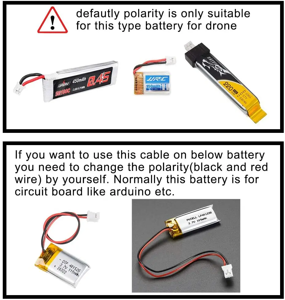 This cable can be used as the power cable between the battery and some Tiny drone like tiny whoop, JRC H36 H67 Upgrading Blade Inductrix, E010 E013, and KingKong Tiny drone . It is suitable for Arduino mkr1010, MKR ZERO and MKR VIDOR 4000 lipo socket, but you need to exchange the positon of red cable and black cable by yourself. too.