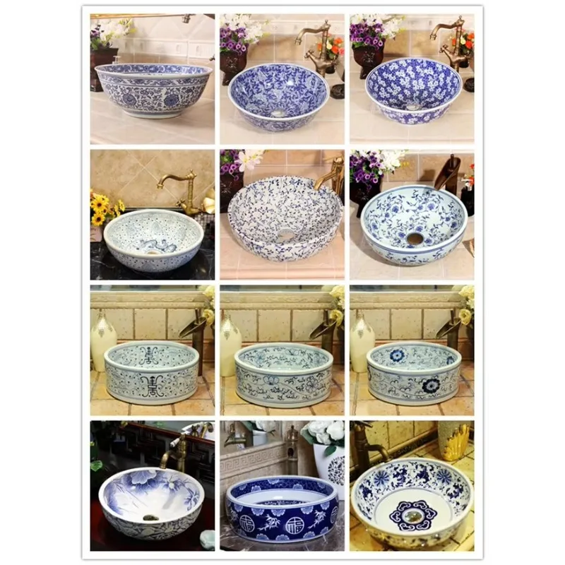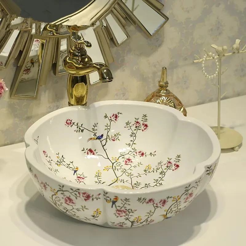 จีน Porcelain มือวาด Art อ่างล้างหน้าโบราณห้องน้ําอ่างล้างจานสีขาวดอกไม้รูปแบบนกเซรามิคอ่างล้างหน้า