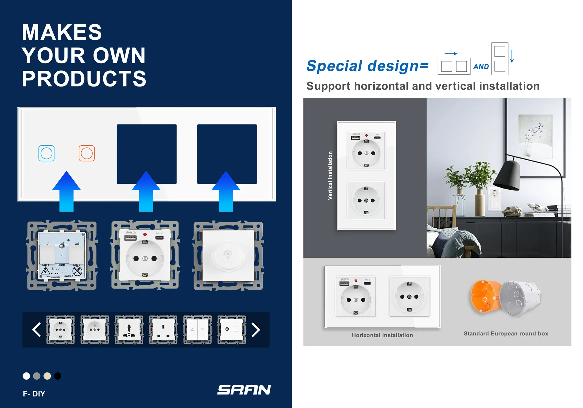 SRAN ซ็อกเก็ตไฟฟ้าพร้อม usb C 20W Fast Charging, EU มาตรฐาน Usb Wall Outlet พร้อมแผ่นเหล็กสําหรับ F Series DIY