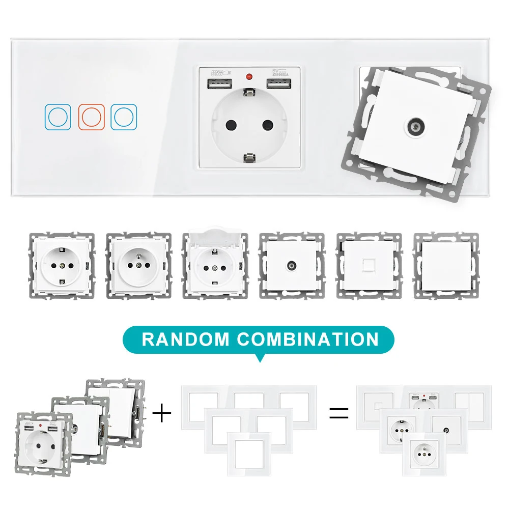 BSEED 1/2 Gang Mechanical สวิทช์ไฟ EU ซ็อกเก็ต USB Type-c พอร์ตทีวี/ST/CAT6 Dimmer ฟังก์ชั่น DIY ชิ้นส่วนกรอบพลาสติก