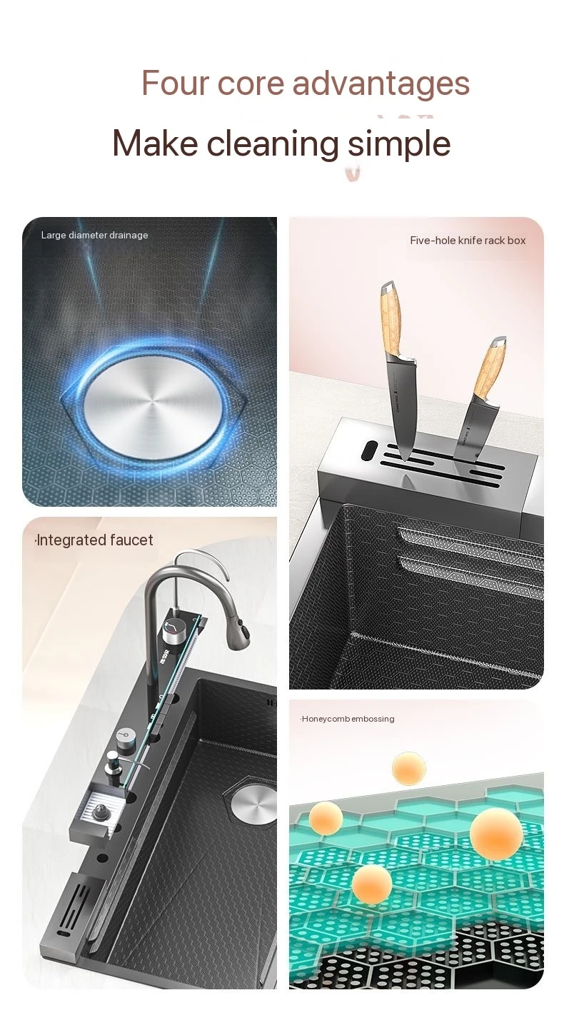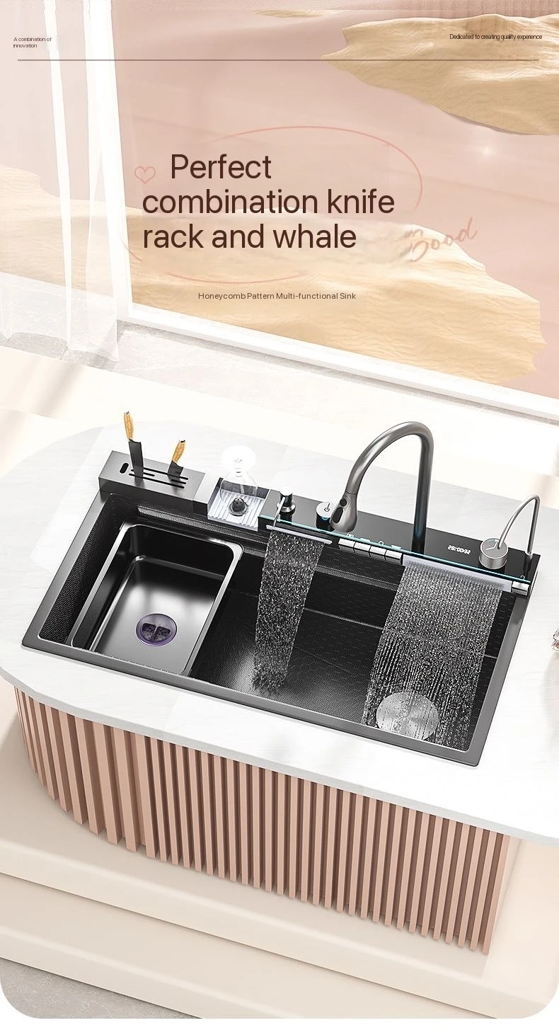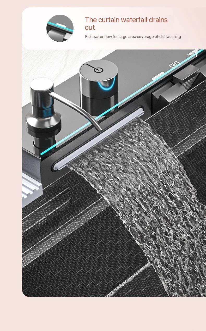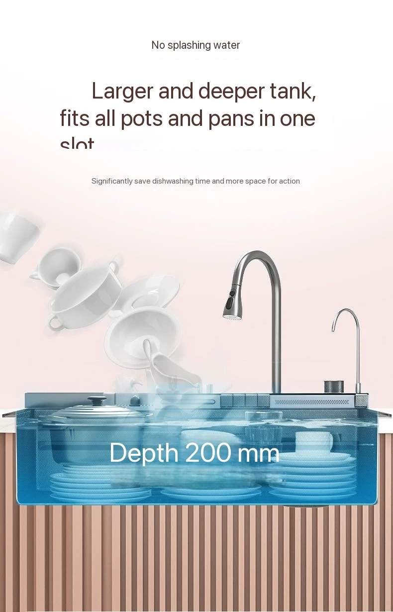 อ่างล้างจานแบบน้ำตกในตัว เทคโนโลยีรังผึ้ง จอแสดงผลดิจิตอลขนาดใหญ่ สแตนเลส เครื่องจ่ายสบู่เหลว เครื่องล้างถ้วย