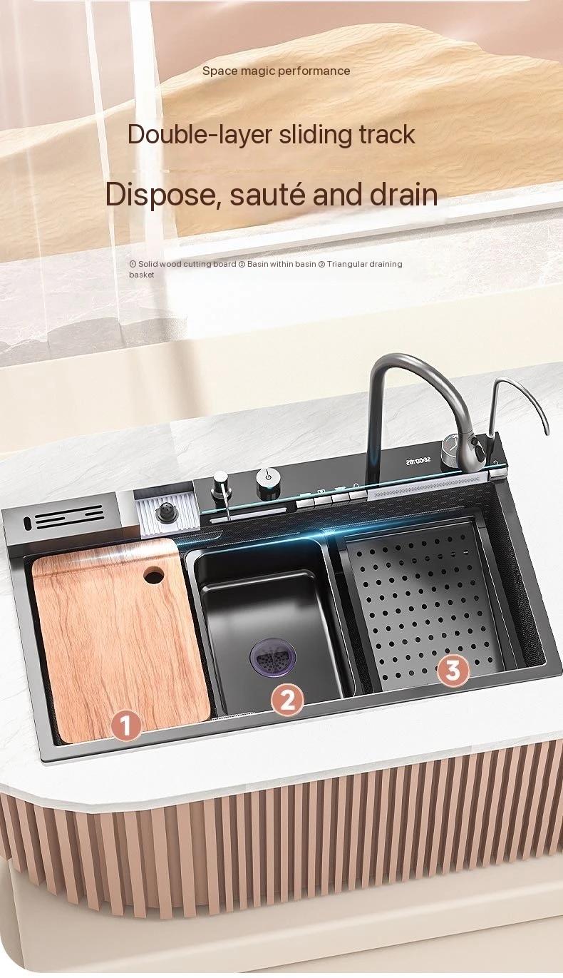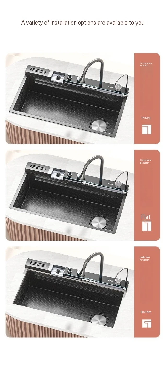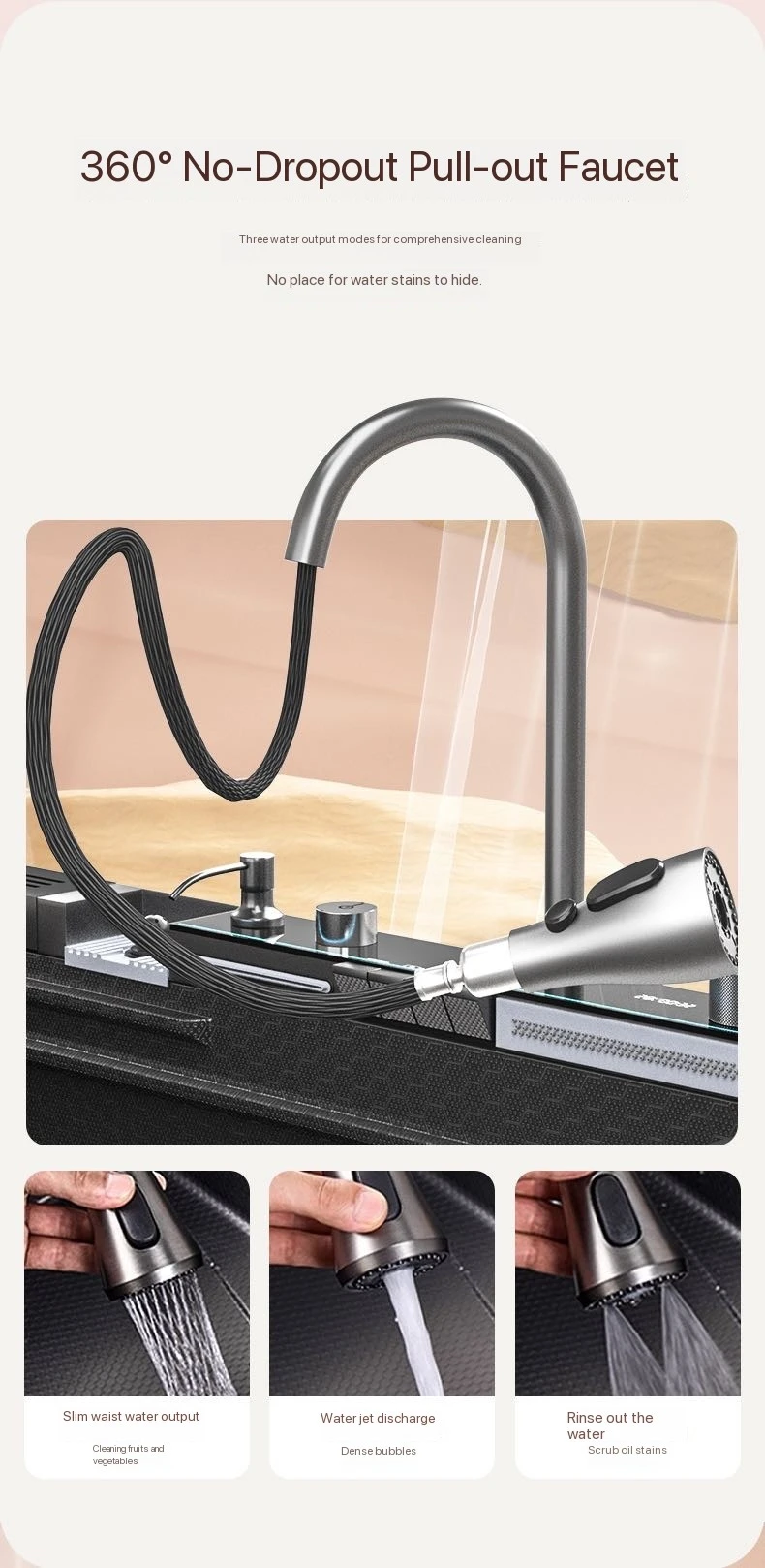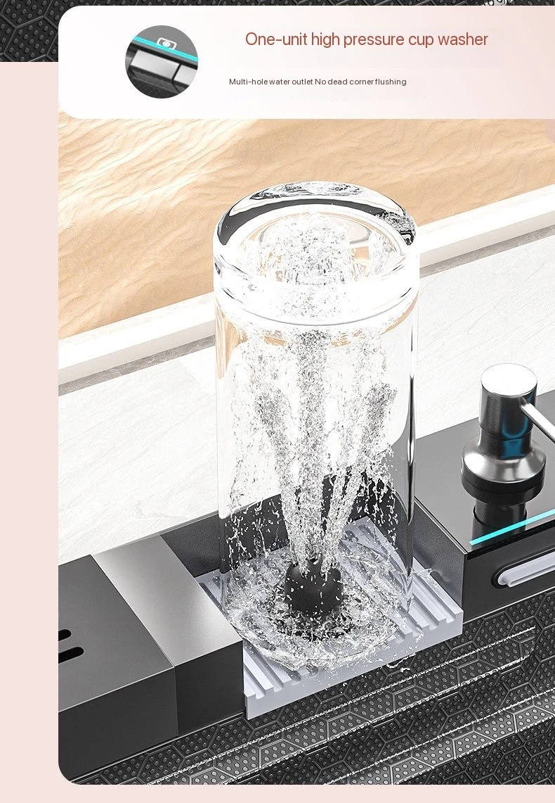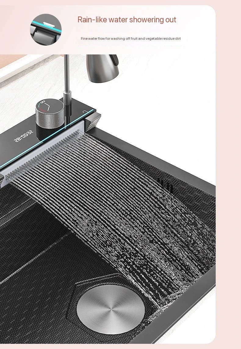 อ่างล้างจานแบบน้ำตกในตัว เทคโนโลยีรังผึ้ง จอแสดงผลดิจิตอลขนาดใหญ่ สแตนเลส เครื่องจ่ายสบู่เหลว เครื่องล้างถ้วย