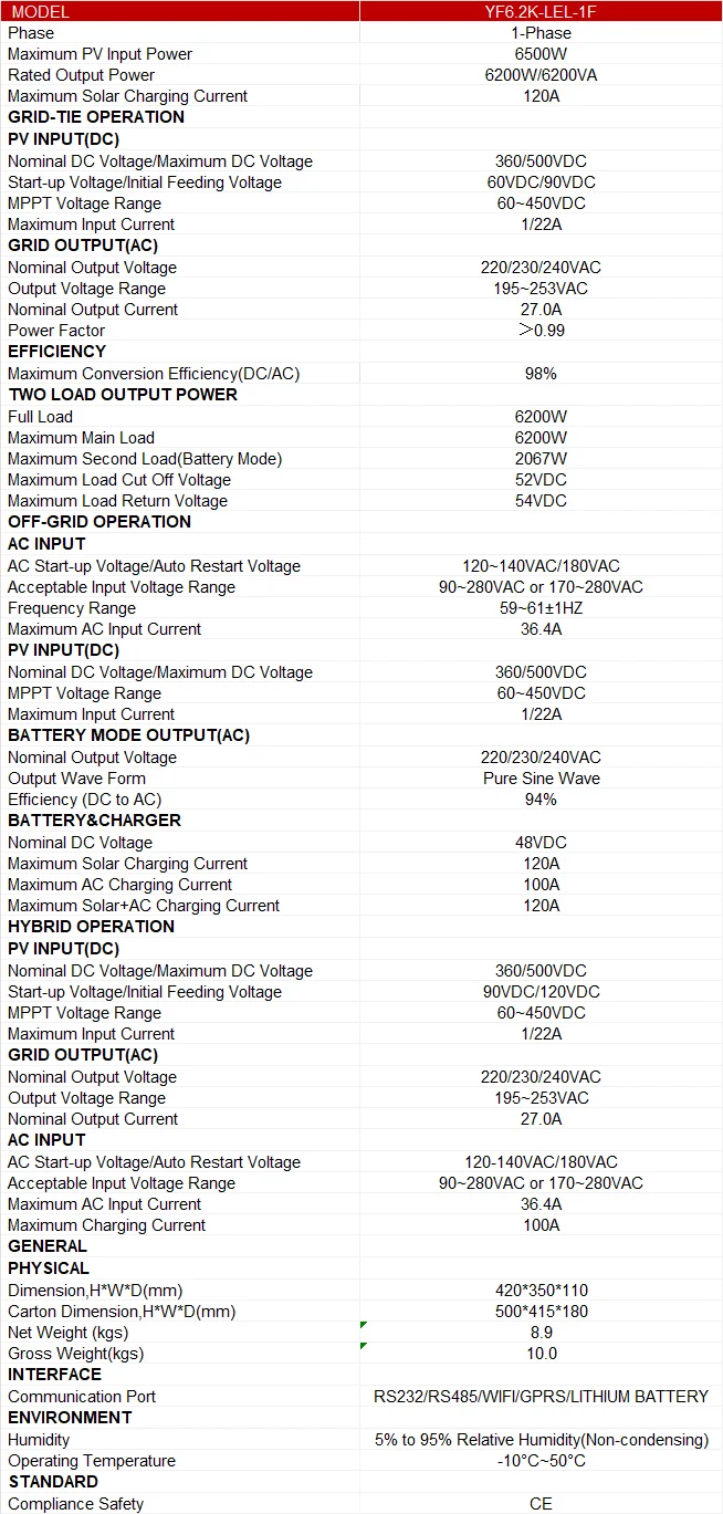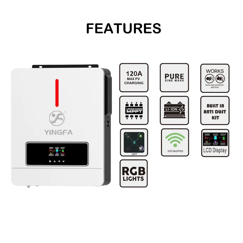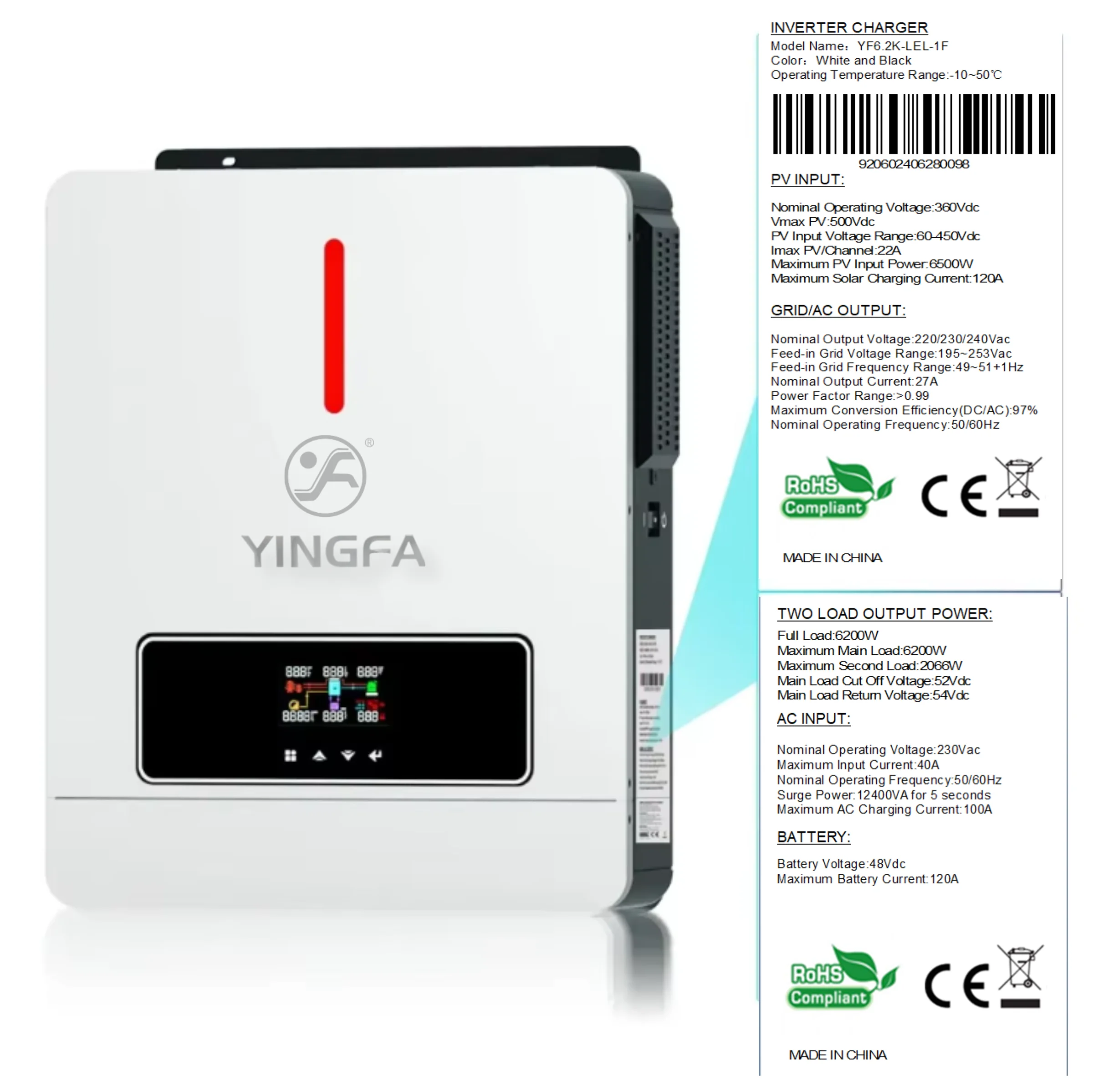 YINGFA 6.2kW 48V 220V HYBRID INVERTER 120A Mppt ชาร์จ 48V 220V 230V DUAL OUTPUT ON/OFF Grid BMS WiFi อินเวอร์เตอร์พลังงานแสงอาทิตย์ PV อินเวอร์เตอร์