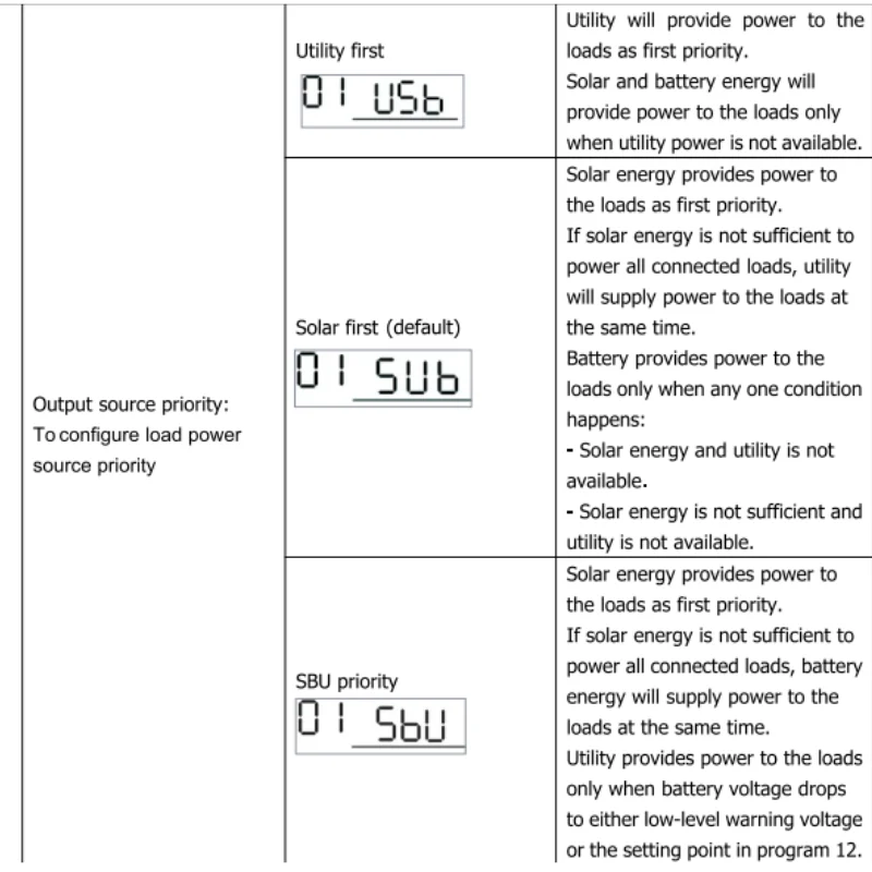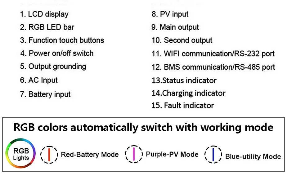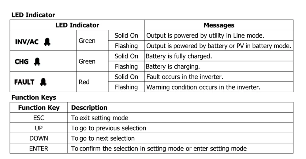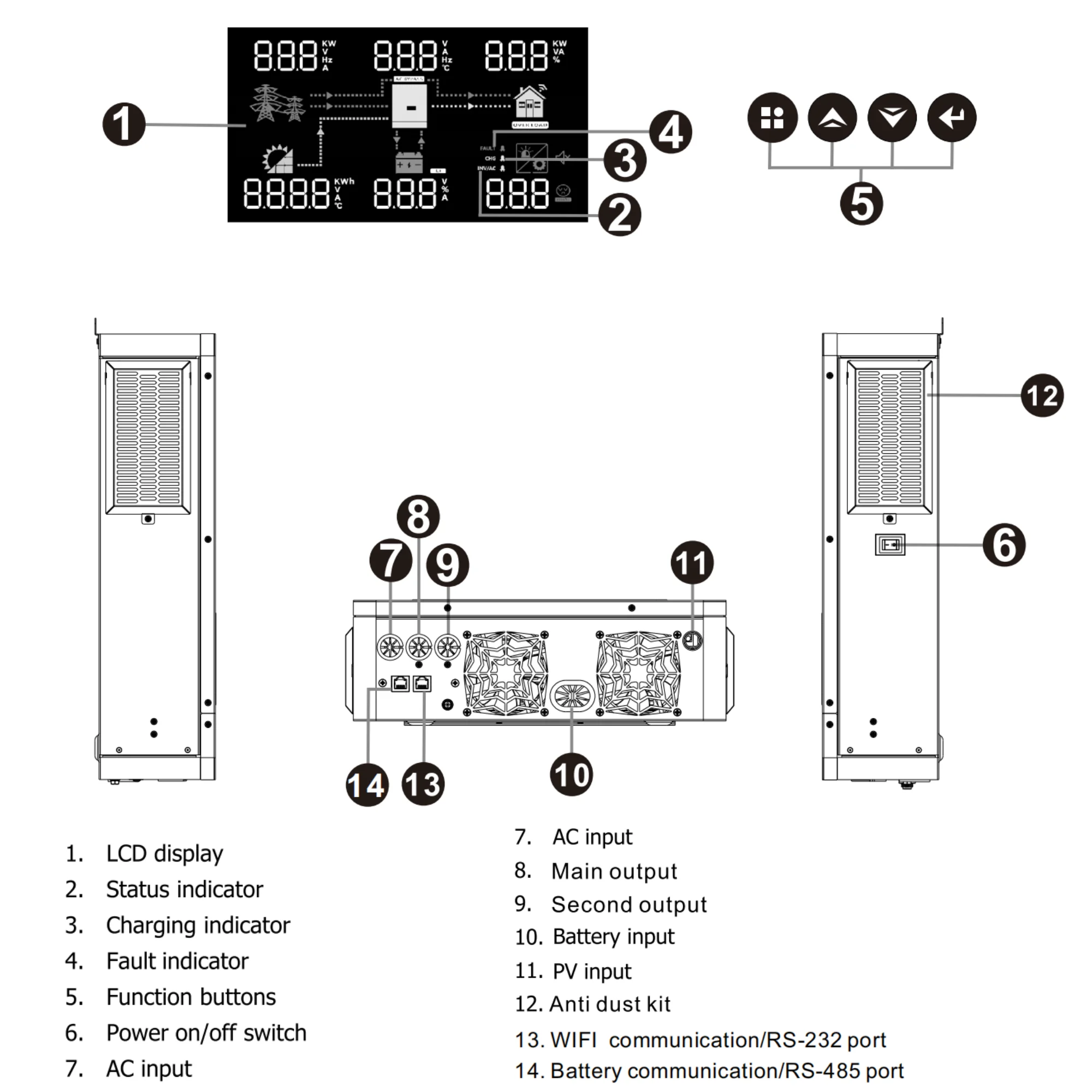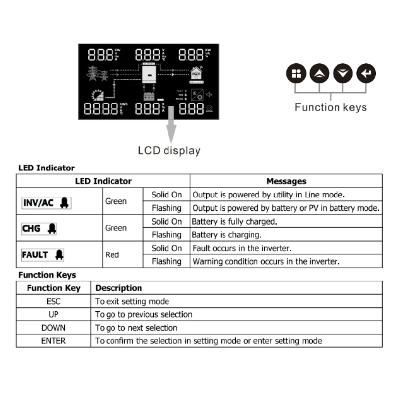 Its comprehensive LCD display offers user-configurable and easy-accessible button operation such as battery charging current, AC/solar charger priority, and acceptable input voltage based on different applications.