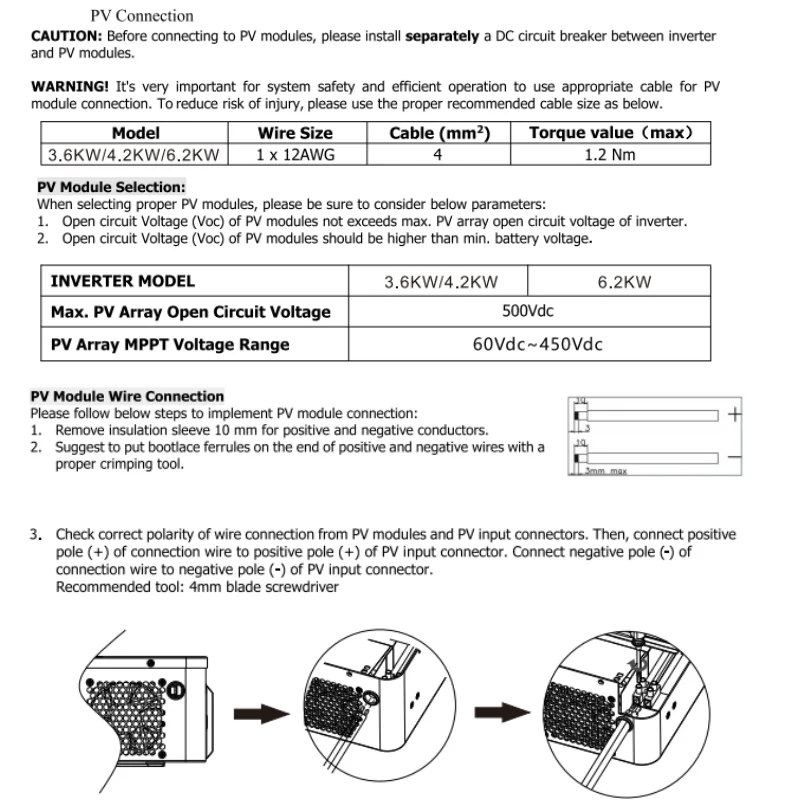 This is a wide voltage Hybrid Solar inverter, If Solar Inverter without external battery ,The voltage which starts to connect to the solar panel must be above 150V for the inverter to work normally, if with external battery 120V is working.