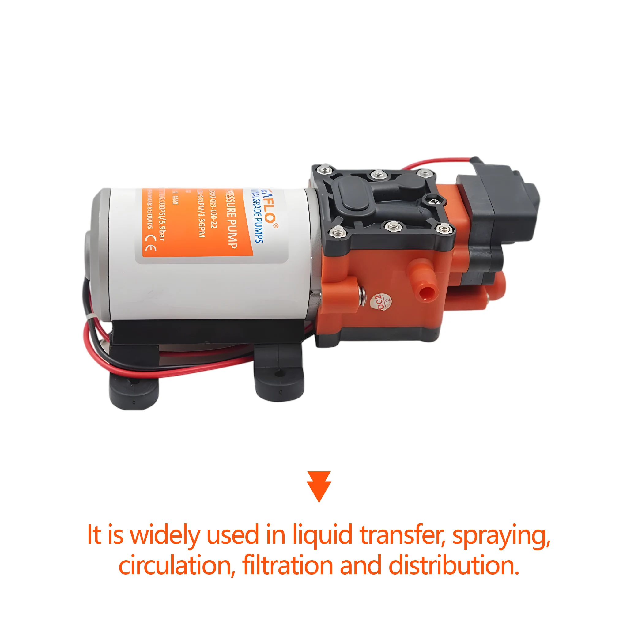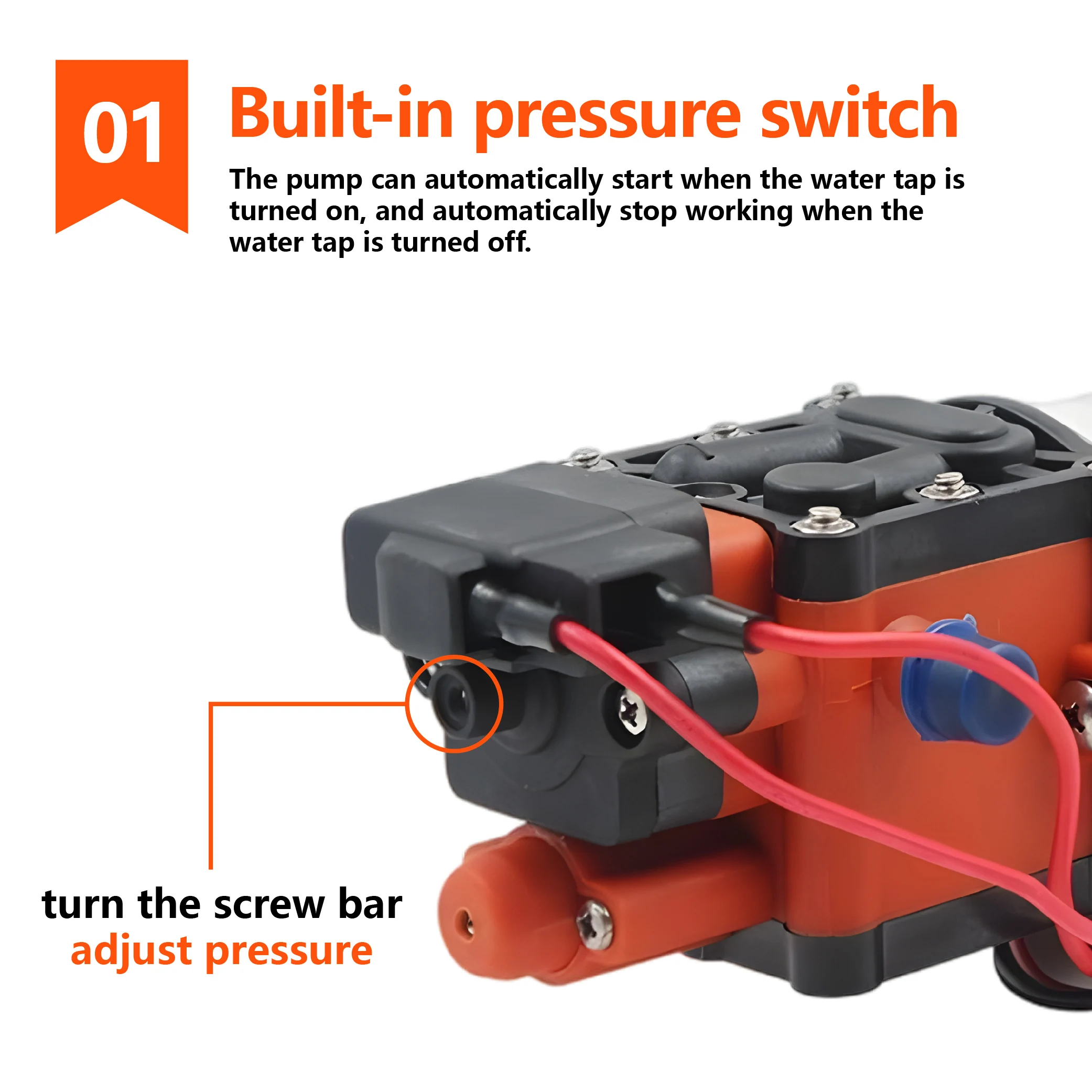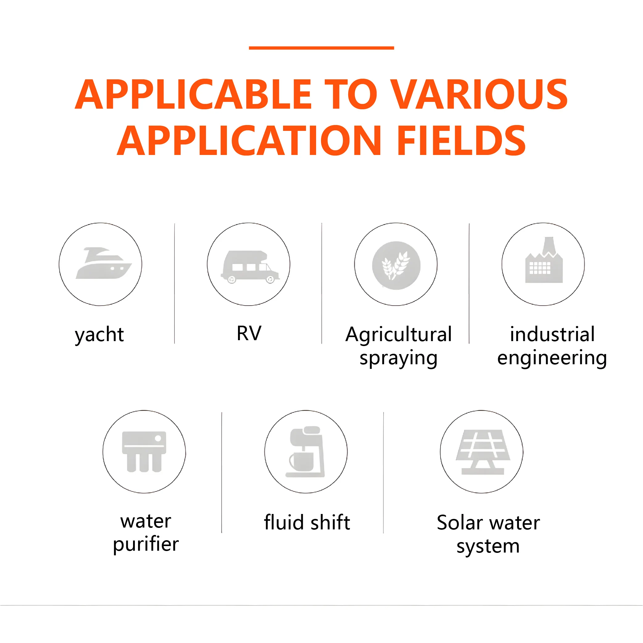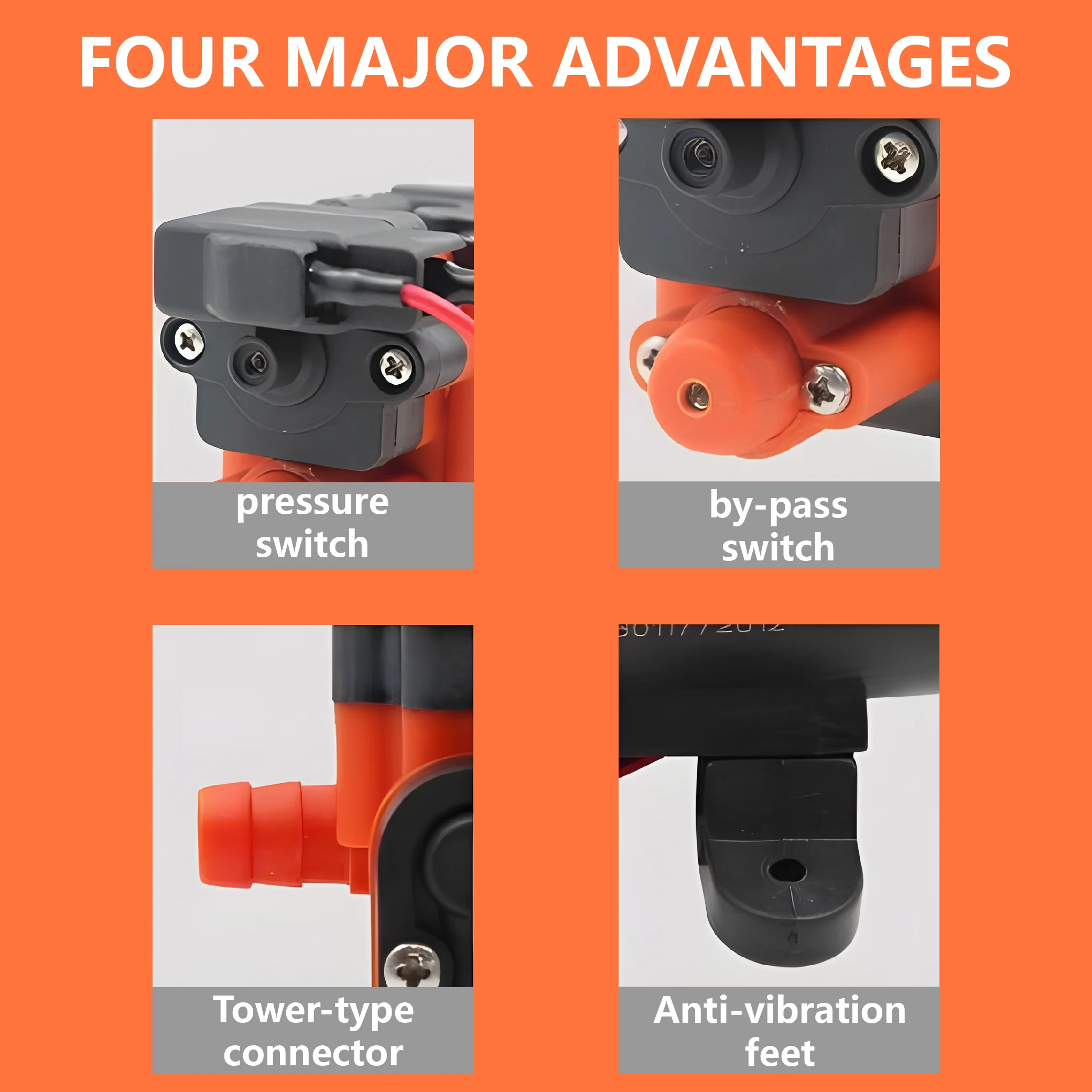 นี่คือปั๊มไดอะแฟรมแรงดันสูงและอัตราการไหลสูงแบบ 12/24 โวลต์นี่คือเครื่องพ่นอัตโนมัติเต็มรูปแบบที่มาพร้อมกับปั๊มไฟฟ้าขนาดเล็กแบบดูดเองสำหรับการใช้งานในอุตสาหกรรม โดยใช้พลังงานจากแหล่งจ่ายไฟกระแสตรง (DC)มีขนาดเล็ก แรงดันสูง และกระแสไฟต่ำอัตราการไหลสามารถสูงถึง 5.1 ลิตรต่อนาทีมีฟังก์ชันการดูดน้ำด้วยตัวเองและการเพิ่มแรงดันสูง สามารถทำงานได้โดยไม่ต้องใช้น้ำในช่วงเวลาสั้นๆมีปั๊มน้ำแรงดันหลายจุดและช่องจ่ายน้ำขนาดเล็กหลายตำแหน่งสามารถติดตั้งช่องจ่ายน้ำขนาด 10 มิลลิเมตรได้ 1 หรือ 2 ช่องมาพร้อมกับสวิตช์แรงดันและระบบบายพาสลดแรงดันภายในมีขายางกันกระแทกซึ่งทำให้การทำงานเงียบ ลดการสั่นสะเทือน และลดเสียงรบกวนมีการใช้กันอย่างแพร่หลายในการถ่ายเทของเหลว การพ่น การไหลเวียน การกรอง และการกระจาย