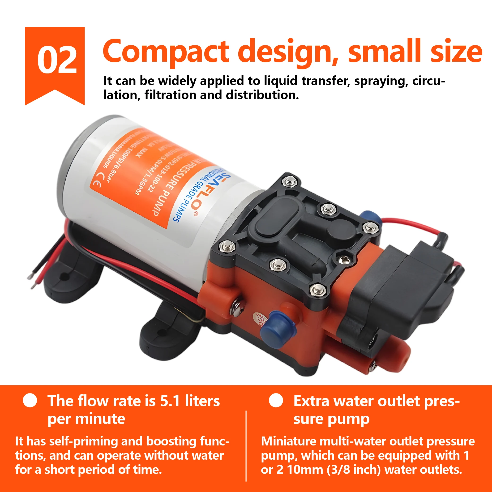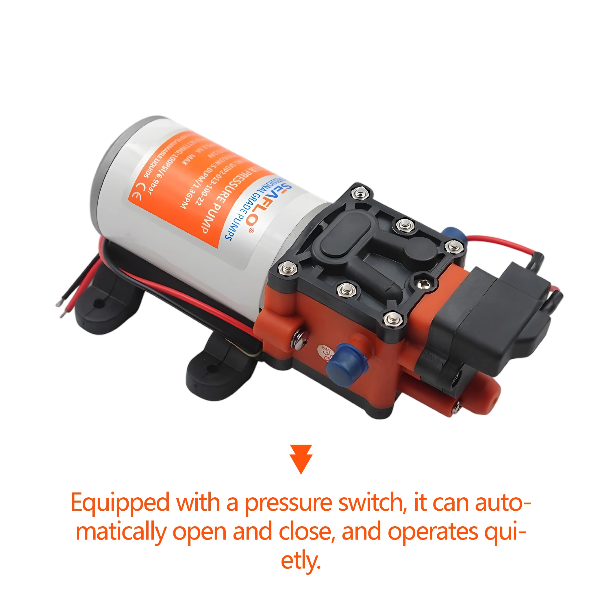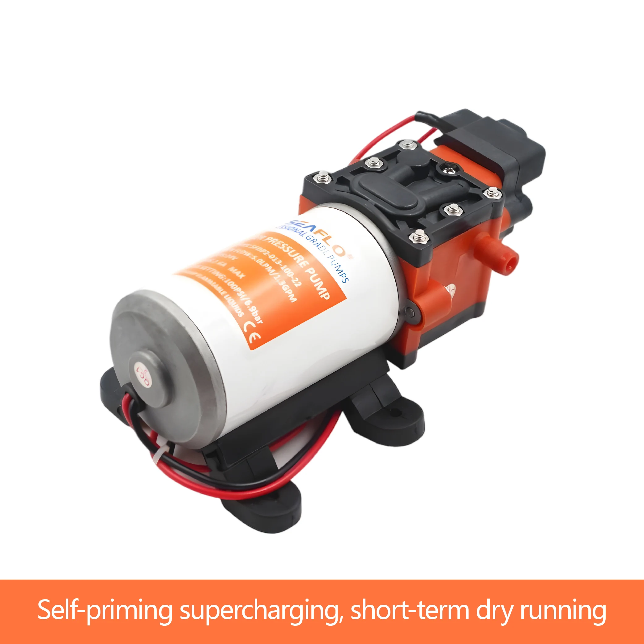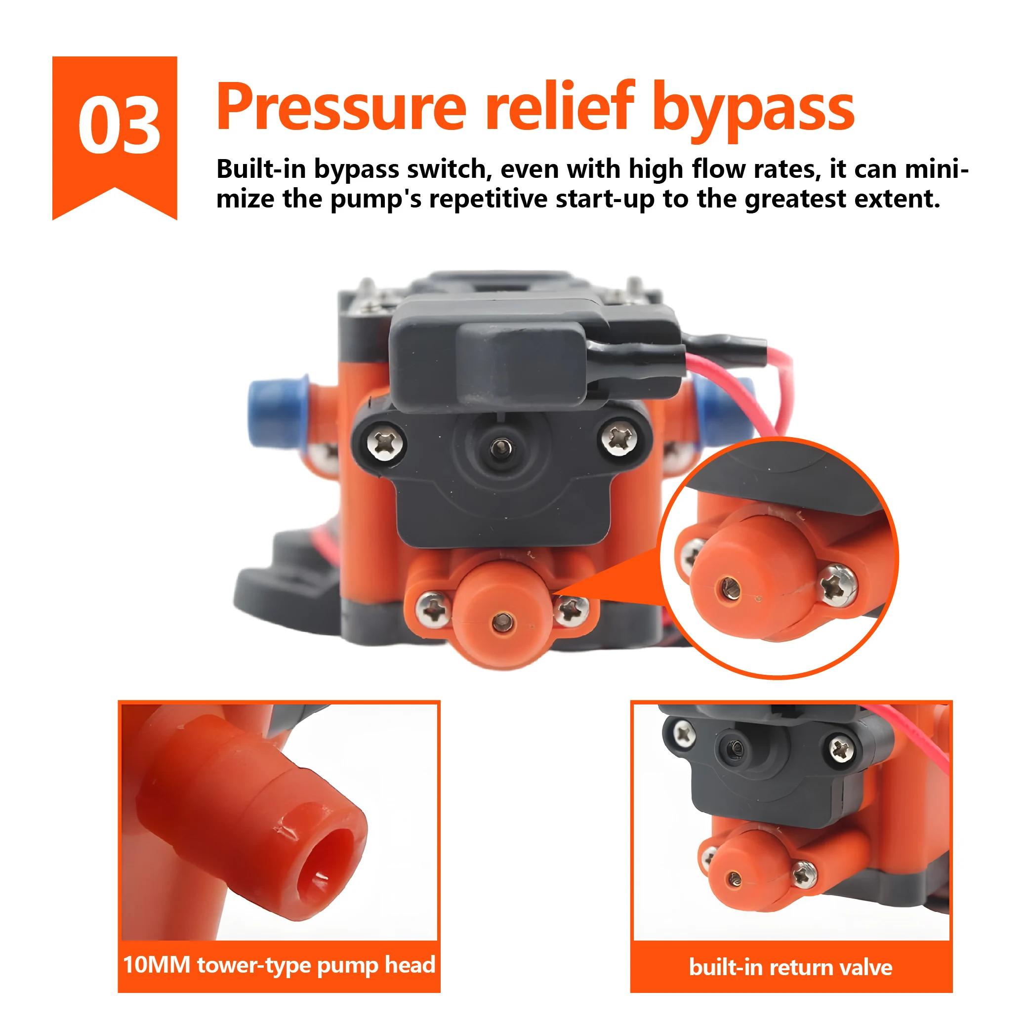 นี่คือปั๊มไดอะแฟรมแรงดันสูงและอัตราการไหลสูงแบบ 12/24 โวลต์นี่คือเครื่องพ่นอัตโนมัติเต็มรูปแบบที่มาพร้อมกับปั๊มไฟฟ้าขนาดเล็กแบบดูดเองสำหรับการใช้งานในอุตสาหกรรม โดยใช้พลังงานจากแหล่งจ่ายไฟกระแสตรง (DC)มีขนาดเล็ก แรงดันสูง และกระแสไฟต่ำอัตราการไหลสามารถสูงถึง 5.1 ลิตรต่อนาทีมีฟังก์ชันการดูดน้ำด้วยตัวเองและการเพิ่มแรงดันสูง สามารถทำงานได้โดยไม่ต้องใช้น้ำในช่วงเวลาสั้นๆมีปั๊มน้ำแรงดันหลายจุดและช่องจ่ายน้ำขนาดเล็กหลายตำแหน่งสามารถติดตั้งช่องจ่ายน้ำขนาด 10 มิลลิเมตรได้ 1 หรือ 2 ช่องมาพร้อมกับสวิตช์แรงดันและระบบบายพาสลดแรงดันภายในมีขายางกันกระแทกซึ่งทำให้การทำงานเงียบ ลดการสั่นสะเทือน และลดเสียงรบกวนมีการใช้กันอย่างแพร่หลายในการถ่ายเทของเหลว การพ่น การไหลเวียน การกรอง และการกระจาย