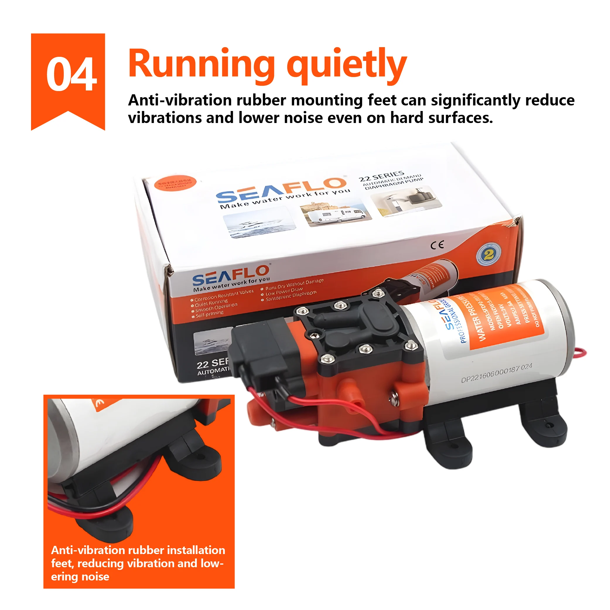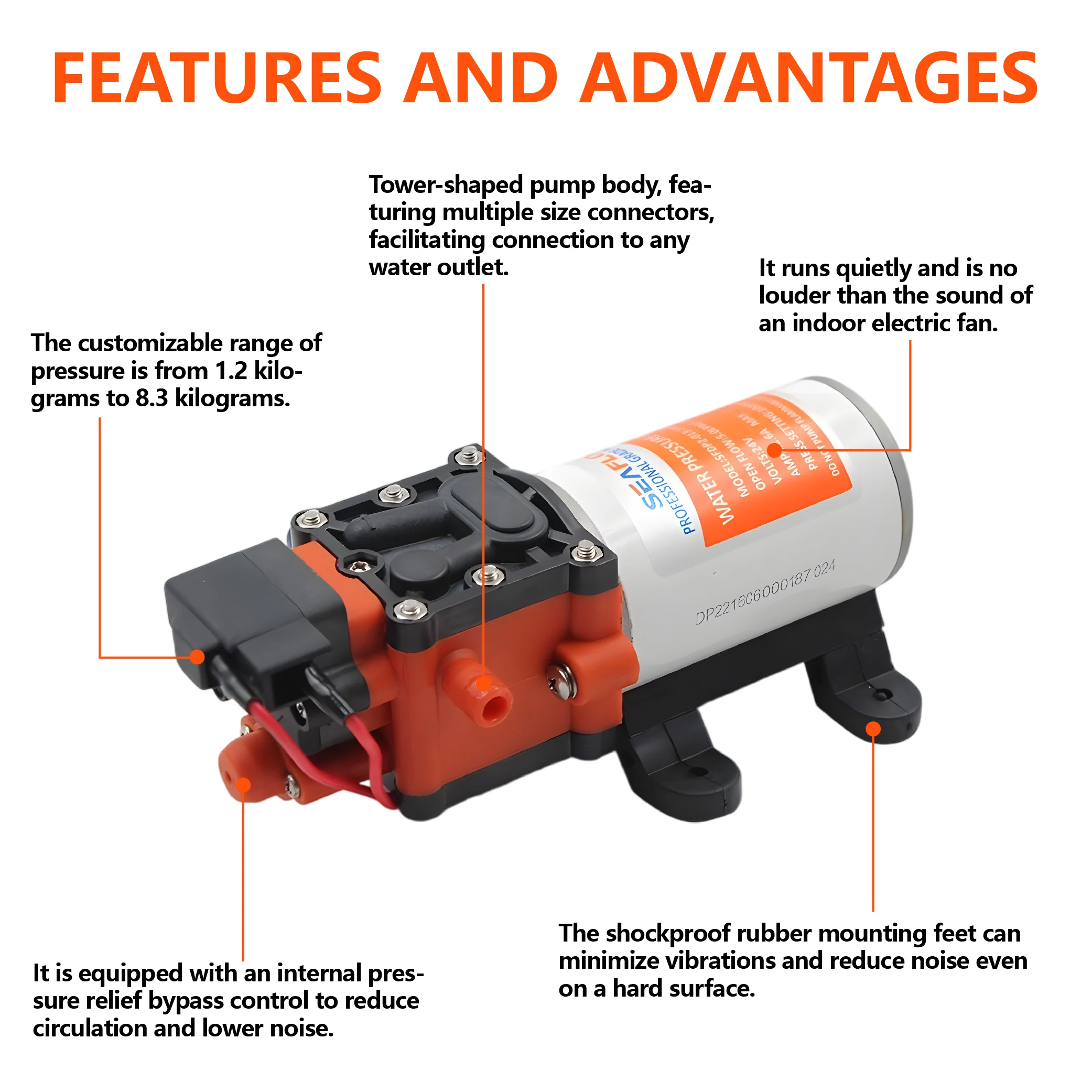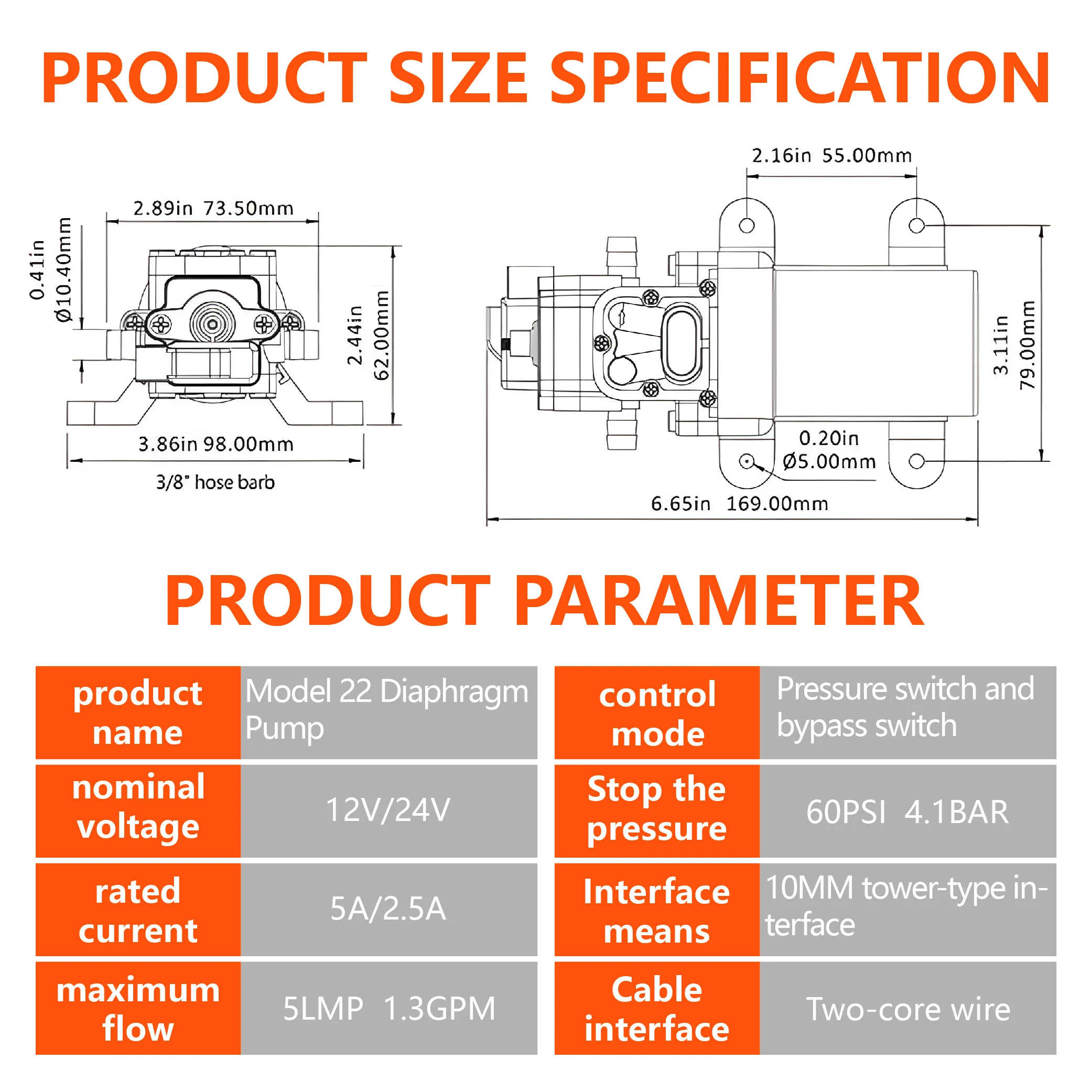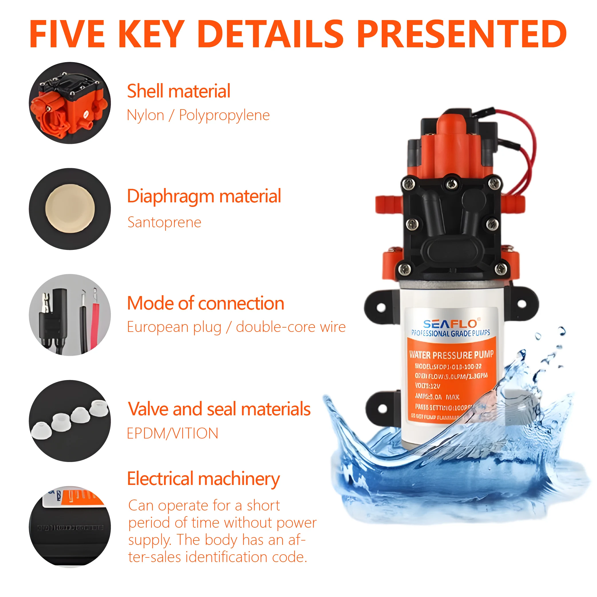 นี่คือปั๊มไดอะแฟรมแรงดันสูงและอัตราการไหลสูงแบบ 12/24 โวลต์นี่คือเครื่องพ่นอัตโนมัติเต็มรูปแบบที่มาพร้อมกับปั๊มไฟฟ้าขนาดเล็กแบบดูดเองสำหรับการใช้งานในอุตสาหกรรม โดยใช้พลังงานจากแหล่งจ่ายไฟกระแสตรง (DC)มีขนาดเล็ก แรงดันสูง และกระแสไฟต่ำอัตราการไหลสามารถสูงถึง 5.1 ลิตรต่อนาทีมีฟังก์ชันการดูดน้ำด้วยตัวเองและการเพิ่มแรงดันสูง สามารถทำงานได้โดยไม่ต้องใช้น้ำในช่วงเวลาสั้นๆมีปั๊มน้ำแรงดันหลายจุดและช่องจ่ายน้ำขนาดเล็กหลายตำแหน่งสามารถติดตั้งช่องจ่ายน้ำขนาด 10 มิลลิเมตรได้ 1 หรือ 2 ช่องมาพร้อมกับสวิตช์แรงดันและระบบบายพาสลดแรงดันภายในมีขายางกันกระแทกซึ่งทำให้การทำงานเงียบ ลดการสั่นสะเทือน และลดเสียงรบกวนมีการใช้กันอย่างแพร่หลายในการถ่ายเทของเหลว การพ่น การไหลเวียน การกรอง และการกระจาย