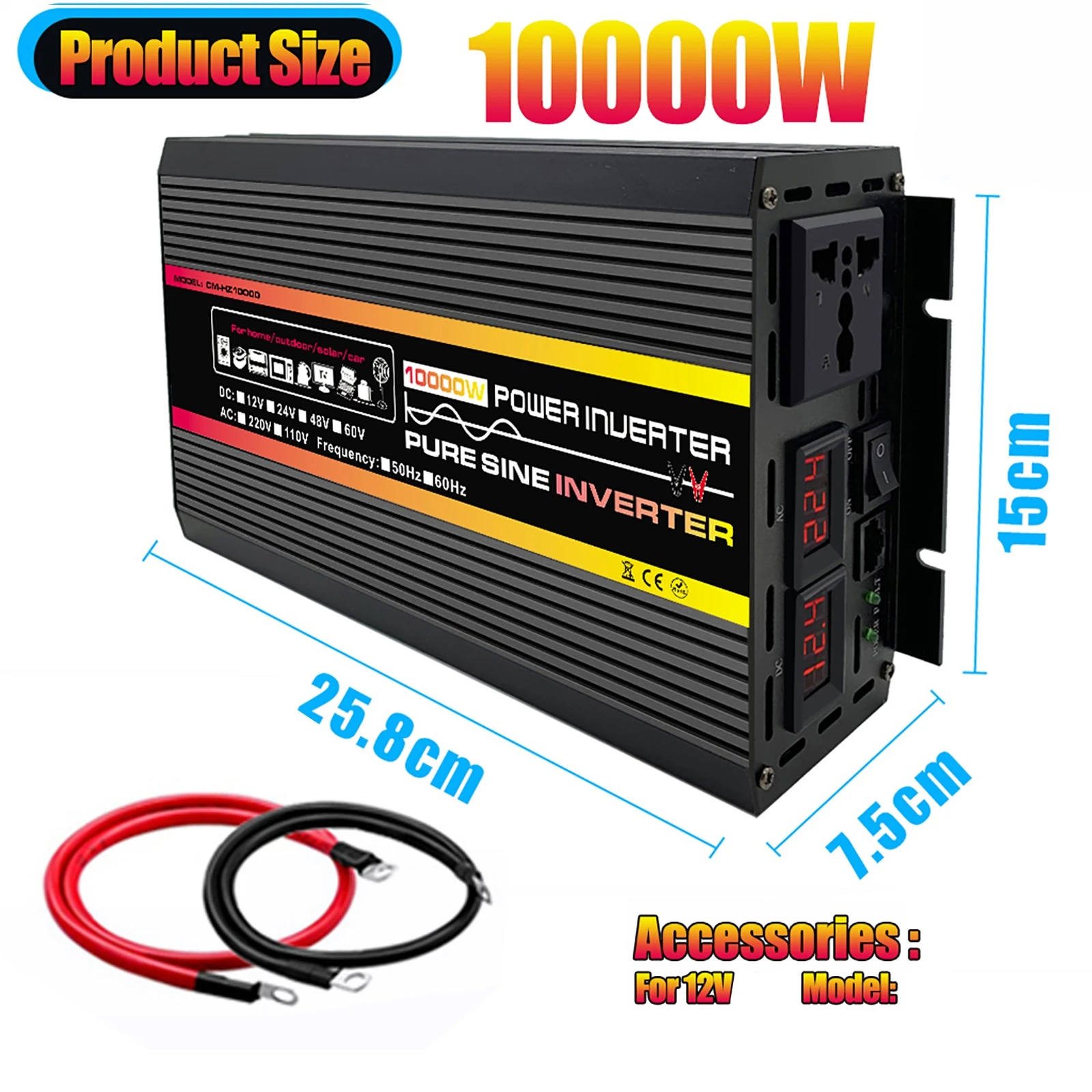 10,000 วัตต์/8000W Pure Sine Wave Power อินเวอร์เตอร์แรงดันไฟฟ้าหม้อแปลงไฟฟ้าอัจฉริยะดิจิตอลจอแสดงผลรถบ้านกลางแจ้ง DC12V to AC 220V/DC24V ถึงไฟฟ้ากระแสสลับ 220Vตัวแปลง