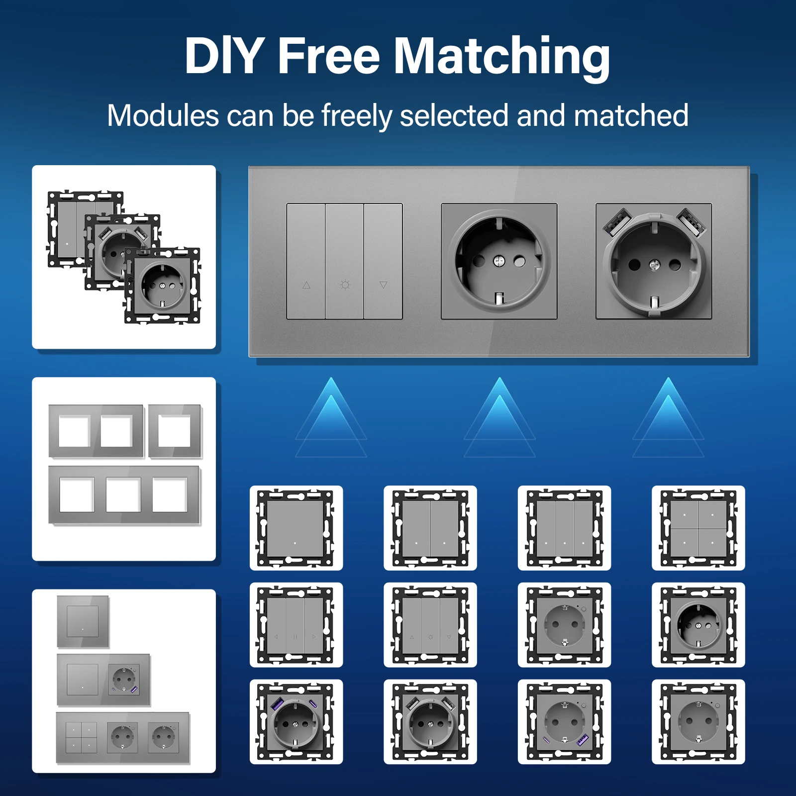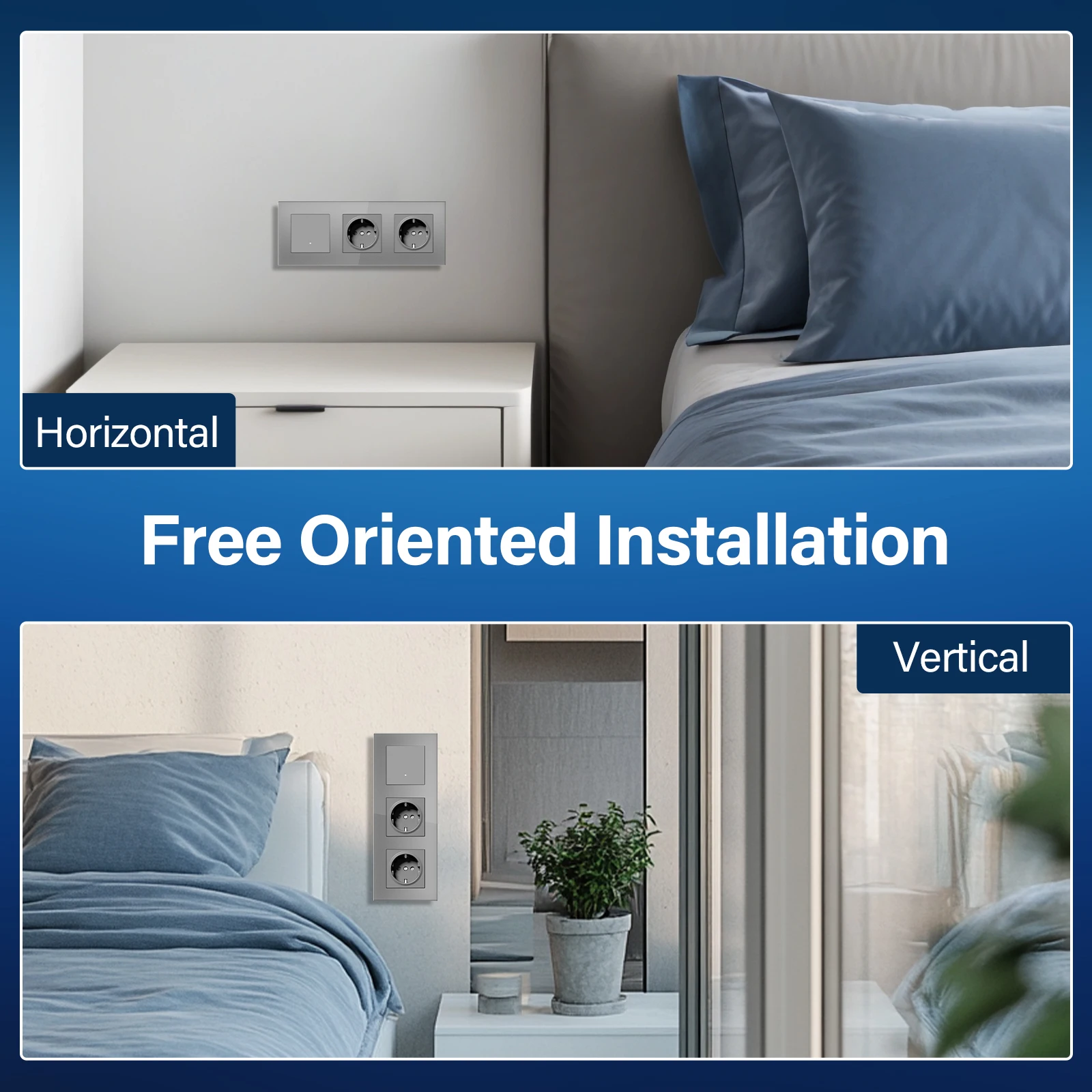 JHJCH ผนังแก้วคริสตัลแผงปลั๊กไฟถูกต่อสายดิน, 16a ปลั๊กไฟมาตรฐานยุโรป 86 มม. * 86 มม.