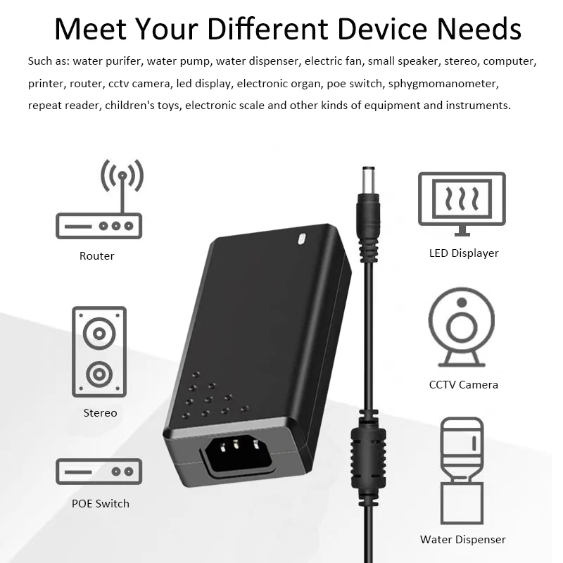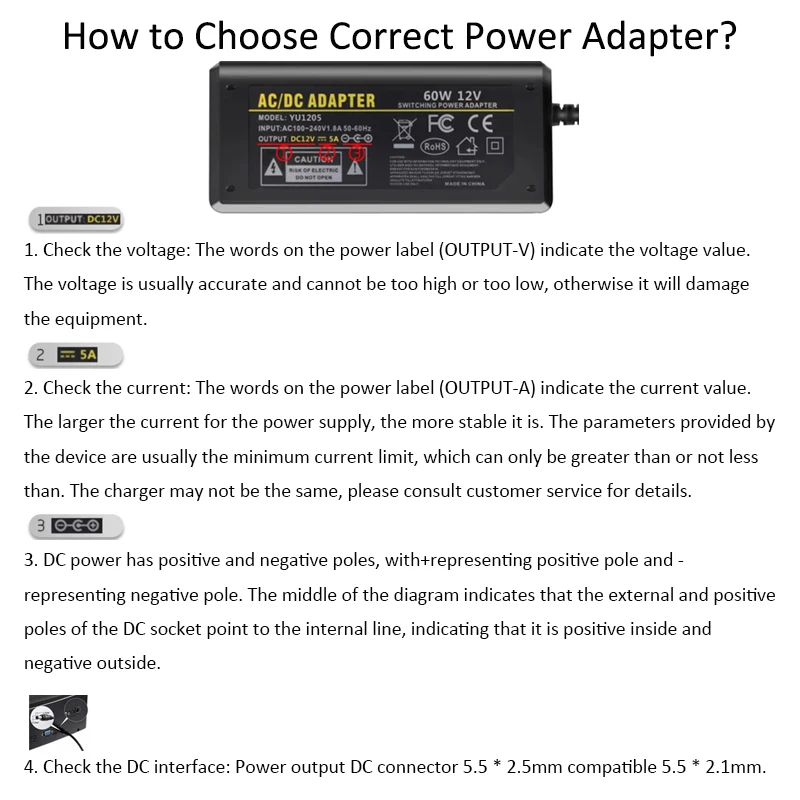 1.ขั้นแรก ให้ยืนยันแรงดันไฟฟ้าและกระแสไฟฟ้าของอุปกรณ์ของคุณ และตรวจสอบแรงดันไฟฟ้า (V) และกระแสไฟฟ้า (A) ของอะแดปเตอร์จ่ายไฟเดิมของอุปกรณ์ของคุณ