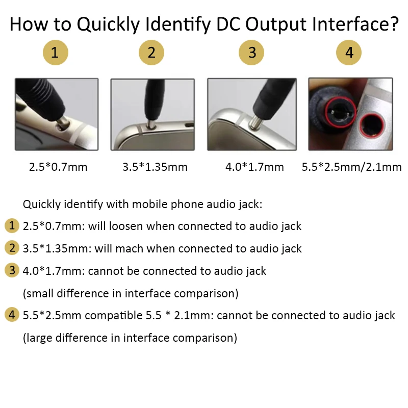 2.จากนั้นยืนยันอินเทอร์เฟซอุปกรณ์ของคุณและตรวจสอบรูปร่างและขนาดของอินเทอร์เฟซอินเทอร์เฟซ DC มาตรฐานทั่วไปคือ 5.5 มม. * 2.5 มม. เข้ากันได้กับ 5.5 มม. * 2.1 มม.หากคุณต้องการข้อกำหนดอื่น ๆ โปรดติดต่อเราได้เลย