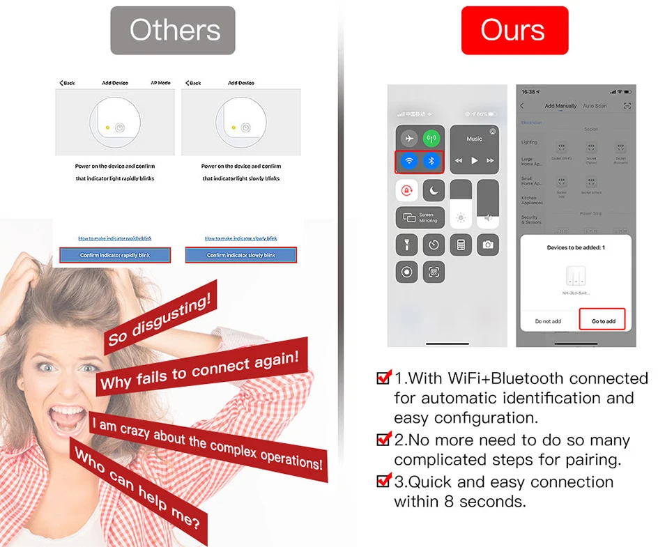 5.ต้องใช้ลวดเป็นกลาง รองรับเครือข่าย 2.4 GHz เท่านั้น ให้การจับคู่ที่ง่ายขึ้นผ่านการเชื่อมต่อ WiFi และ Bluetooth