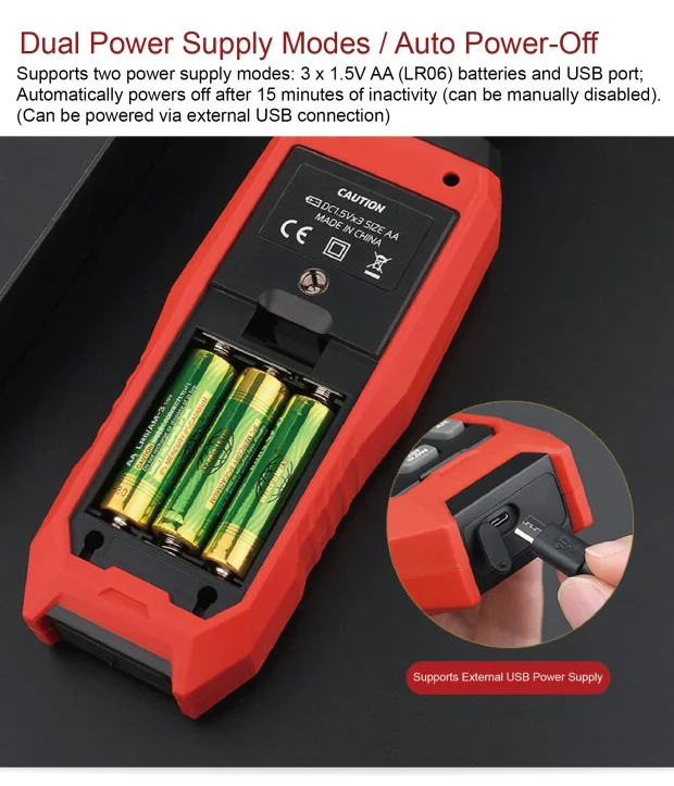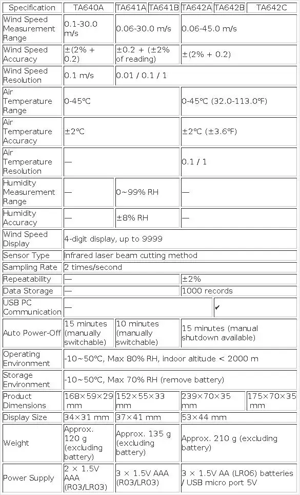 TA642A / B / C: แบตเตอรี่ AA ขนาด 3 × หรือใช้พลังงานผ่านอินเทอร์เฟซ USB Micro 5V