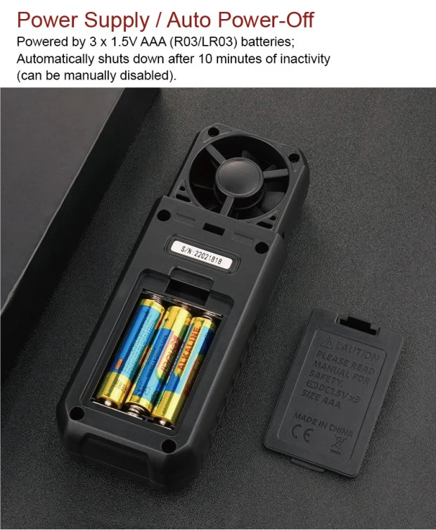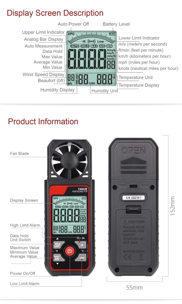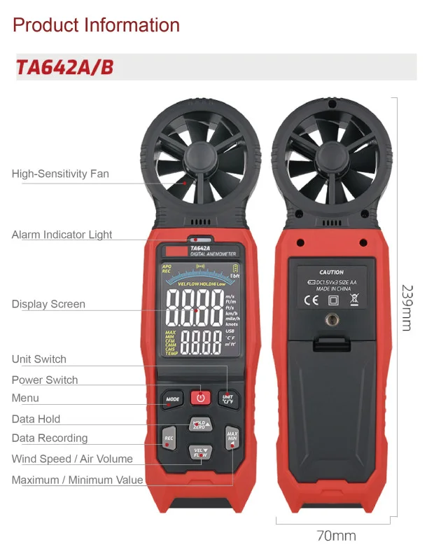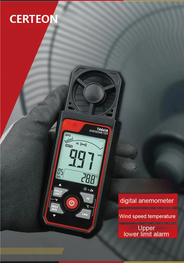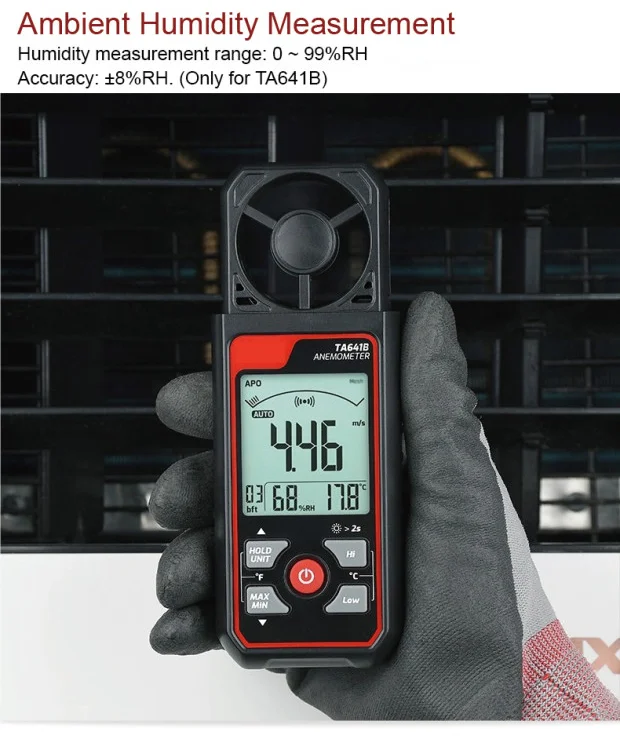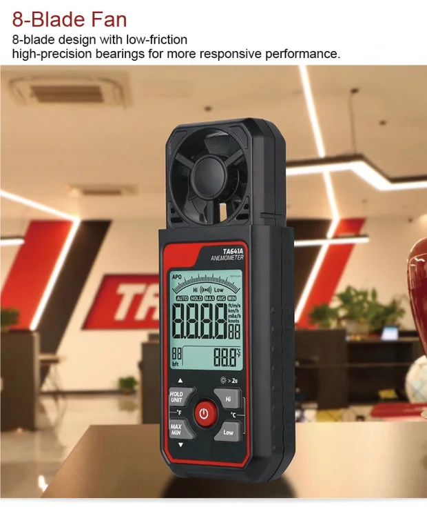 TA641B: ความเร็วลม / อุณหภูมิลม + สัญญาณเตือนไฟหน้าจอ + ความชื้น