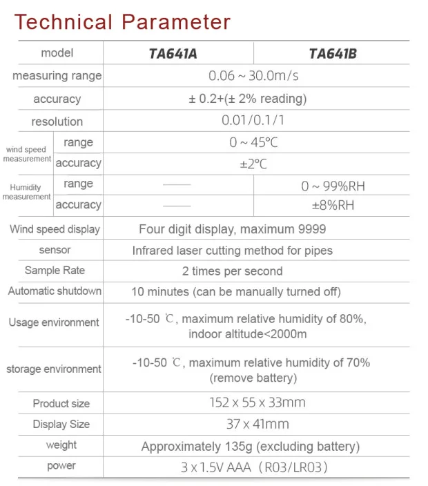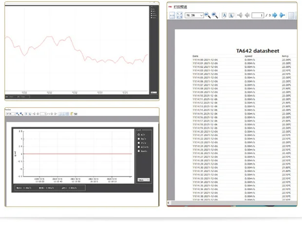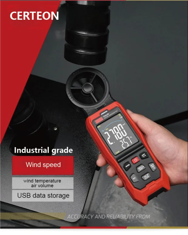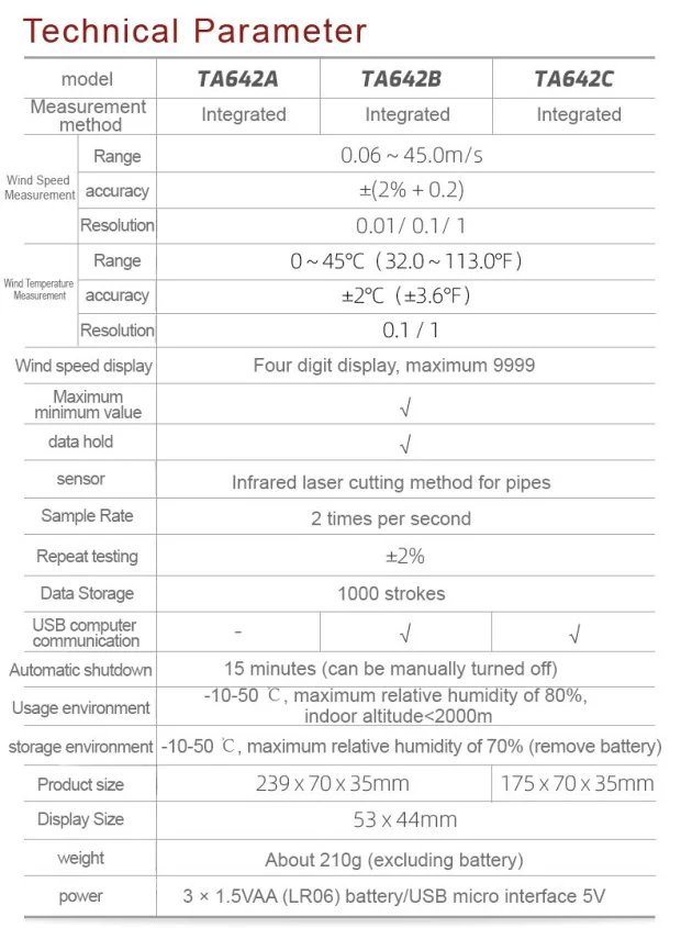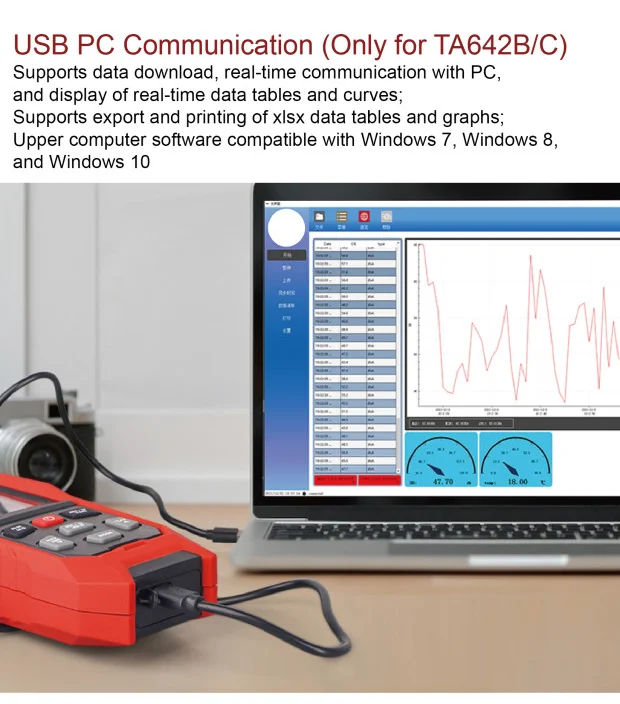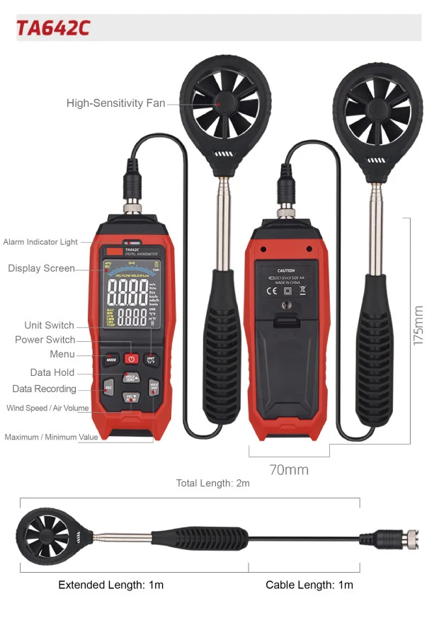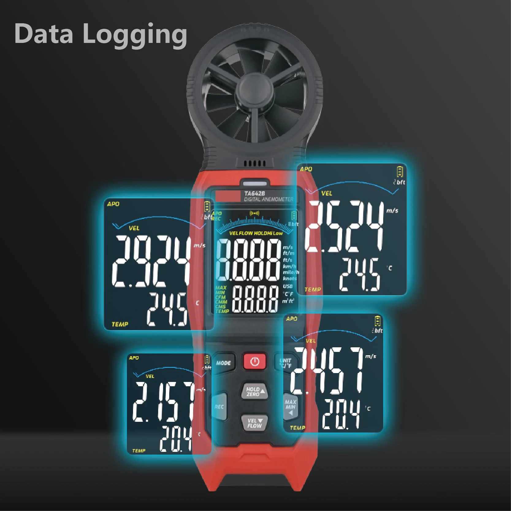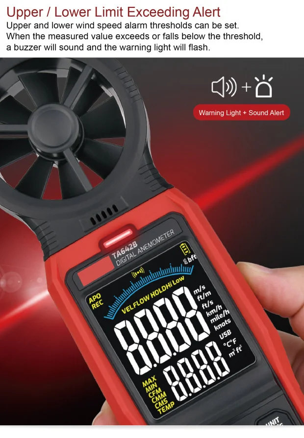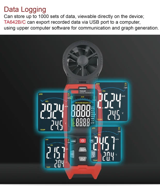 TA642B: ความเร็วลม / อุณหภูมิลม / ปริมาณลม + สัญญาณเตือนด้วยเสียงและภาพ + การสื่อสาร USB + การจัดเก็บชุดข้อมูล 1,000 ชุด