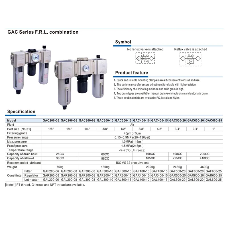 Airtac นิวเมติกควบคุมความดันกรอง GAC20006/30008/40010/15/600C-20/25S Air Source Processor
