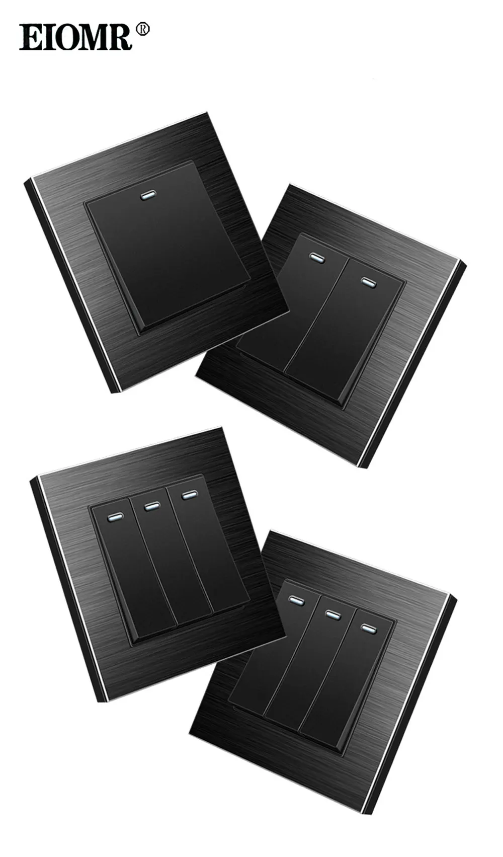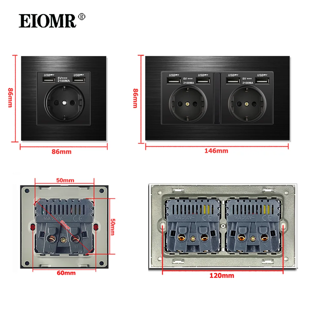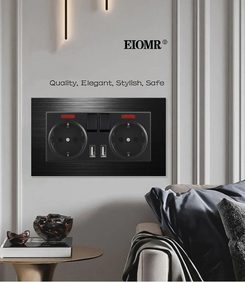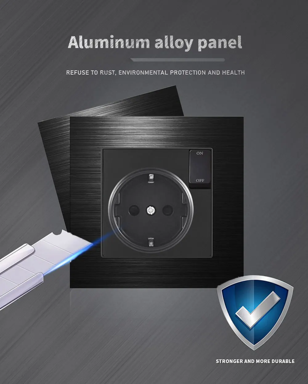 Eiomr 16A สวิตช์ STOP kontak listrik มาตรฐาน EU ขนาด86มม. และ146มม. แผงระบายอลูมิเนียมสีดำสำหรับเครื่องใช้ในบ้าน