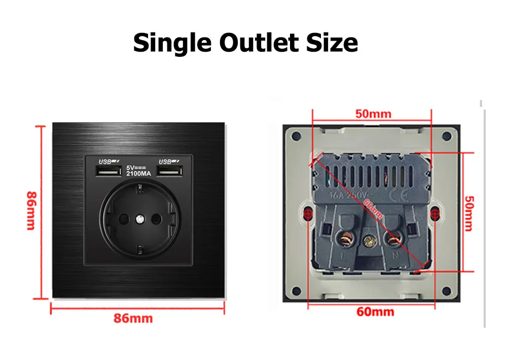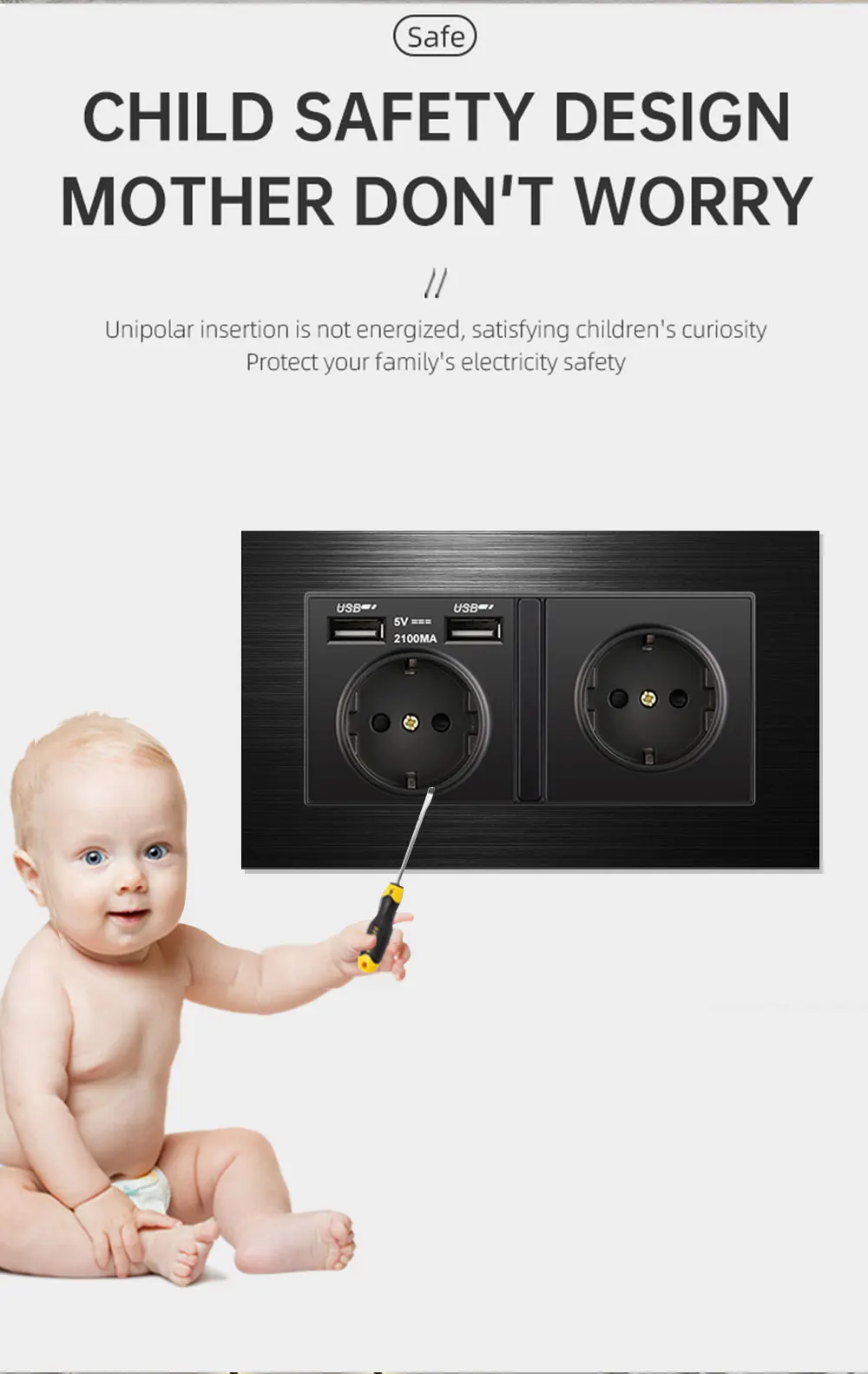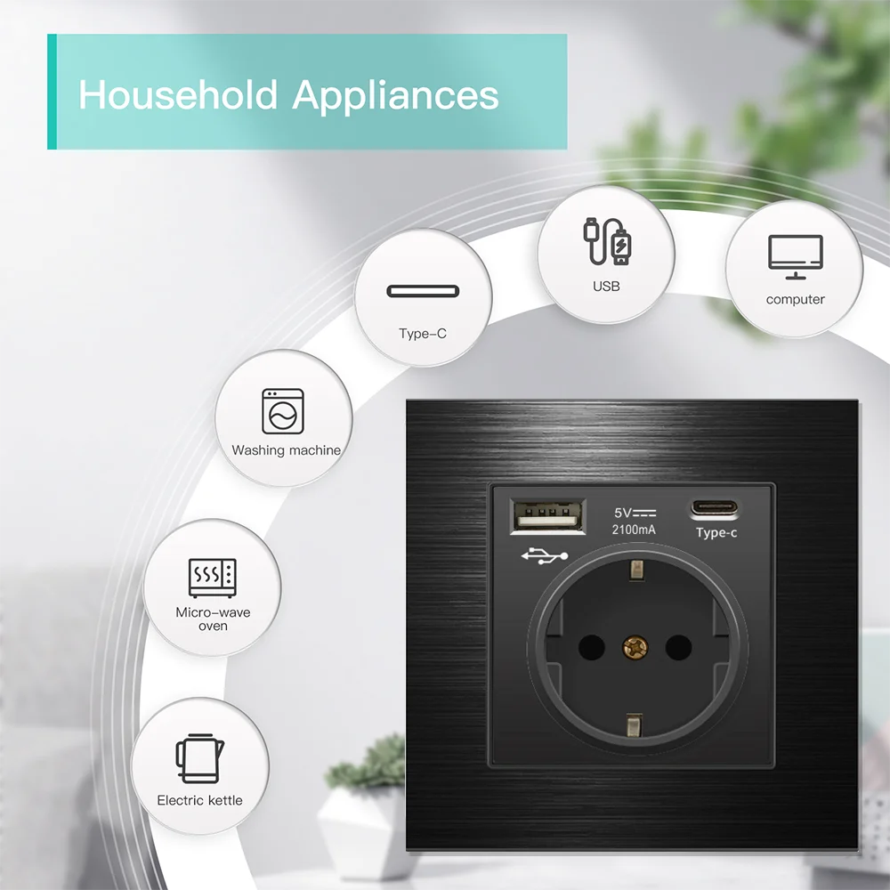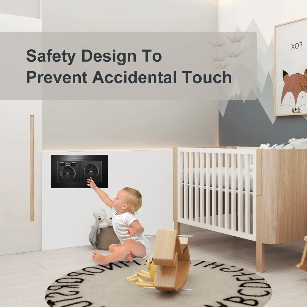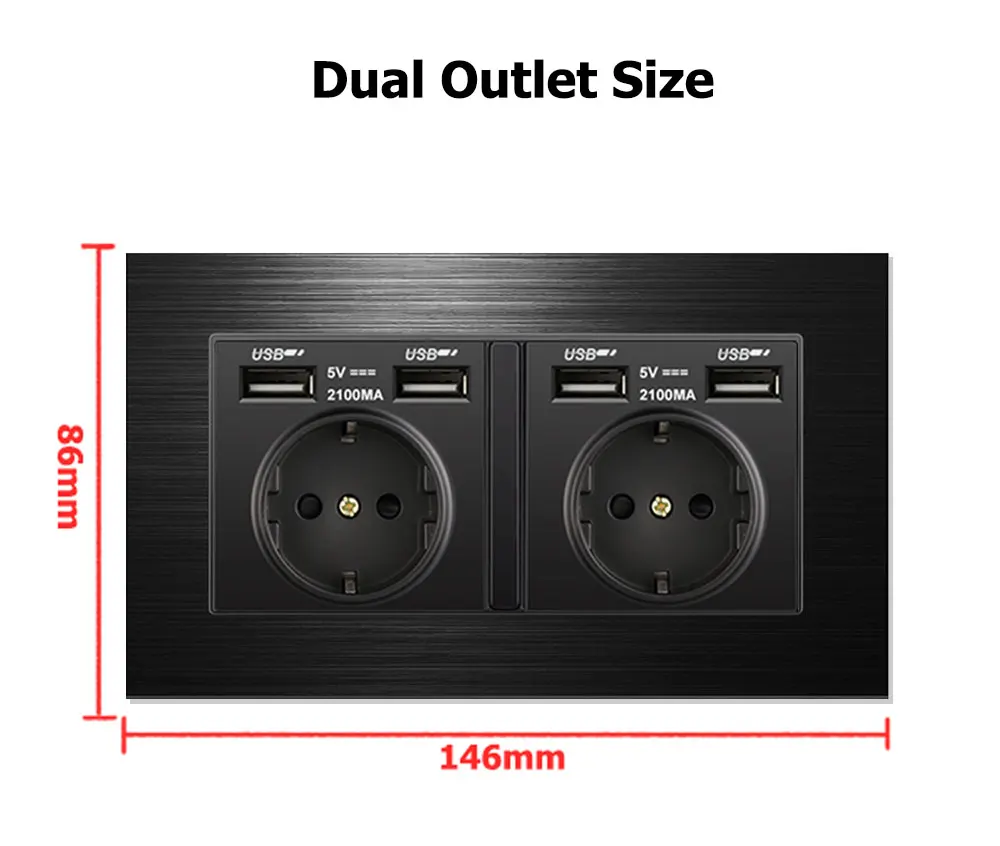 ผนังสีดําฝังสารหน่วงไฟพร้อม Ground 250V แผงอะคริลิค EU มาตรฐานปลั๊กไฟฟ้าคลาสสิก USB Power Sockets 250V