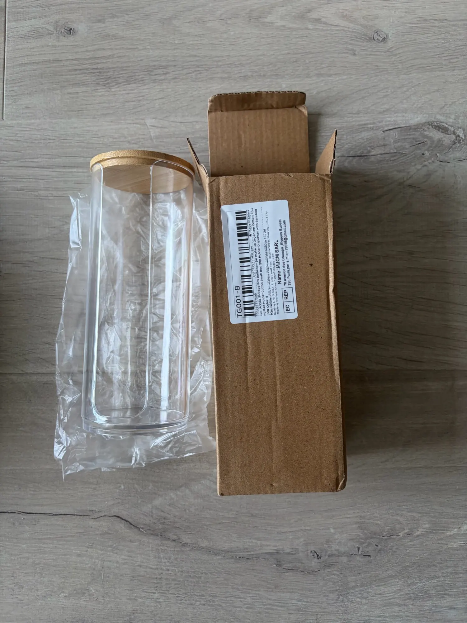 กล่องเก็บของอะคริลิคห้องน้ํา Jar แต่งหน้าผ้าฝ้ายรอบผู้ถือผ้าฝ้าย Swab กล่อง Qtip ผู้ถือพร้อมฝาปิดไม้ไผ่ จาก 1 รีวิว