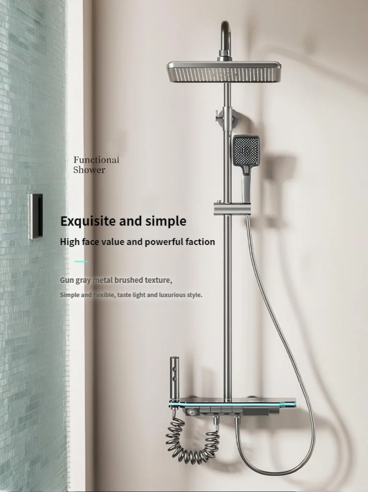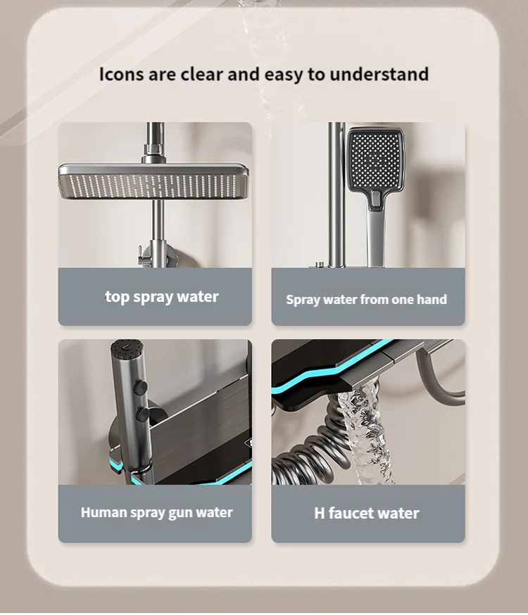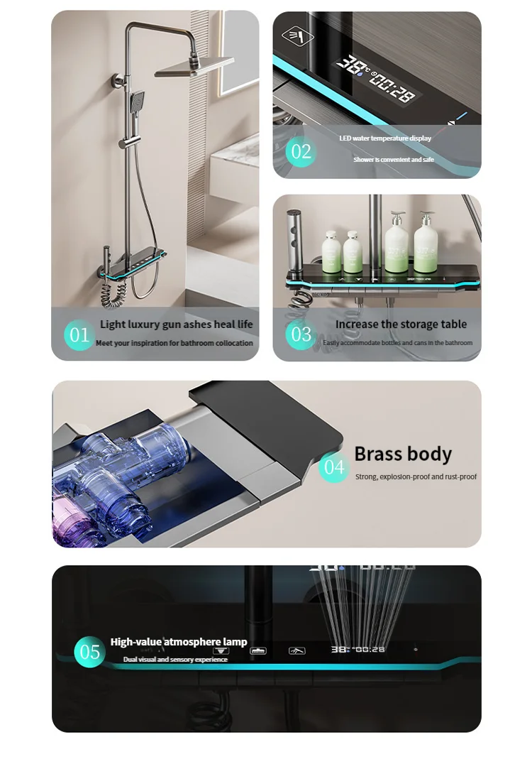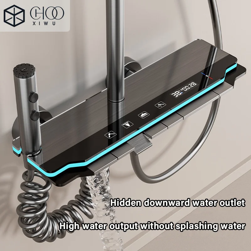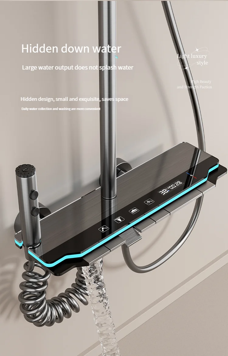 ห้องน้ําติดผนังคีย์เปียโน 4 วิธี Outlet Rainlfall หรูหราชุดฝักบัวสมาร์ทจอแสดงผลอุณหภูมิก๊อกน้ําระบบ