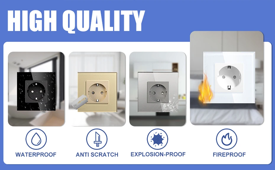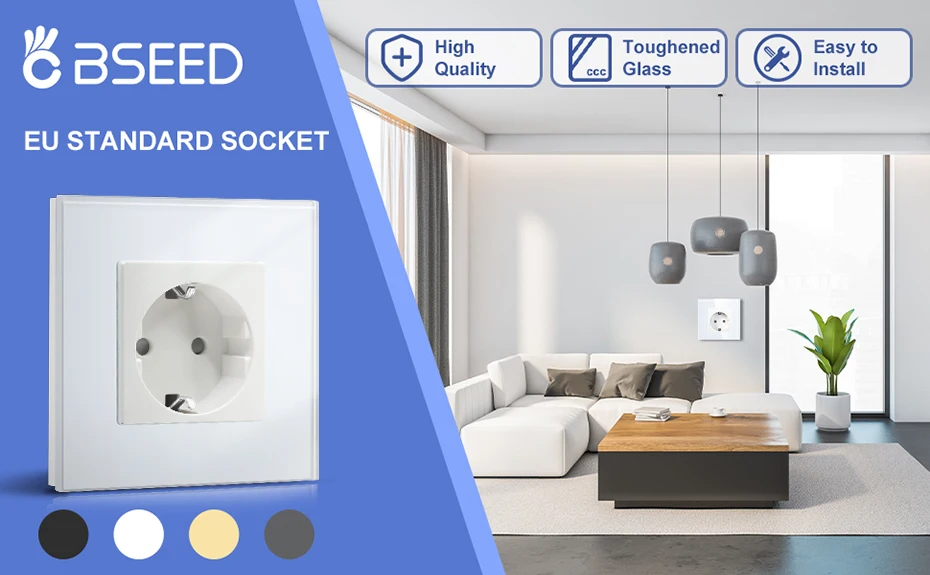BSEED ซ็อกเก็ต EU เดี่ยวปลั๊กไฟคู่ซ็อกเก็ตไฟฟ้าสามช่องซ็อกเก็ตผนังแก้วคริสตัลสีขาวสีดําทองสีเทา 16A