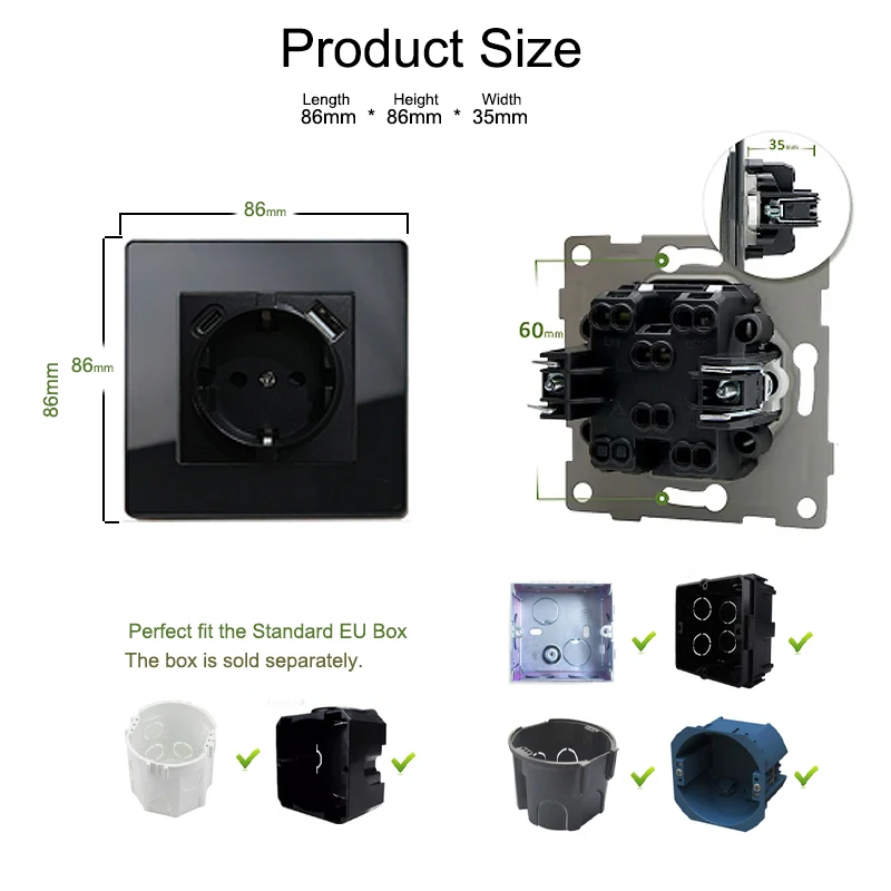 ซ็อกเก็ตไฟผนังยูโรแก้วสีดํา 16A 220V พร้อมมาตรฐาน EU เยอรมันรัสเซียด้านหลังแบบกลมเข้ากันได้สําหรับการปรับปรุงบ้าน