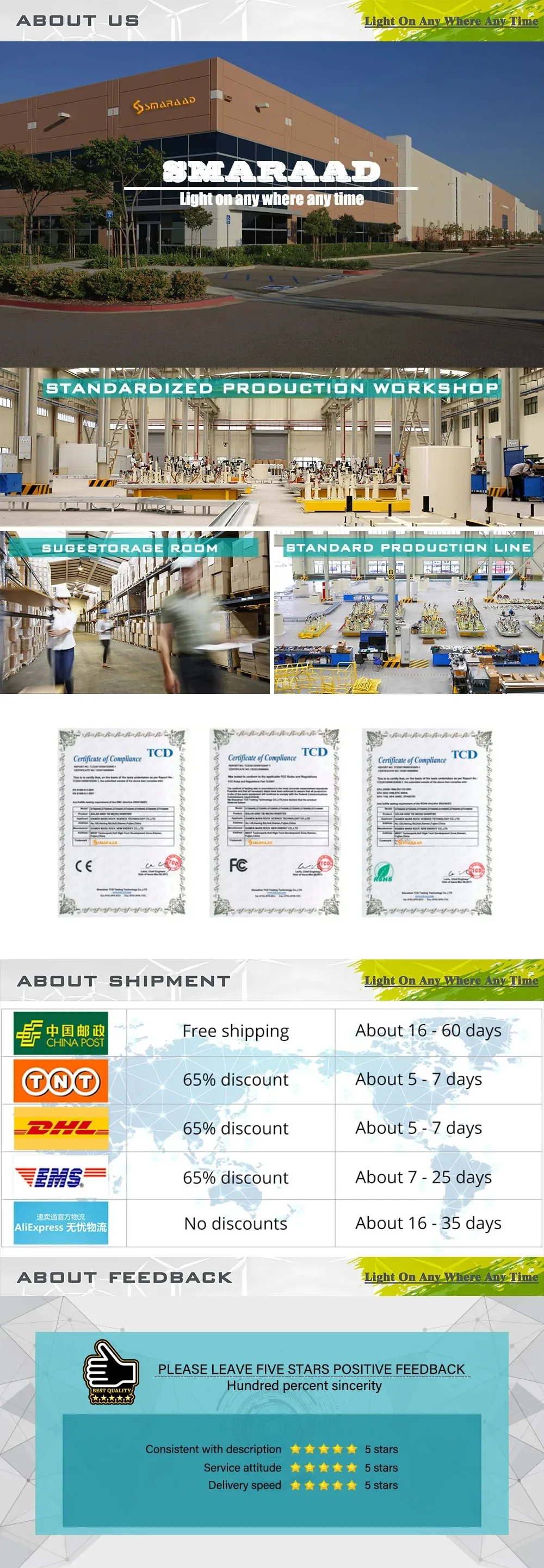 ความคิดเห็นเชิงบวกของคุณคือแรงผลักดันในการปรับปรุงอย่างต่อเนื่องของเรา เราเคารพและไว้วางใจลูกค้าทุกคนในการจัดหาผลิตภัณฑ์และบริการที่มีคุณสมบัติเหมาะสมแก่คุณ หากคุณพอใจกับผลิตภัณฑ์ของเรา โปรดให้ข้อเสนอแนะเชิงบวกระดับห้าดาวแก่เรา หากคุณมีคำถามหรือปัญหาใด ๆ หลังจากได้รับสินค้า กรุณาติดต่อเราผ่านข้อความใน Ali โดยเร็วที่สุด เราจะพยายามแก้ไขปัญหาให้คุณอย่างเต็มที่และรวดเร็วจนกว่าคุณจะพึงพอใจ ในขณะที่ออกความคิดเห็นเชิงลบจะไม่สามารถแก้ปัญหาใดๆ!