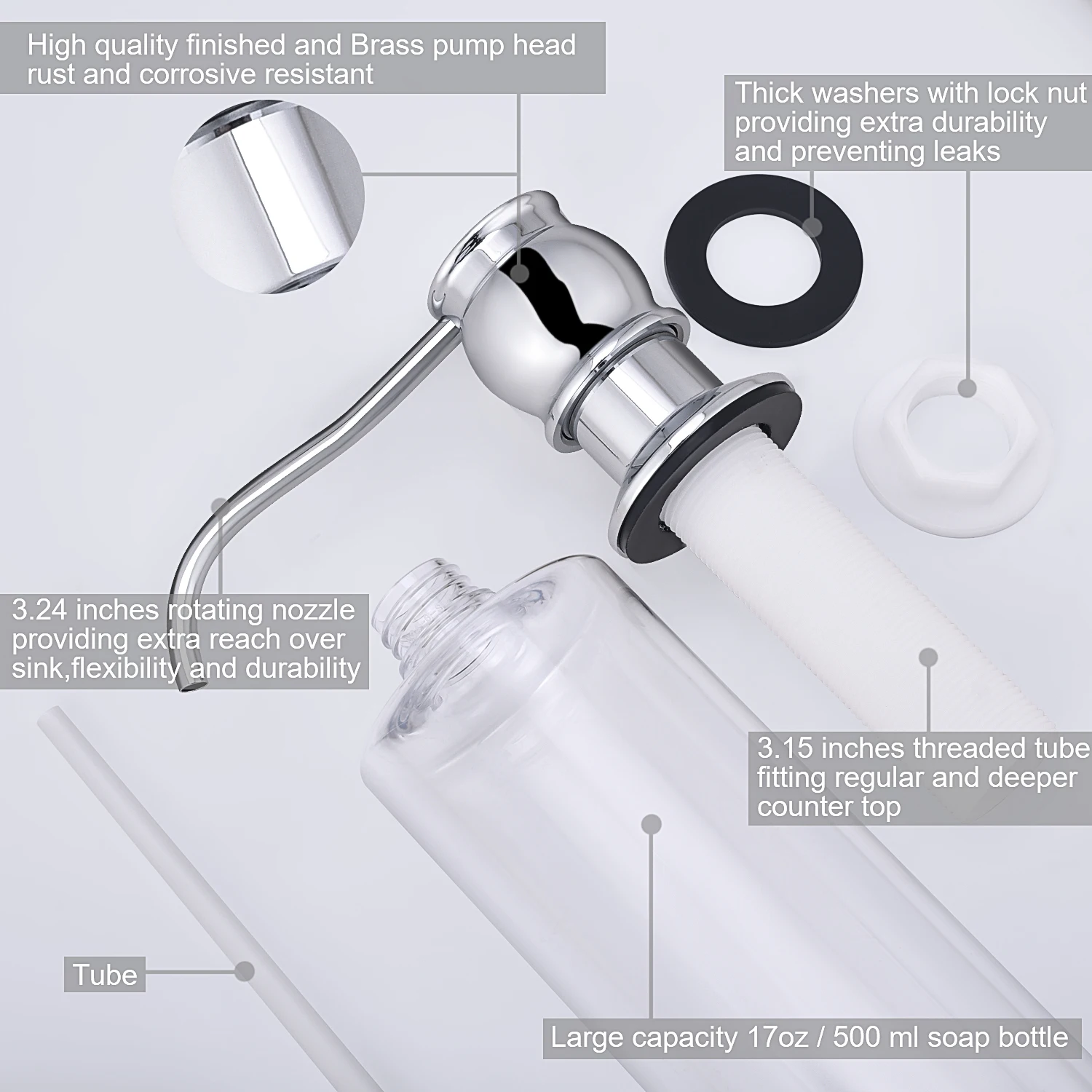 - ก้านยาวเหมาะสําหรับท็อปเคาน์เตอร์หินแกรนิตและการติดตั้งดาดฟ้าลึก ขวดอ่างเก็บน้ํามีความชัดเจนเพื่อให้ดูเนื้อหาได้ง่าย เหมาะสําหรับสบู่เหลว โลชั่น หรือผงซักฟอกเหลว