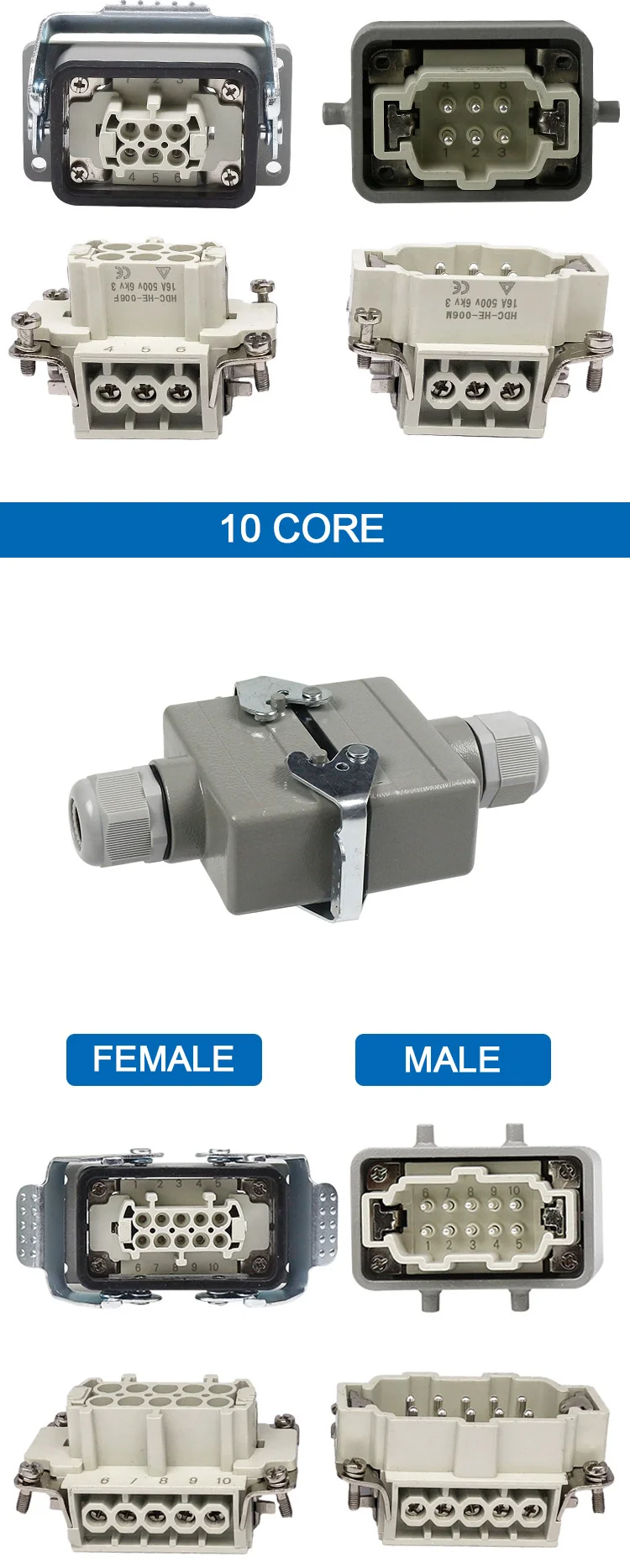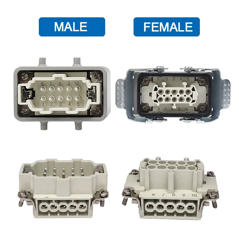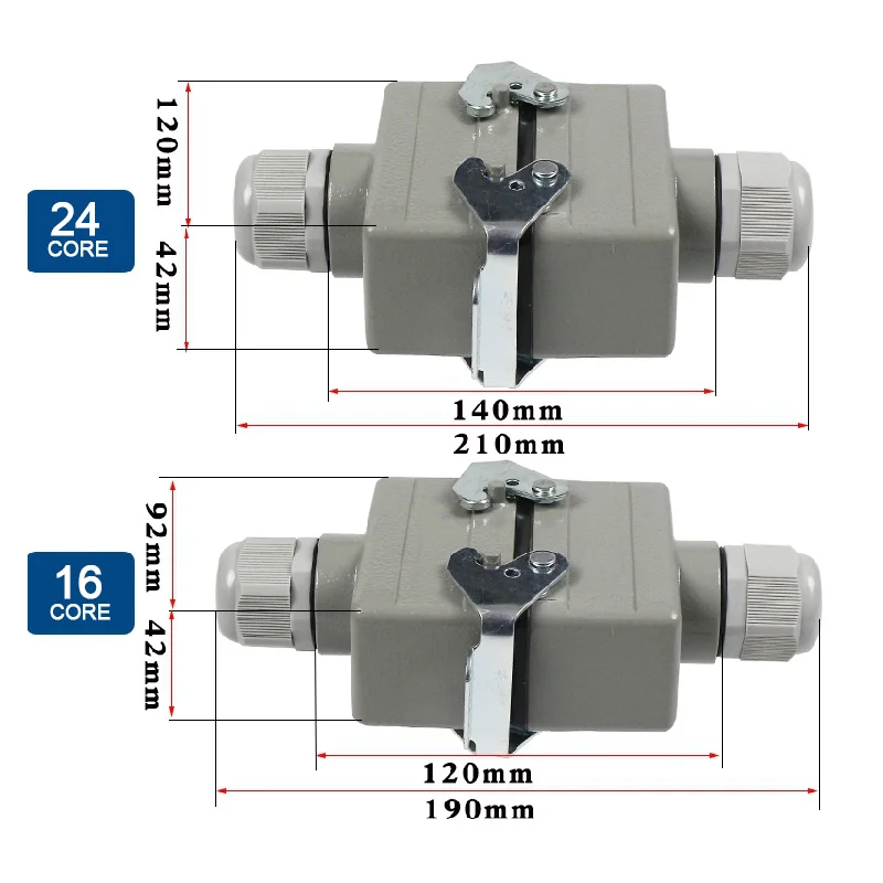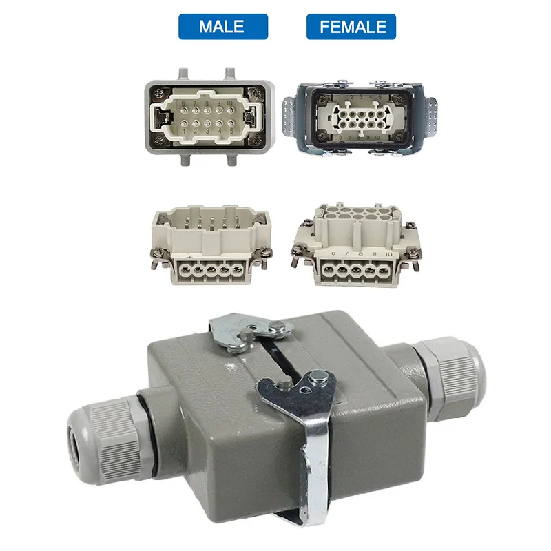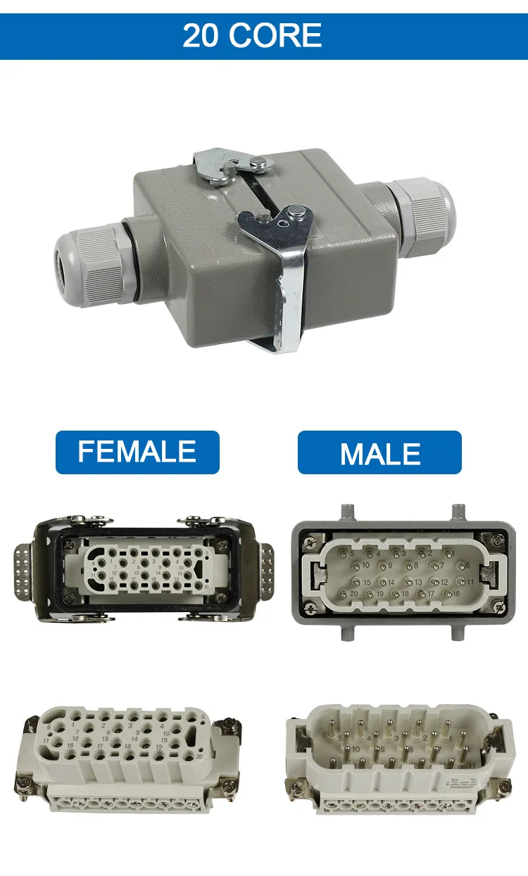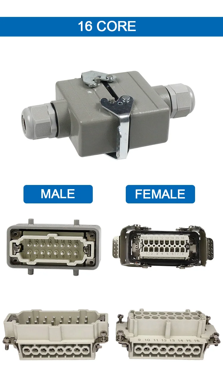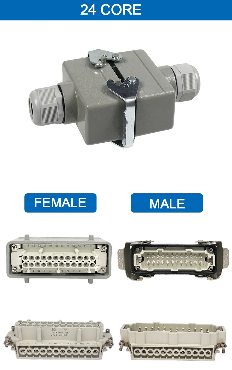 HDC-HE-4/6/10/16/20/24 Core Pins สี่เหลี่ยมผืนผ้า Connector กันน้ำติดตั้งขั้วต่อหลอดไฟ LED สำหรับ Aerospace อุตสาหกรรม16A