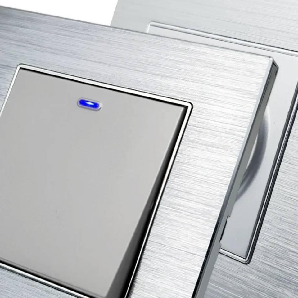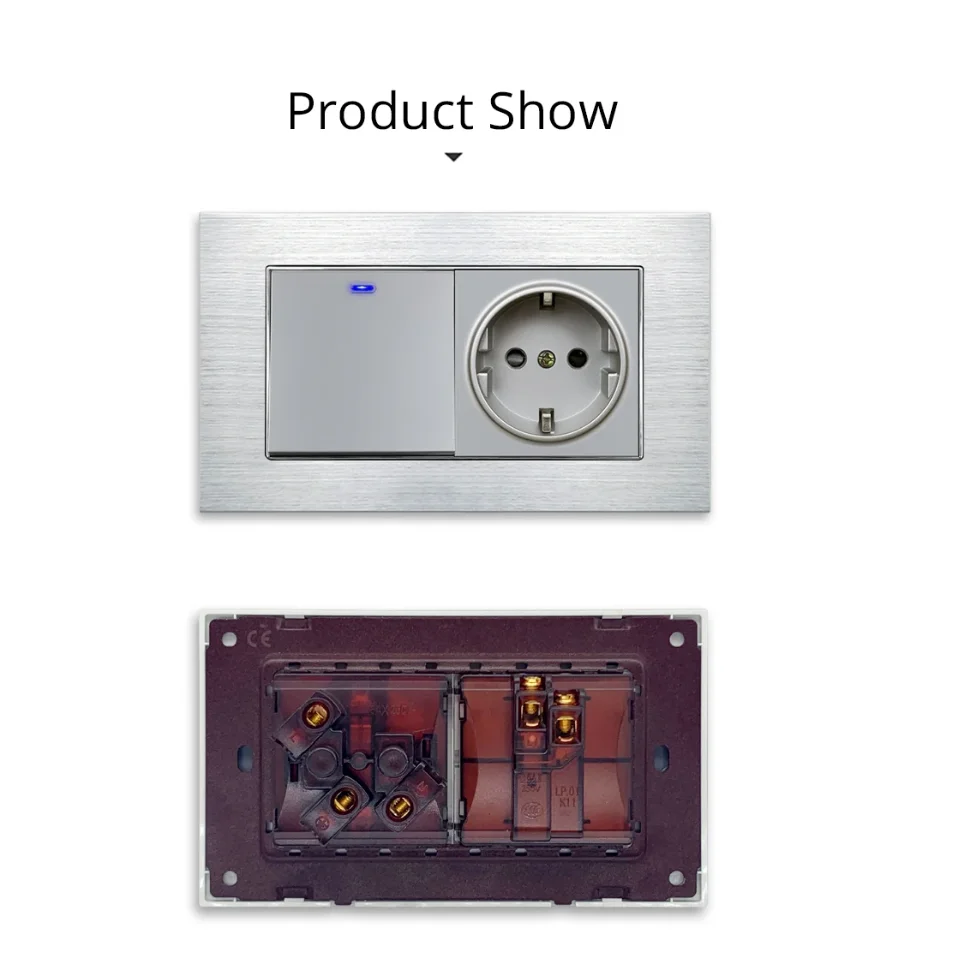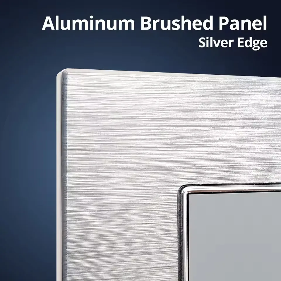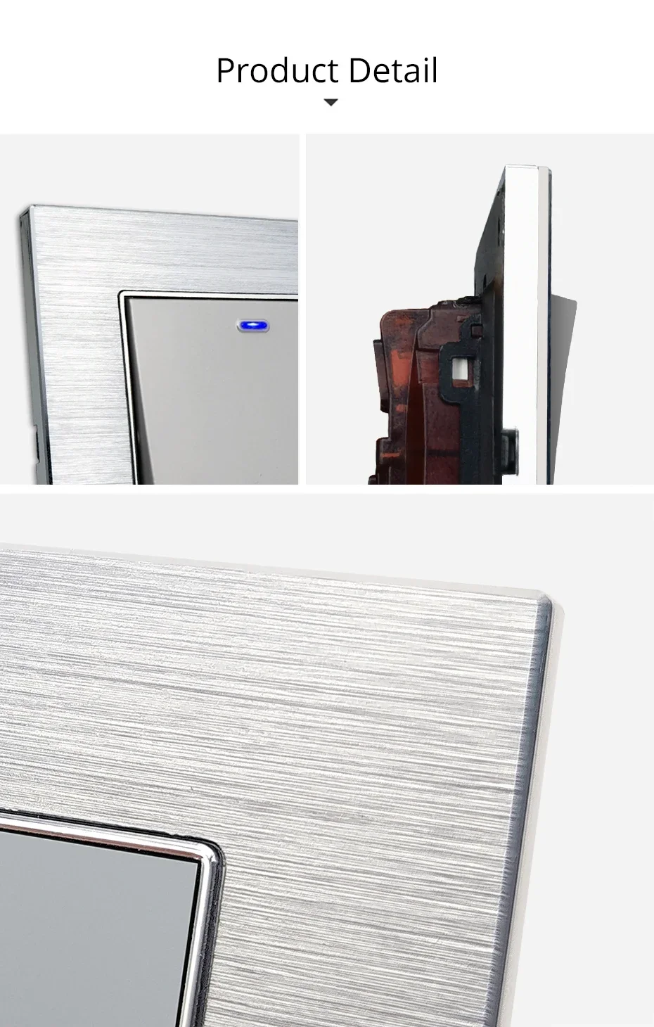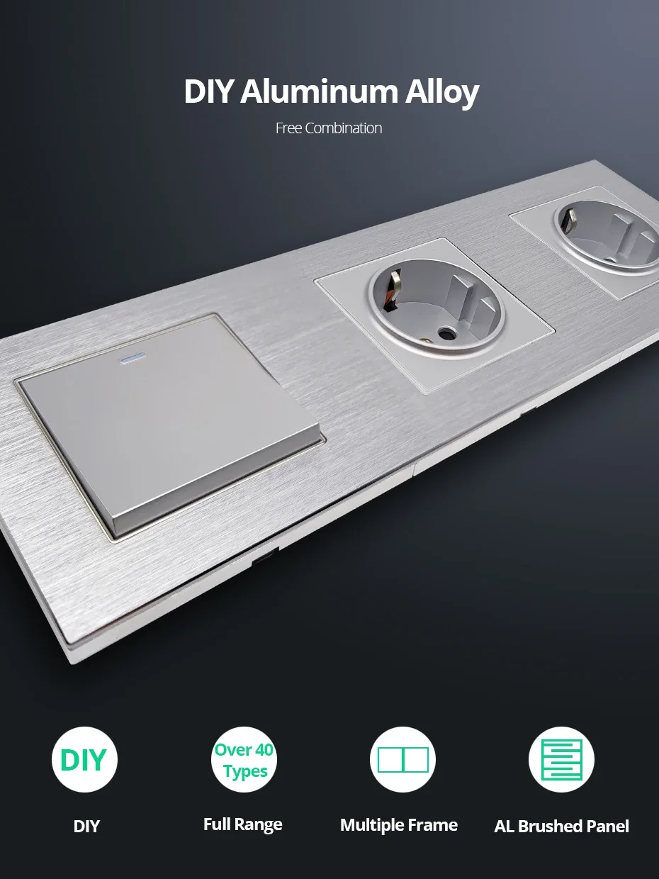 Brushed Silver Push ปุ่มสวิทช์ Illuminated Modular สวิทช์ไฟฟ้าอลูมิเนียมแผ่นสีเทาสวิทช์ภาษาฝรั่งเศสคํายุโรป Wall Socket