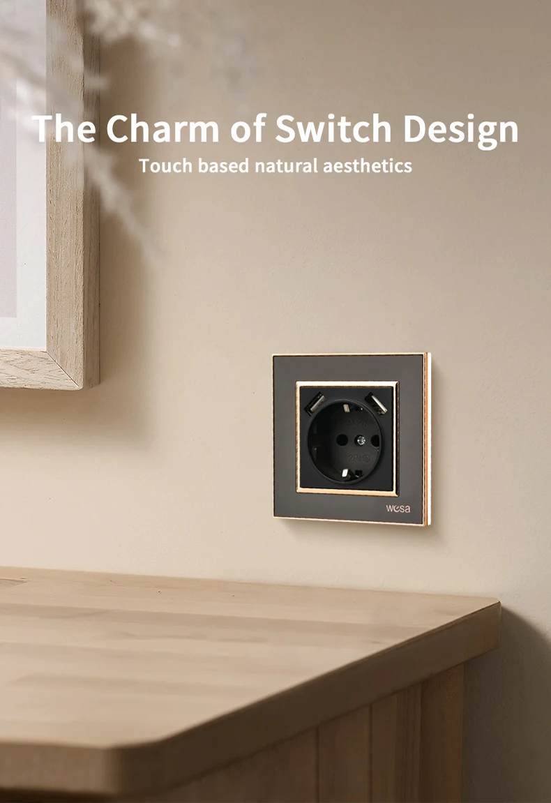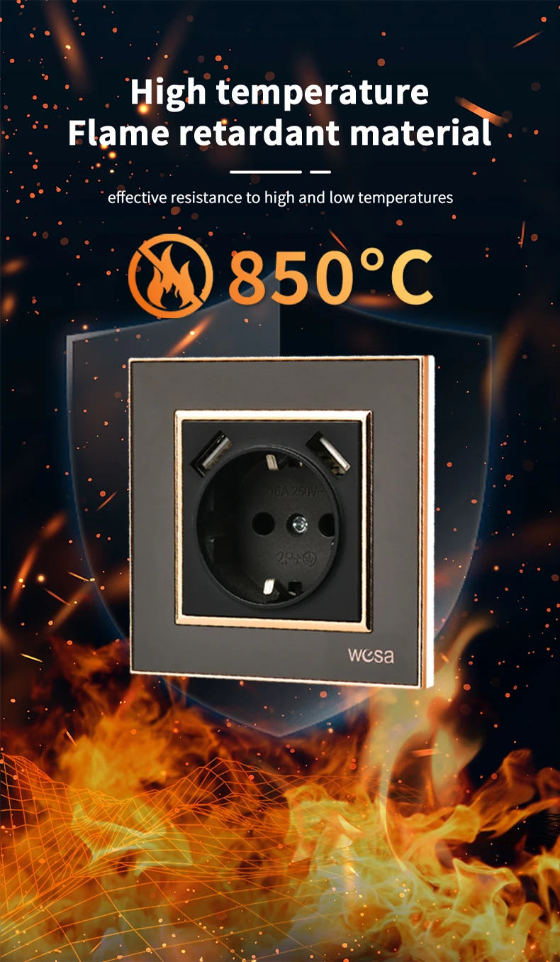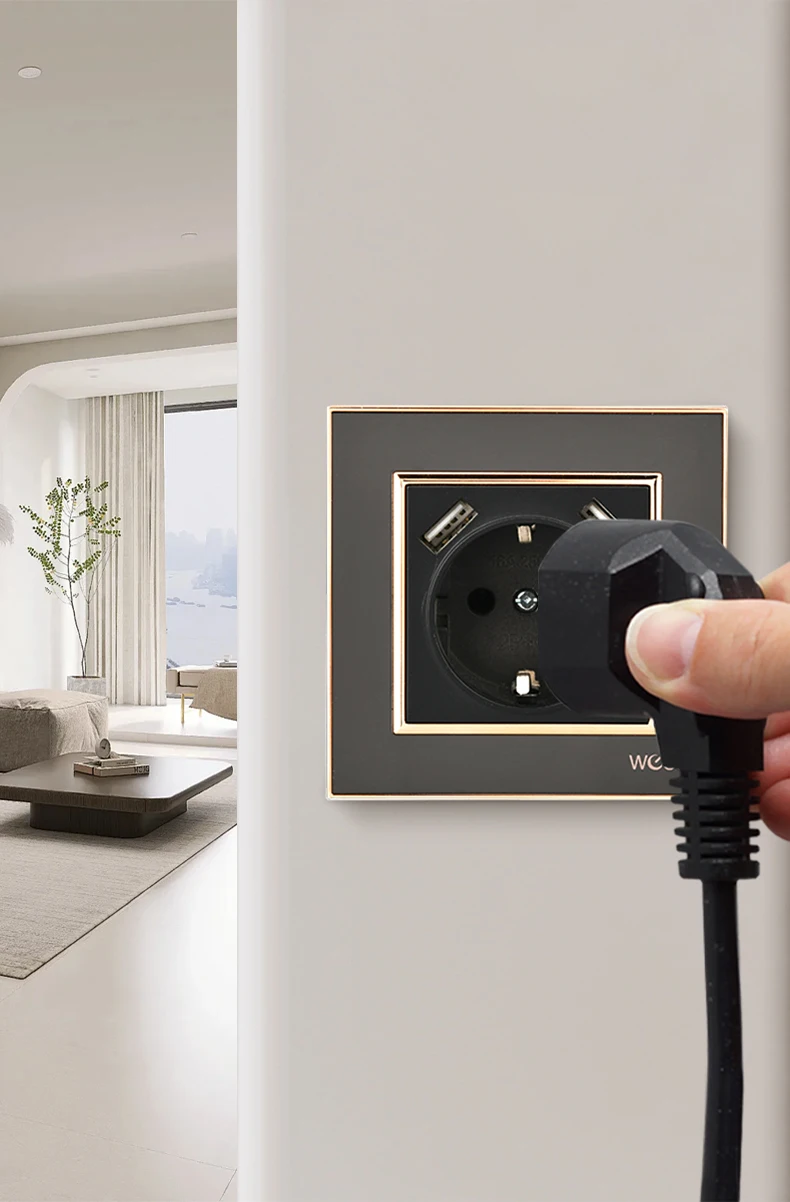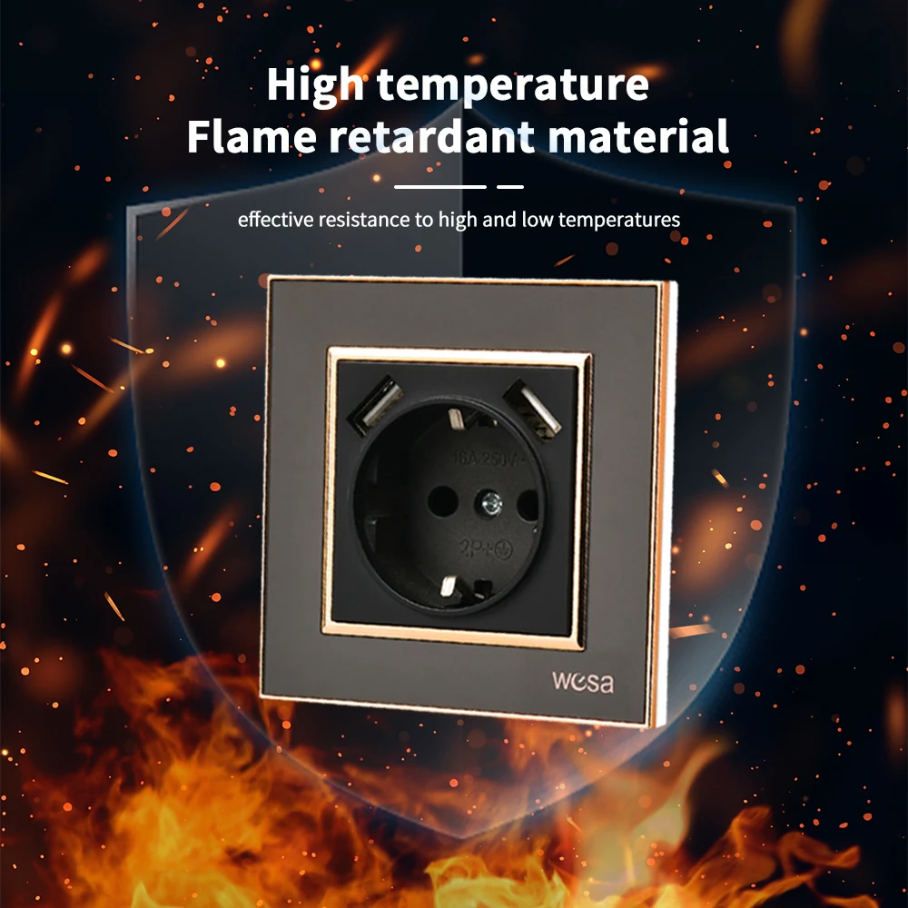 ผนังสีดําฝังสารหน่วงไฟพร้อม Ground 250V แผงอะคริลิค EU มาตรฐานปลั๊กไฟฟ้าคลาสสิก USB Power Sockets 250V
