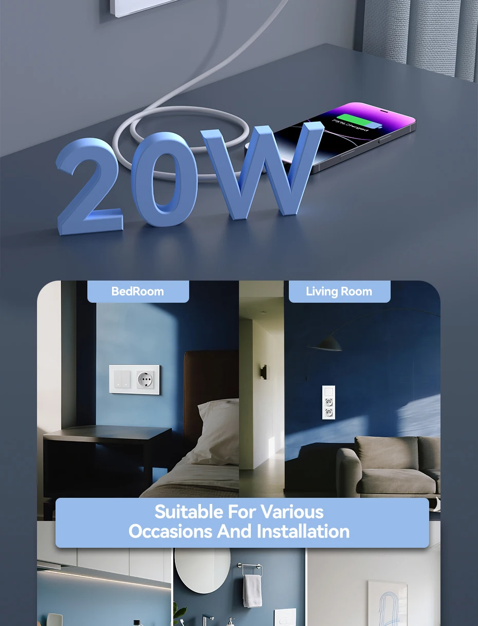 เต้ารับไฟฟ้าติดผนัง PSSRISE US พร้อมพอร์ต USB Type-C ชาร์จเร็ว แบบอเมริกัน เม็กซิโก สีขาว กระจกนิรภัย ปลั๊กไฟสำหรับใช้ในบ้าน
