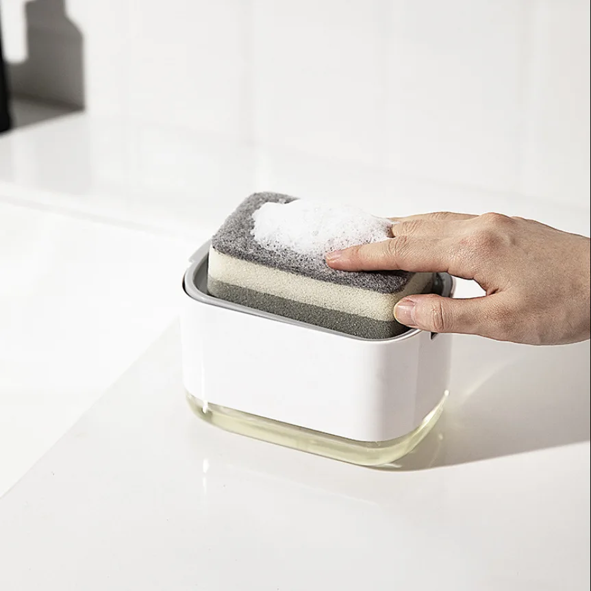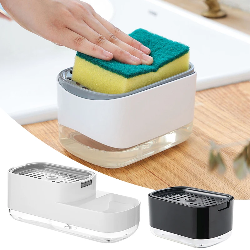 เครื่องจ่ายสบู่เหลวแบบกดพร้อมที่วางฟองน้ำ อุปกรณ์ทำความสะอาดในครัว